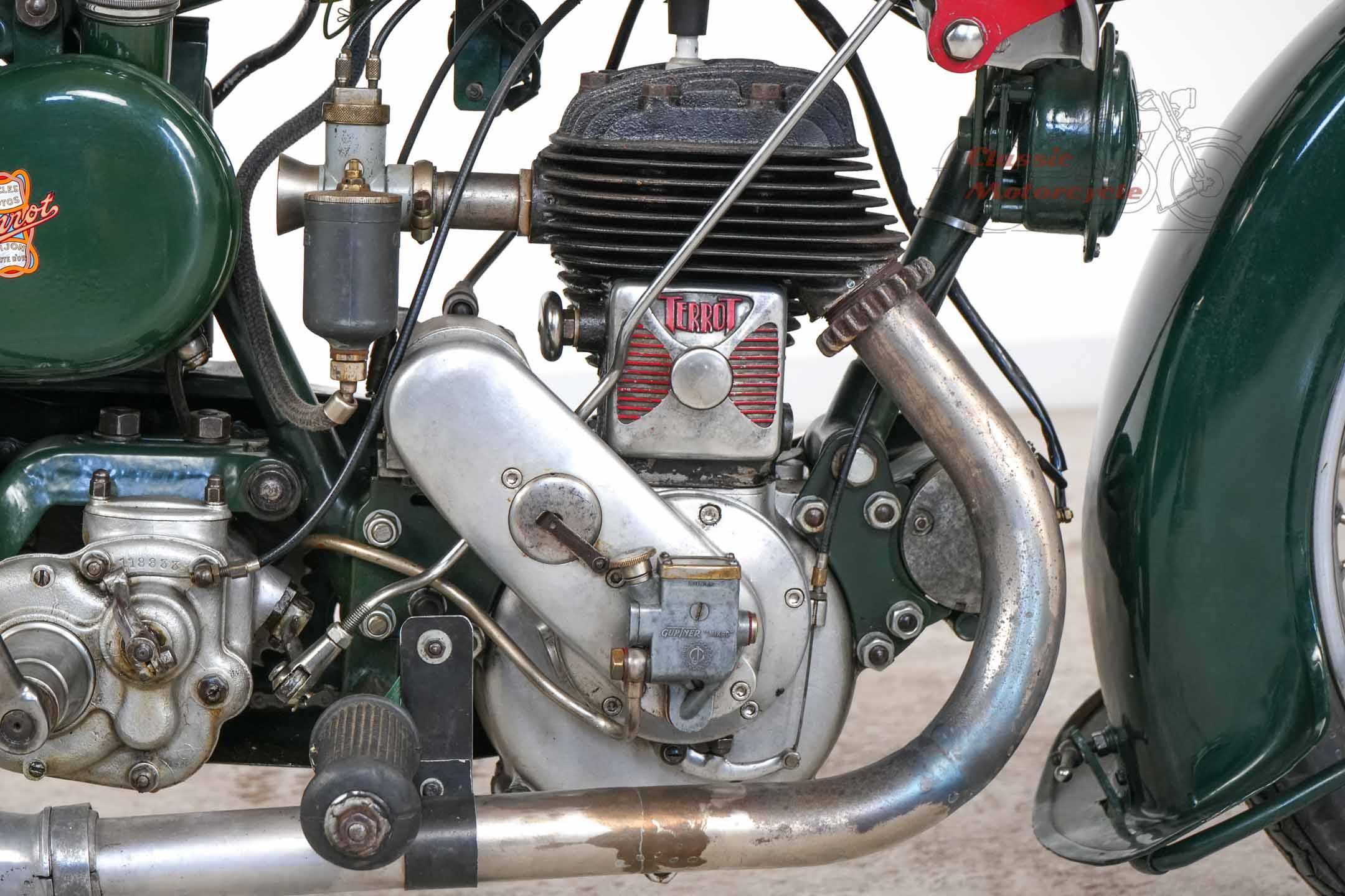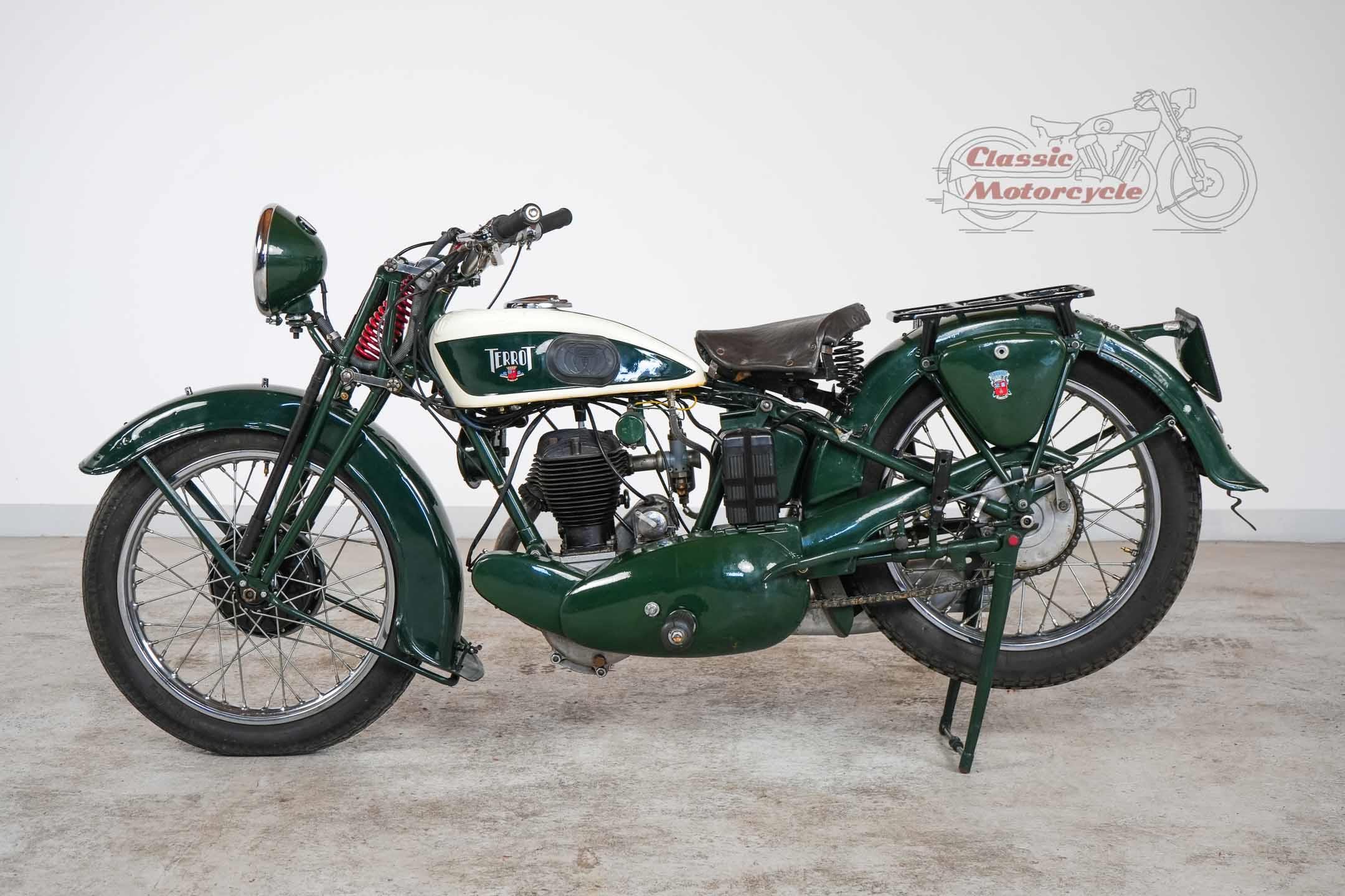 For sale is a well-preserved Terrot HDA from 1938 with a 350cc engine. The motorcycle was last ridden about a year ago and has been stored dry ever since.