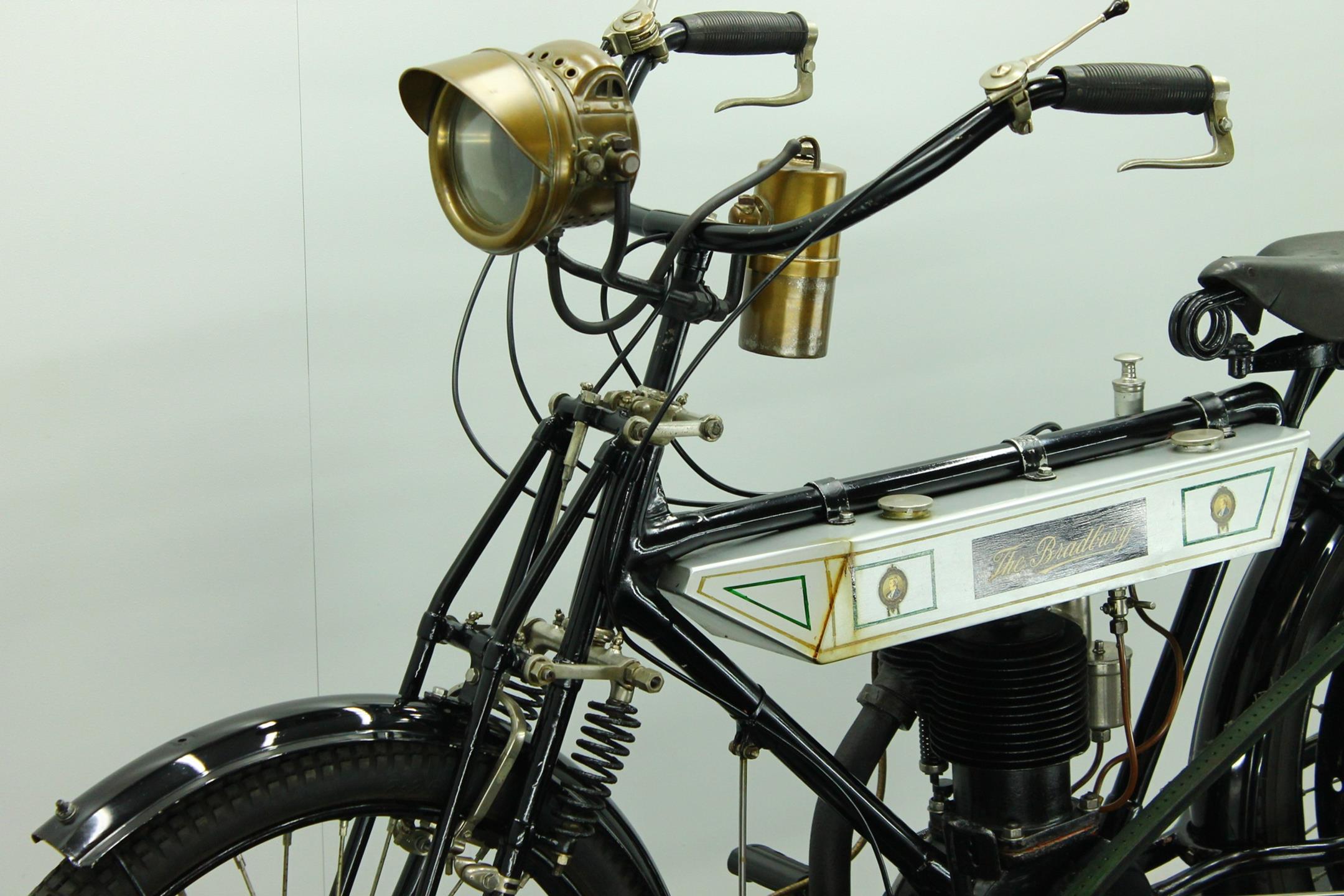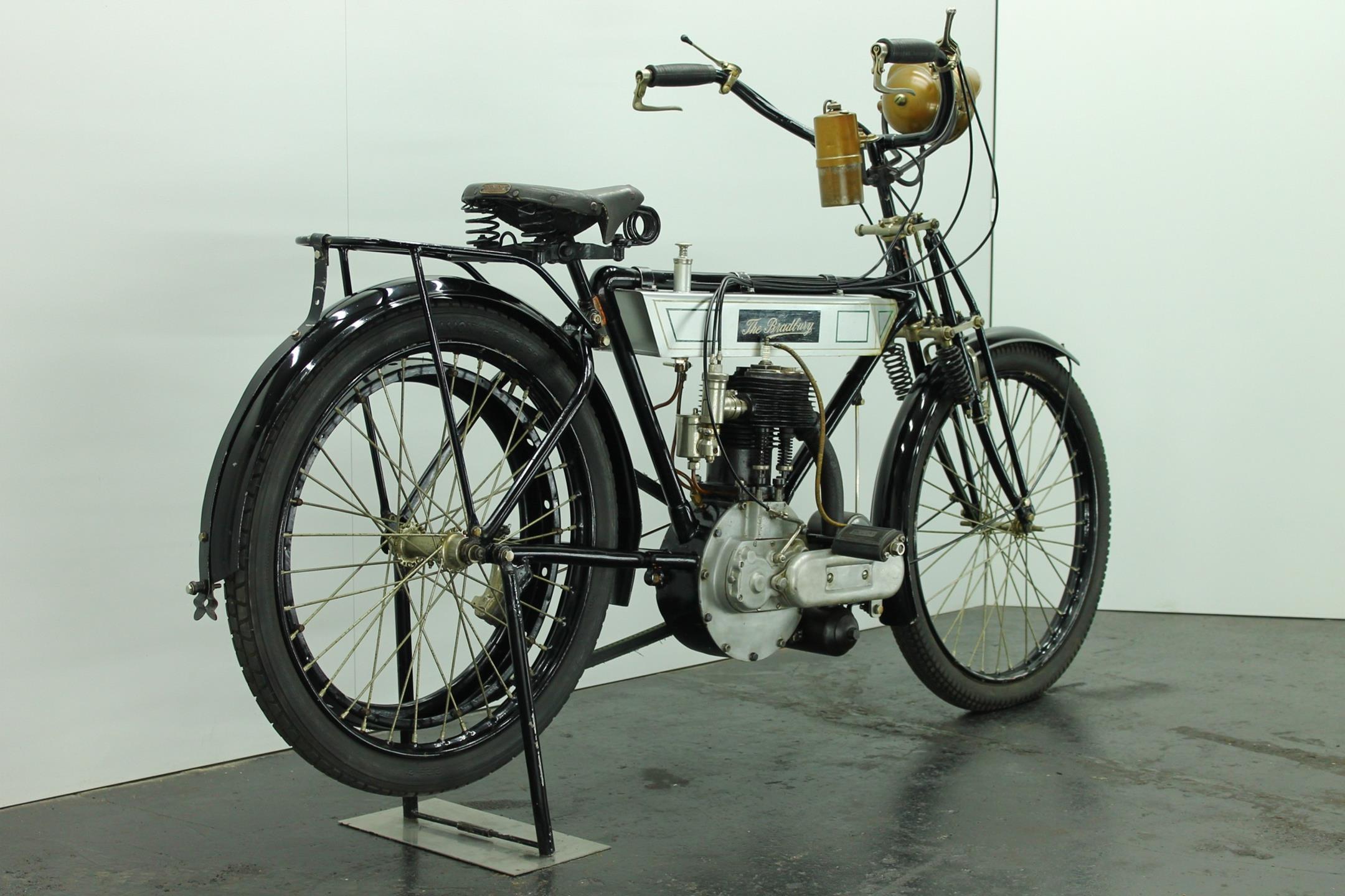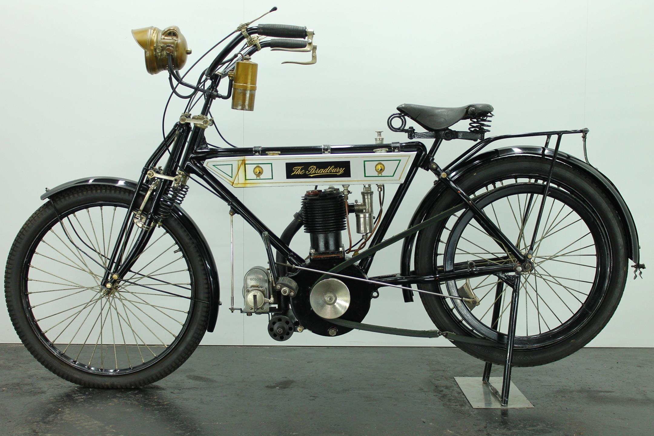 Bradbury & Co Ltd was founded in 1862. It was UK’s first and largest sewing machine manufacturer but Bradbury & Co. of Oldham started in 1852 as Britain’s and Europe’s first sewing machine manufacturer. The company then manufactured bicycles from 1895, and its first motorcycles were produced in 1902 as bicycles with clip-on Minerva engines. In the early 1900s diversified into making other things. These included prams, bicycles and eventually motorcycles. The company later produced single-cylinder, V-twin and horizontally-opposed-twin motorcycles. The main stay of the Bradbury motor cycle range was the 3½ h.p. single cylinder machine introduced in 1909. Year by year the models were improved: by 1908 both valves were mechanically operated, by 1910 the crankcase ran on ball bearings. In 1910 the Company announced that it had made considerable improvements in detail, finish and fittings to the 1909 Model and in 1911 the Company produced two versions - the Standard Model and the Speed Model.The only differences between the 1911 3 ½ h.p. Standard Model and that of the previous year were both wheels were fitted with Dunlop Rubber studded non skid tyres and the saddle was change to Brooks' B 104/4 padded. In 1912 the 3½hp Bradbury employed a single-cylinder sidevalve engine of 554cc and could be ordered in single-gear belt-driven form or with the refinements of hub gears and chain drive. Perhaps the model's most unusual feature was a crankcase integral with the frame 'ensuring better balance, greater strength and rigidity'. The 1912 Bradbury motorcycles were one of the earliest with variable gearing. Although the factory survived the First World War it closed in 1924.