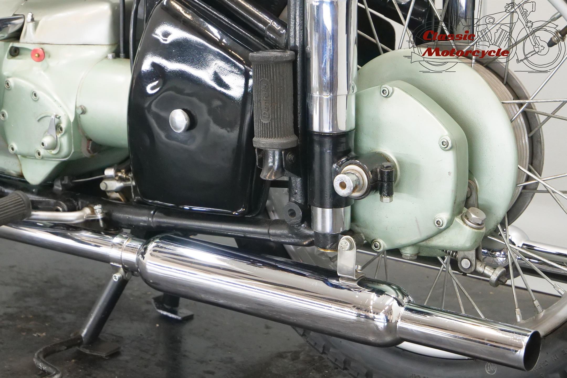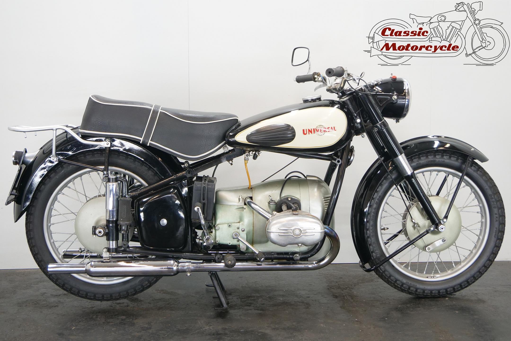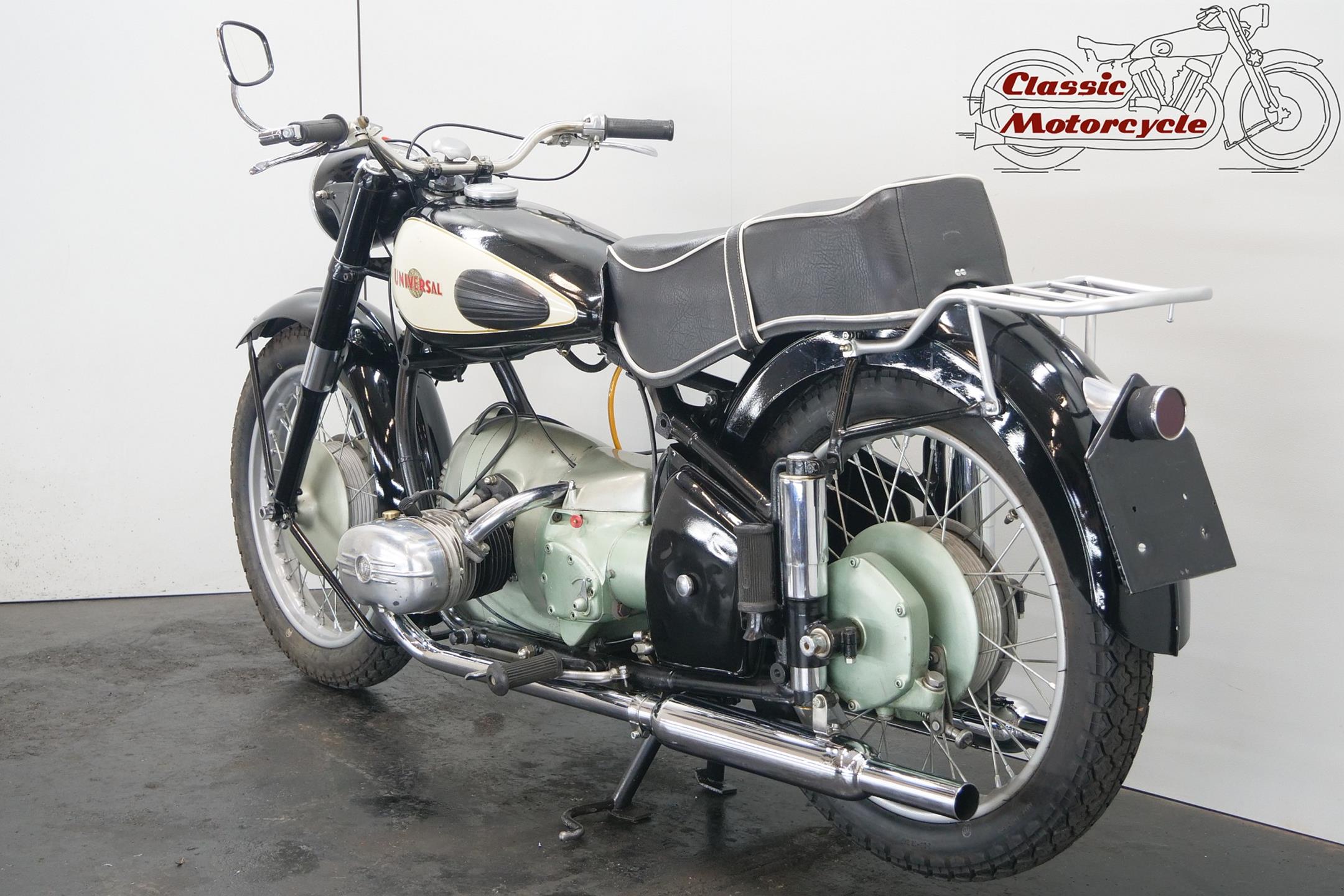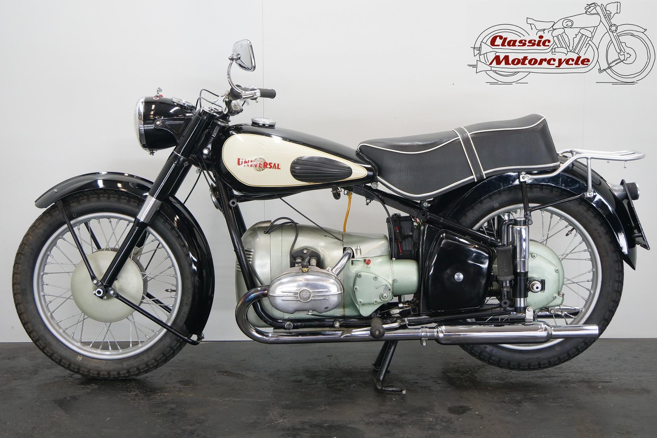 Universal motorcycles were made in Switzerland by the same factory that had previously marketed its products under the ‘Helvetia’ brand name. Established in 1928, Universal at first used proprietary engines supplied by JAP, Rudge (Python), Anzani and Ilo before getting around to making its own. At the top of the range in the 1930s were large sports models, powered by overhead-valve JAP v-twin engines, which looked every bit as handsome as their British counterparts. Universal began supplying motorcycles to the Swiss Army prior to WW2, these being mainly large, sidevalve-engined v-twins used for both solo and sidecar work, and during the war developed a range of models primarily for military use, powered by narrow-angle v-twin engines of 676cc and 990cc. After WW2 they produced a flat twin of 578cc along with a shaft-driven 250cc single. In the 1960s they had an agreement with Rabeneick to whom they supplied Universal 250cc shaft-drive engines. The company’s most memorable 578cc post-war model was B40 with sidevalve, B50 and the later 2B Meteor both with overhead valve and all with shaft-driven transverse ‘flat twin’ inspired by the BMW. Universal motorcycles were last produced in 1964.