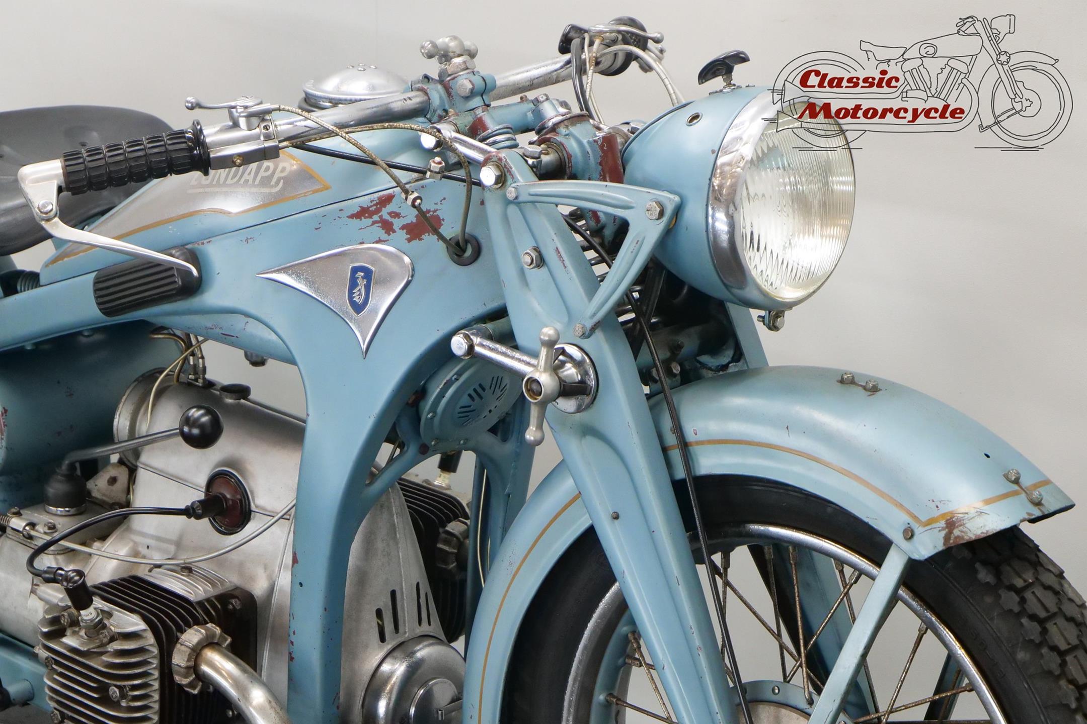 Founded at the height of WWI to manufacture armaments, Zündapp found a new role post-war as a producer of motorcycles under the direction of new owner, Dr Fritz Neumeyer, building its first machine, a Levis-powered two-stroke, in 1921. The firm began making its own engines in 1924, selling more than 10,000 machines that year, and at the Berlin Motor Show in 1933 introduced the first of the horizontally opposed, four-stroke twins that it is best remembered for. These formed part of an extensive and diverse range of models, all but the smallest two-stroke being designated by the letter 'K' (for kardan, meaning 'shaft'). Among the models premiered were the K400 and K500 sidevalve twins, both of which employed designer Richard Küchen's unconventional all-chain four-speed 'gearbox' and, as the designation suggests, shaft final drive. Introduced at the same time was another Küchen design: a horizontally opposed four made in 598cc (K600) and 798cc (K800) capacities. Common to all the larger models and eminently suited to withstanding the stresses and strains imposed by travel on unmade roads, the robust frame and girder forks were made of pressed steel, an advanced feature at the time. The new Zündapp range was an enormous success, and in September 1933 the firm produced its 100,000th machine, quite an achievement after little more than a decade as a motorcycle manufacturer.