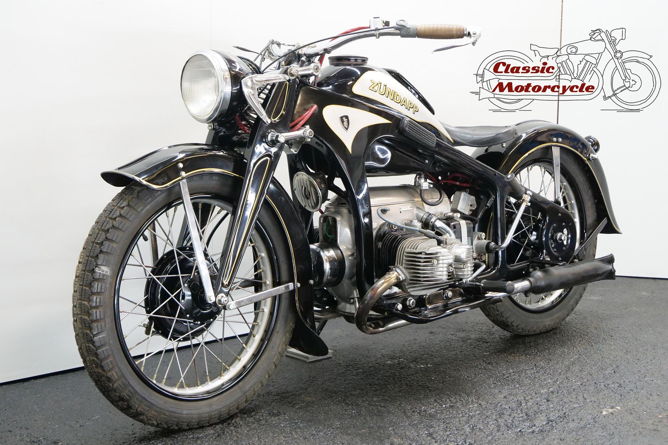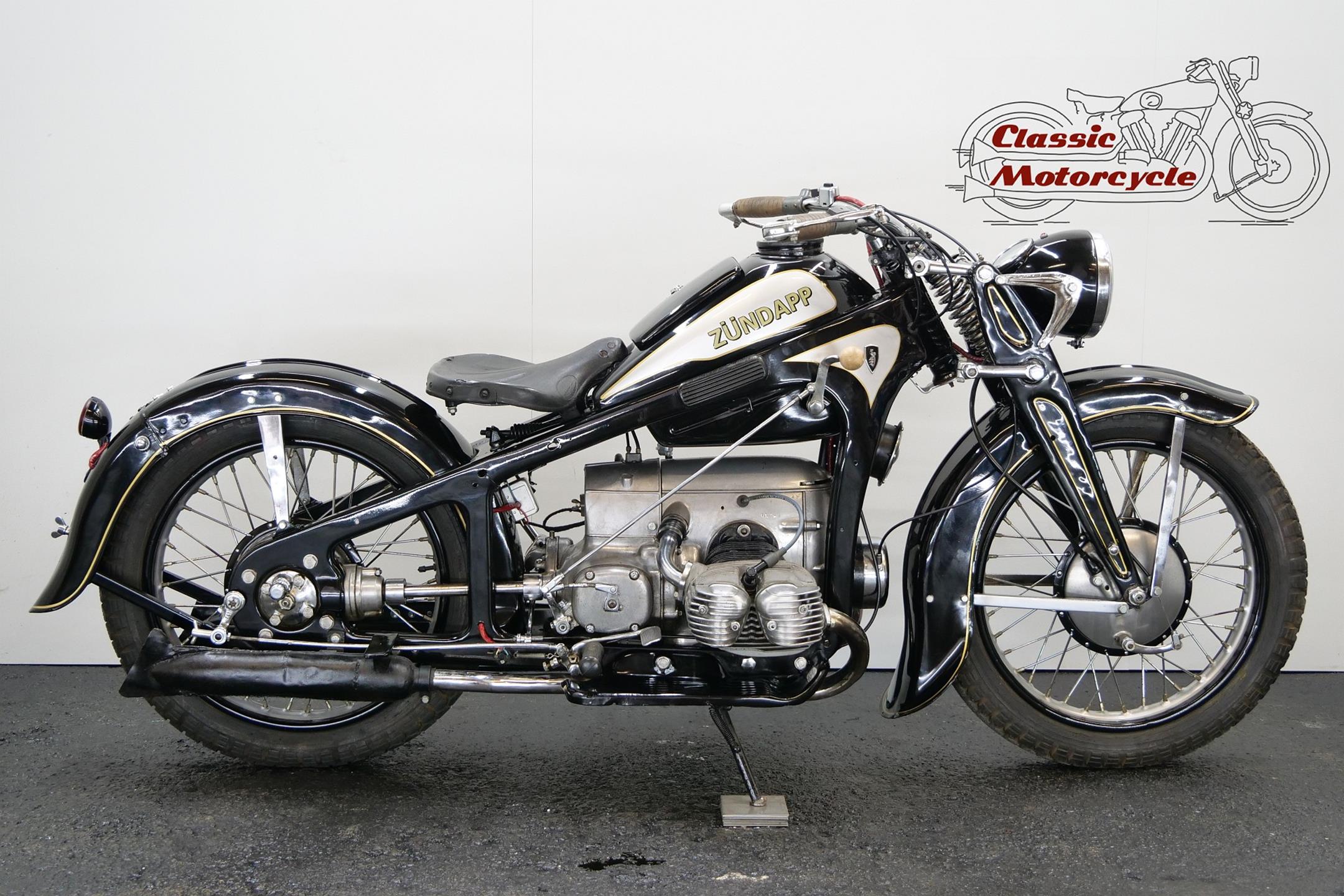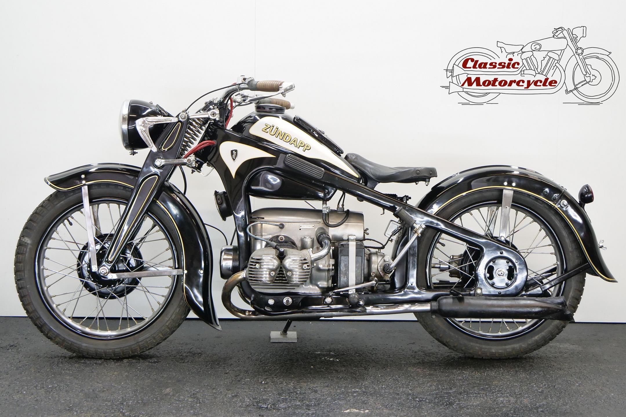 Founded at the height of WWI to manufacture armaments, Zündapp found a new role post-war as a producer of motorcycles under the direction of new owner, Dr Fritz Neumeyer, building its first machine, a Levis-powered two-stroke, in 1921. The firm began making its own engines in 1924, selling more than 10,000 machines that year, and at the Berlin Motor Show in 1933 introduced the first of the horizontally opposed, four-stroke twins that it is best remembered for. These formed part of an extensive and diverse range of models, all but the smallest two-stroke being designated by the letter 'K' (for kardan, meaning 'shaft'). Among the models premiered were the K400 and K500 sidevalve twins, both of which employed designer Richard Küchen's unconventional all-chain four-speed 'gearbox' and, as the designation suggests, shaft final drive. Introduced at the same time was another Küchen design: a horizontally opposed four made in 598cc (K600) and 798cc (K800) capacities. Common to all the larger models and eminently suited to withstanding the stresses and strains imposed by travel on unmade roads, the robust frame and girder forks were made of pressed steel, an advanced feature at the time. The new Zündapp range was an enormous success, and in September 1933 the firm produced its 100,000th machine, quite an achievement after little more than a decade as a motorcycle manufacturer. Immediately prior to the outbreak of war in September 1939, Zündapp introduced an overhead-valve twin, the KS600. The latter's 597cc engine produced 28ps, and like the rest of the larger Zündapps the KS600 featured the chain-drive 'gearbox', shaft drive, and the pressed steel frame and forks.