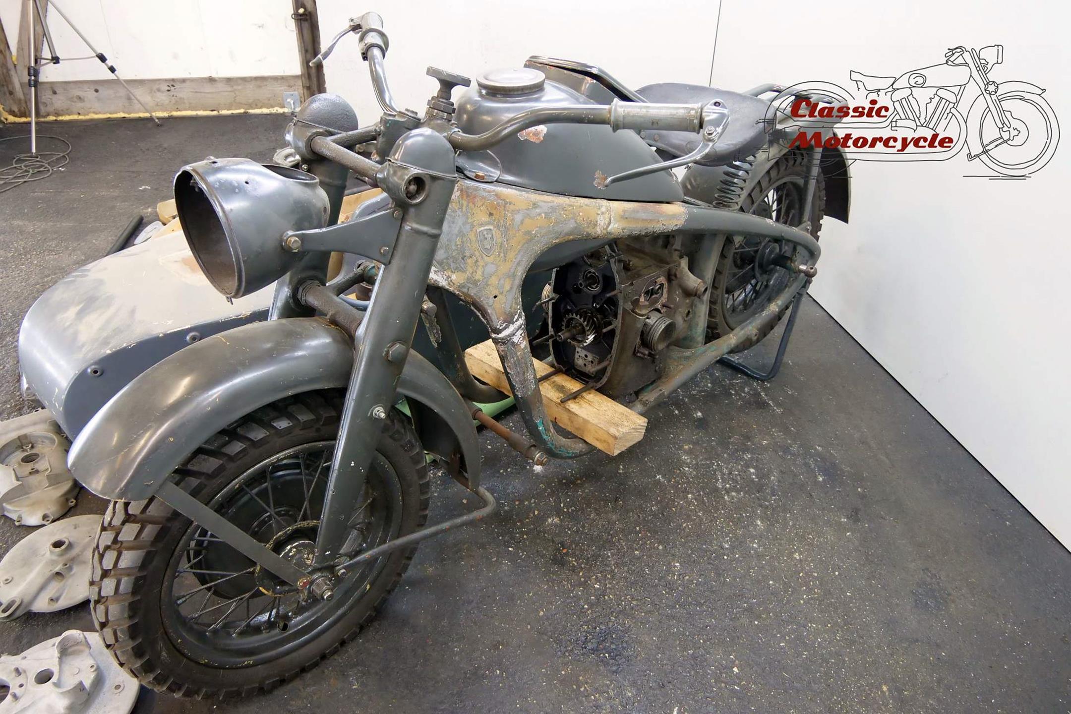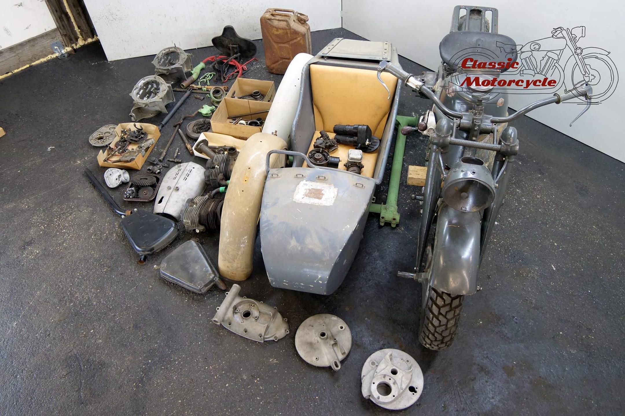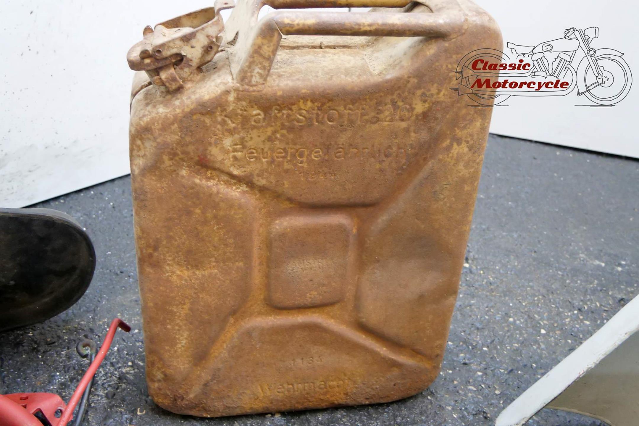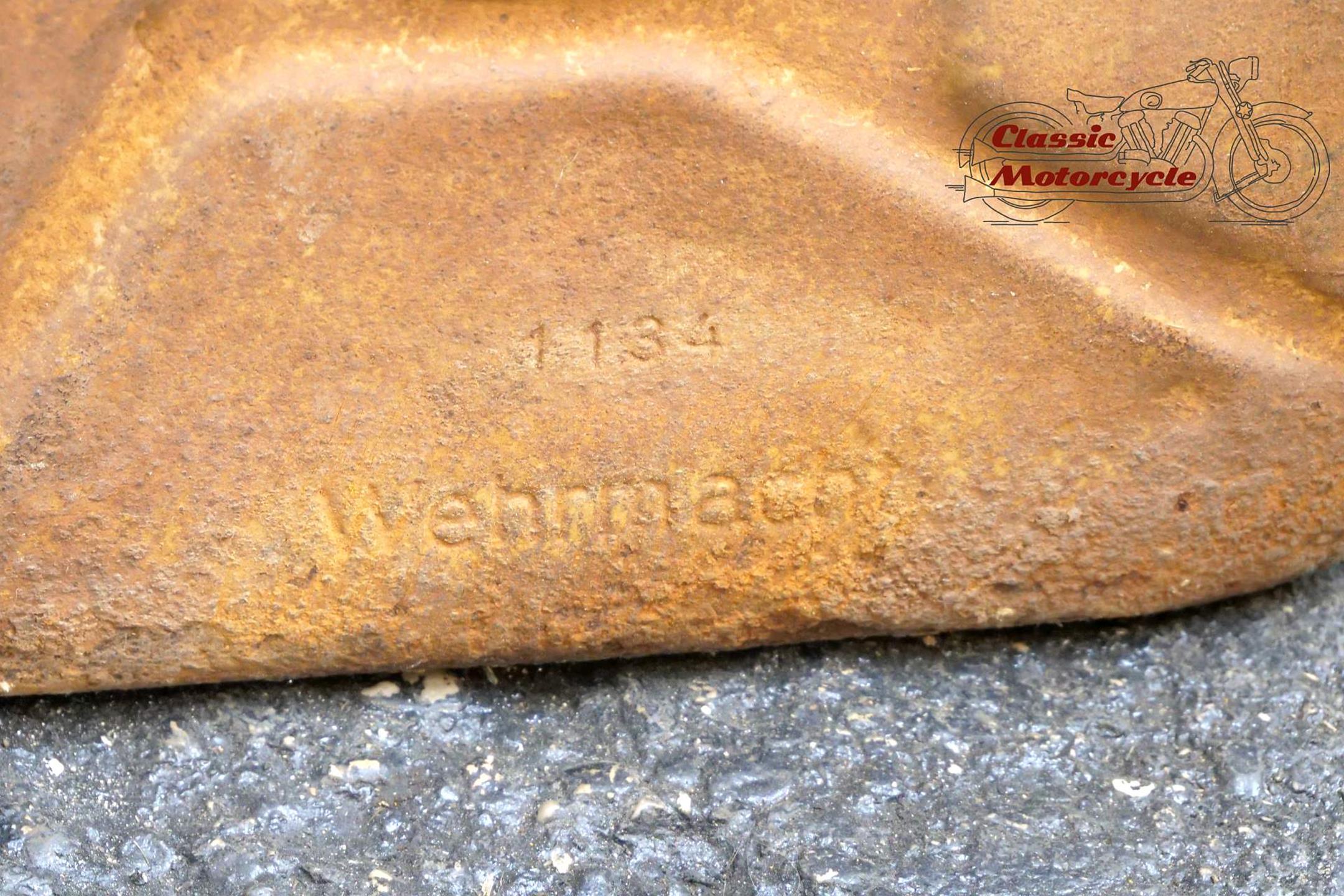 This bike has been bought from the previous owner 10 years ago as an overpainted running project. Some of the parts has been dismantled and were and stored in a dry place. The big surprise: the original paint it visible under the gray paint. We think the original paint can be rescued with careful removal of the gray paint. The Special part is the Neumann cyclone air filter with air pre-warming. All major parts are present with this bike including the original type plate. It is a rewarding project with a look at the strong raising market prices of the Wehrmacht Zündapp KS 750.