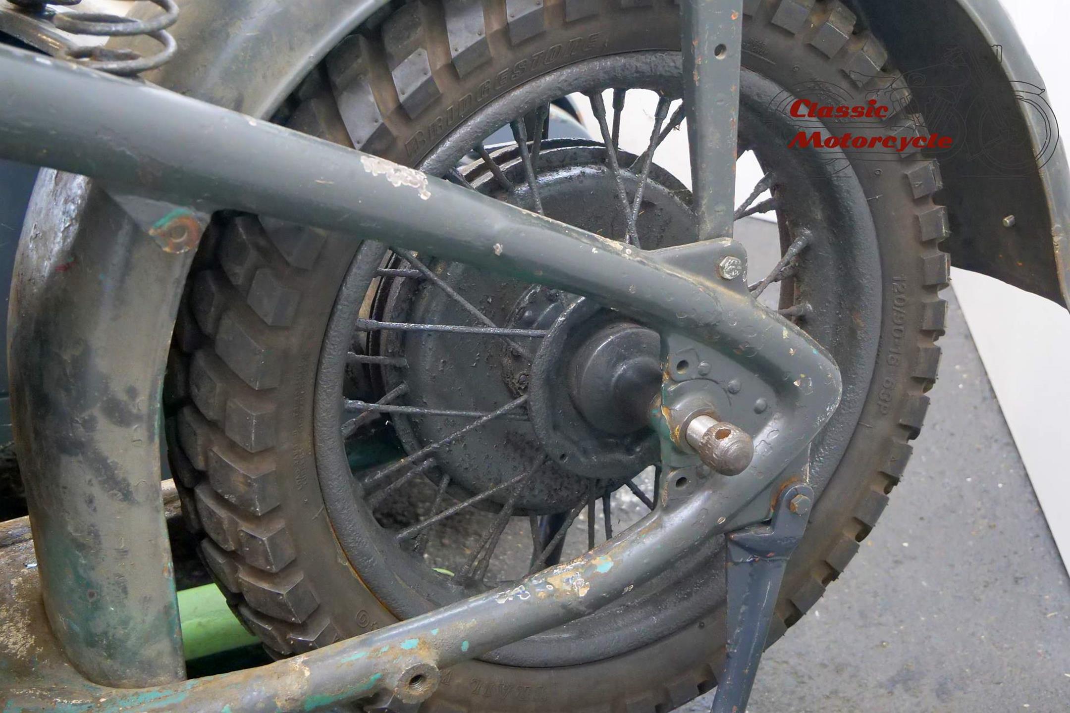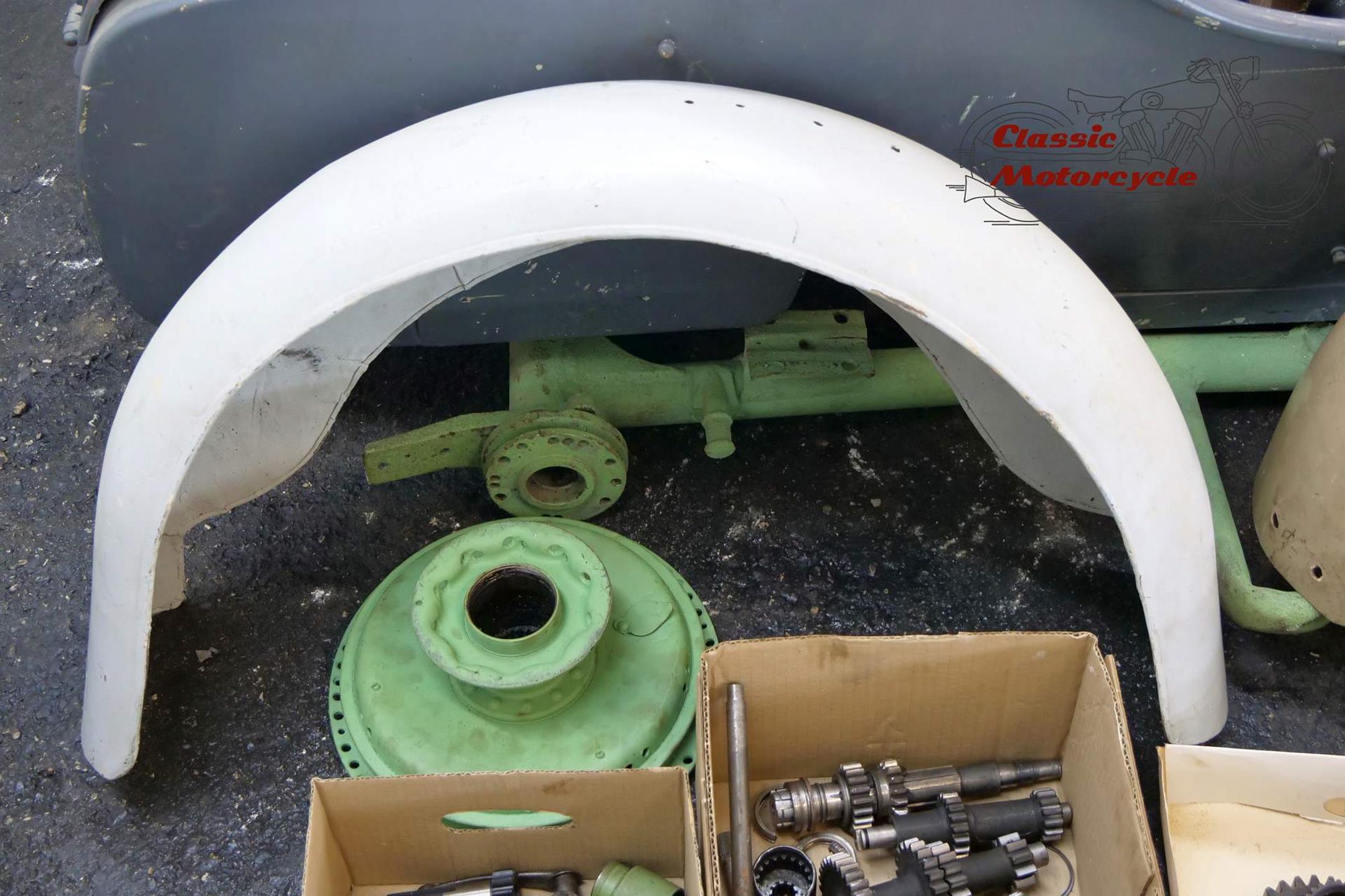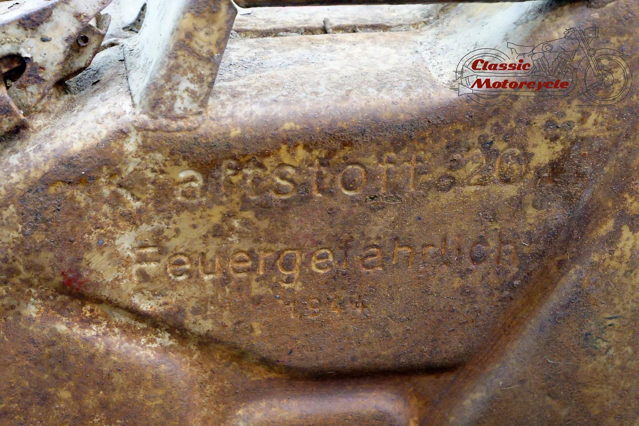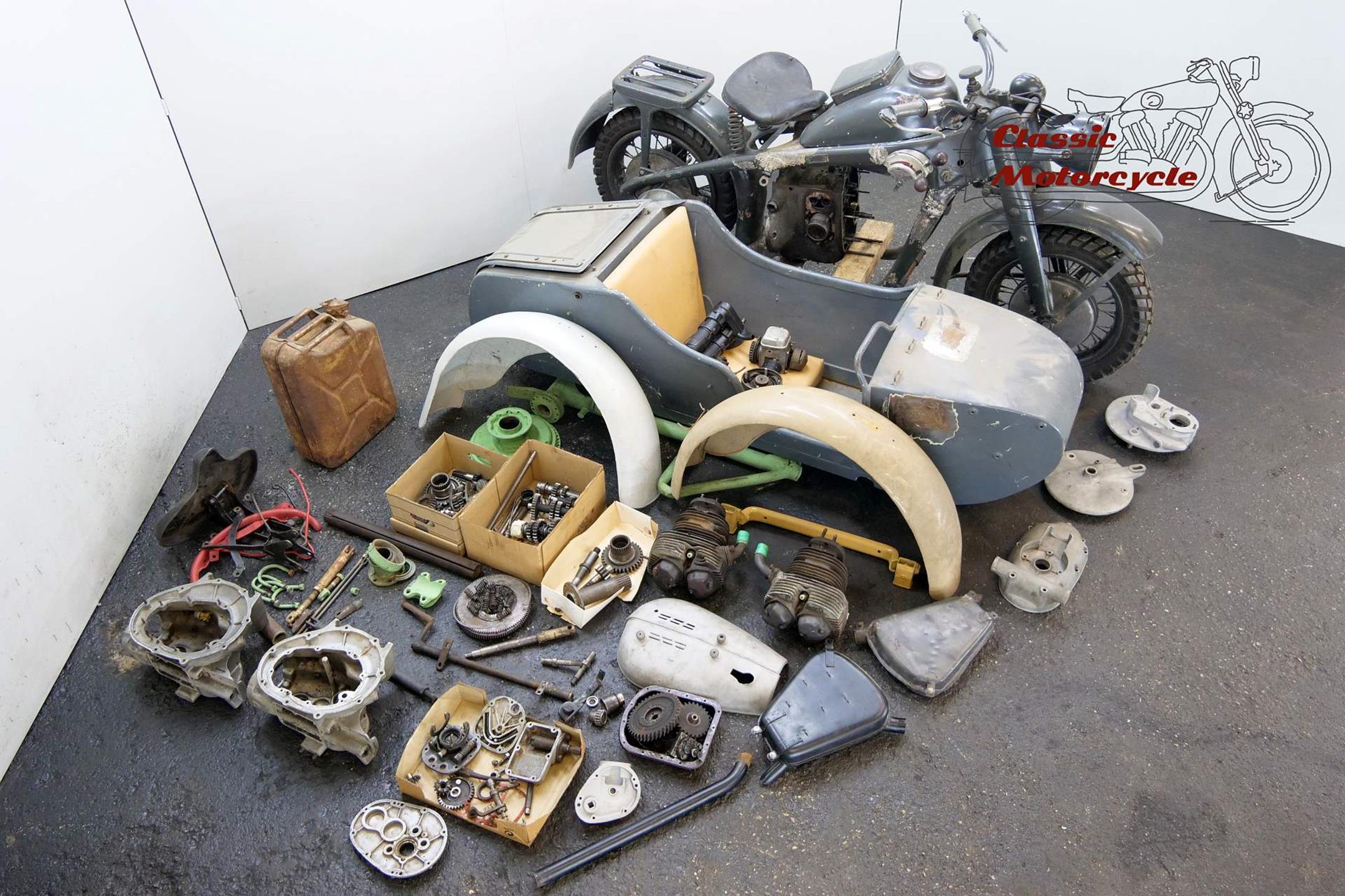 This bike has been bought from the previous owner 10 years ago as an overpainted running project. Some of the parts has been dismantled and were and stored in a dry place. The big surprise: the original paint it visible under the gray paint. We think the original paint can be rescued with careful removal of the gray paint. The Special part is the Neumann cyclone air filter with air pre-warming. All major parts are present with this bike including the original type plate. It is a rewarding project with a look at the strong raising market prices of the Wehrmacht Zündapp KS 750.
