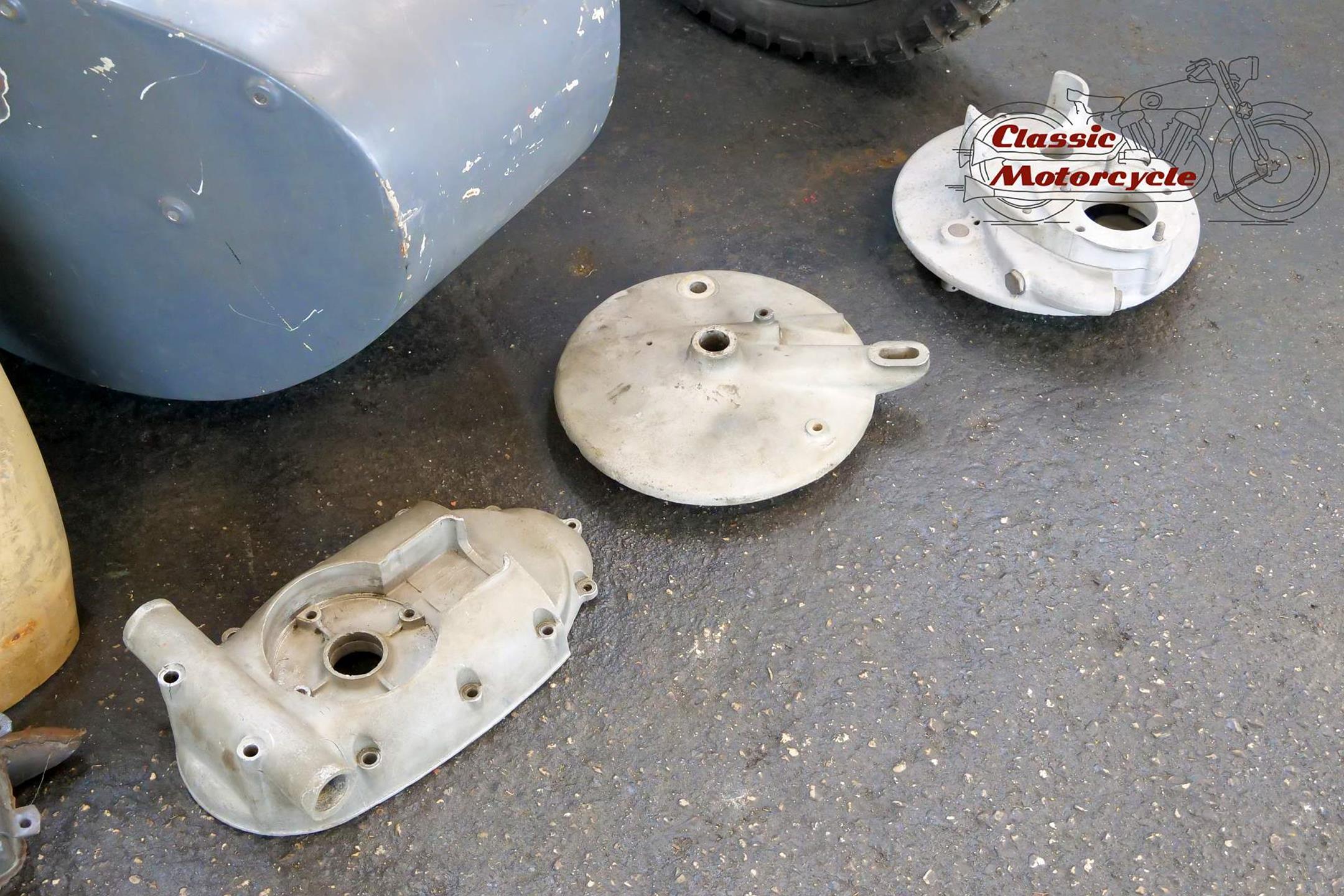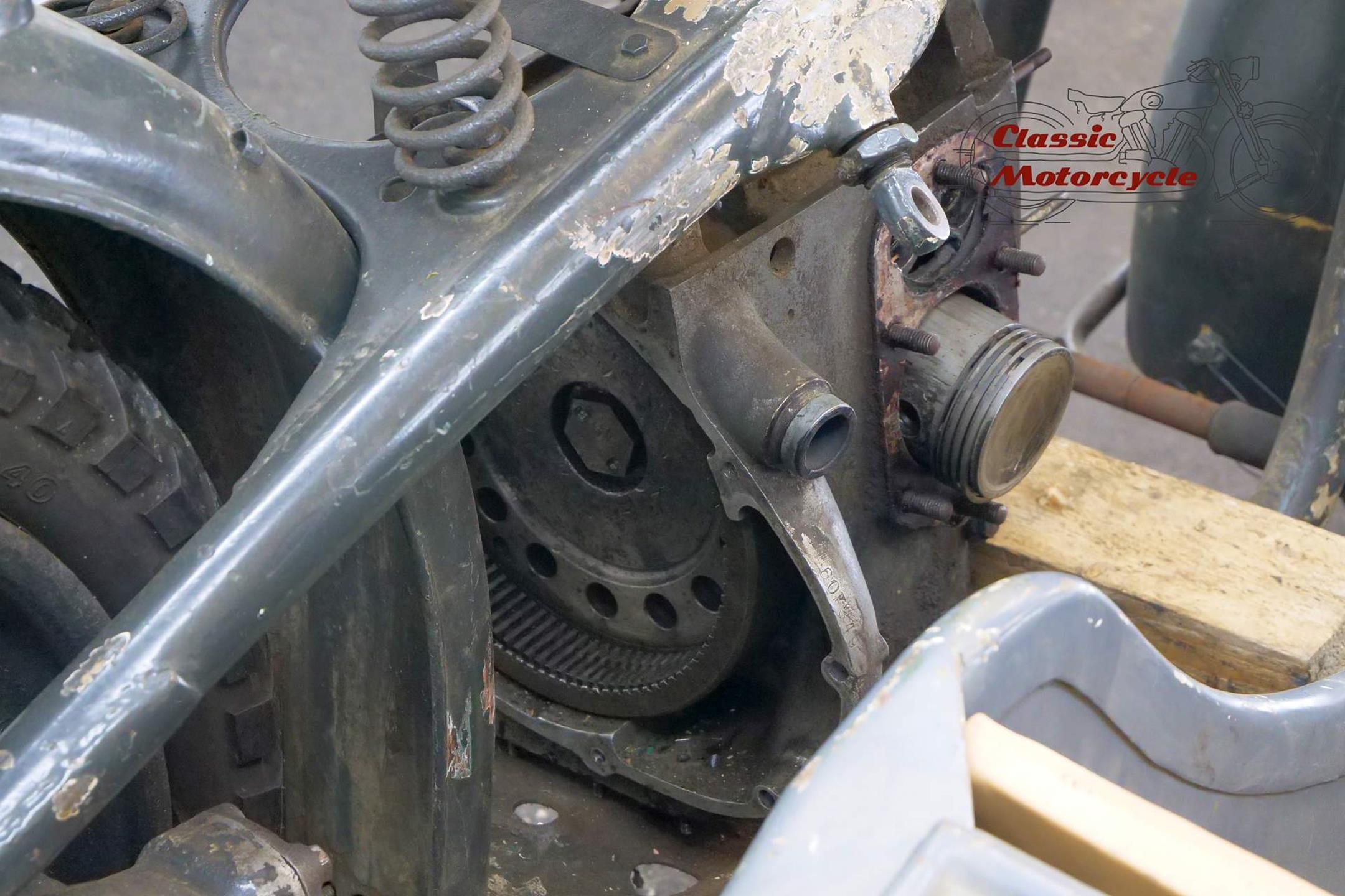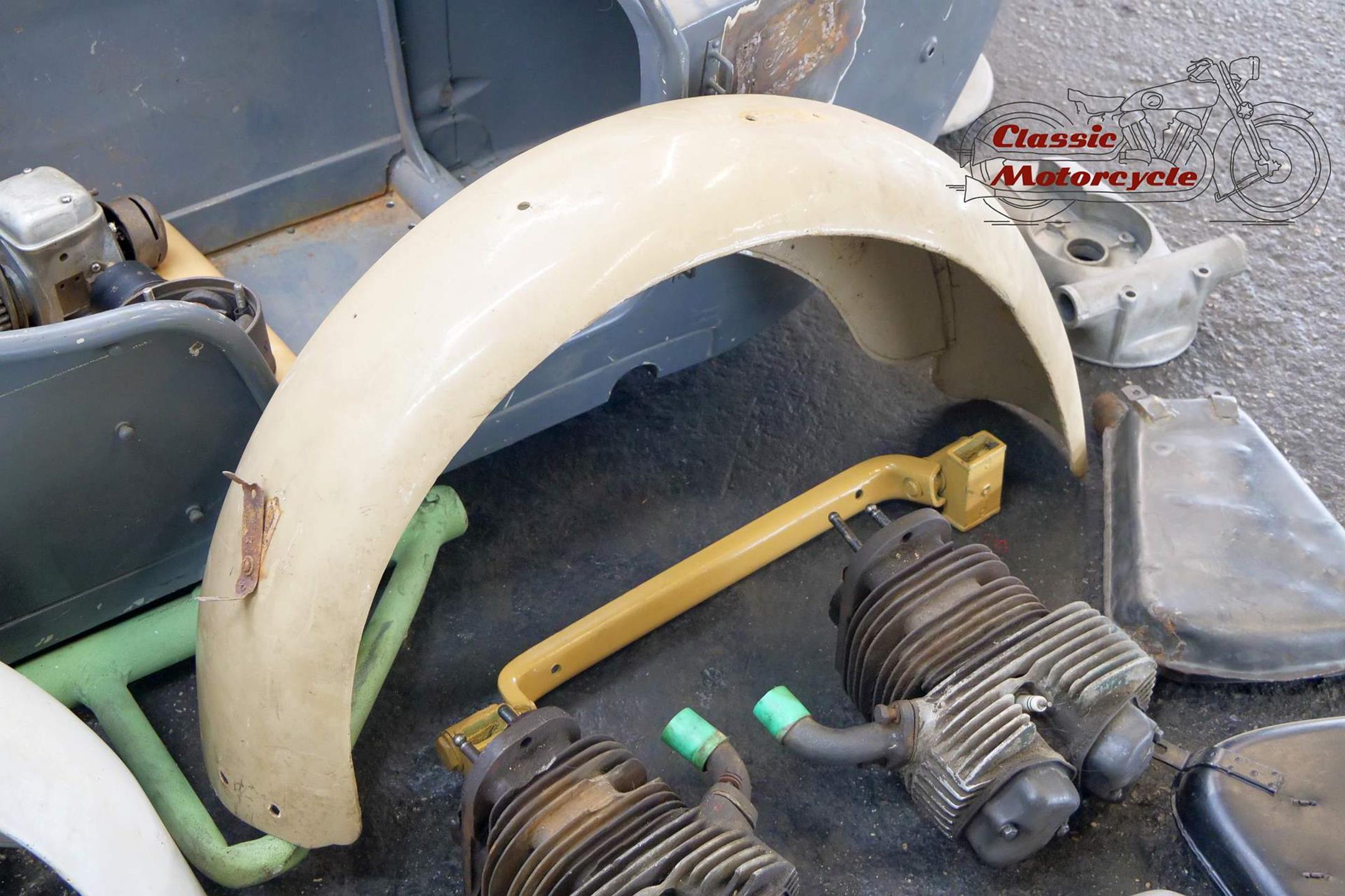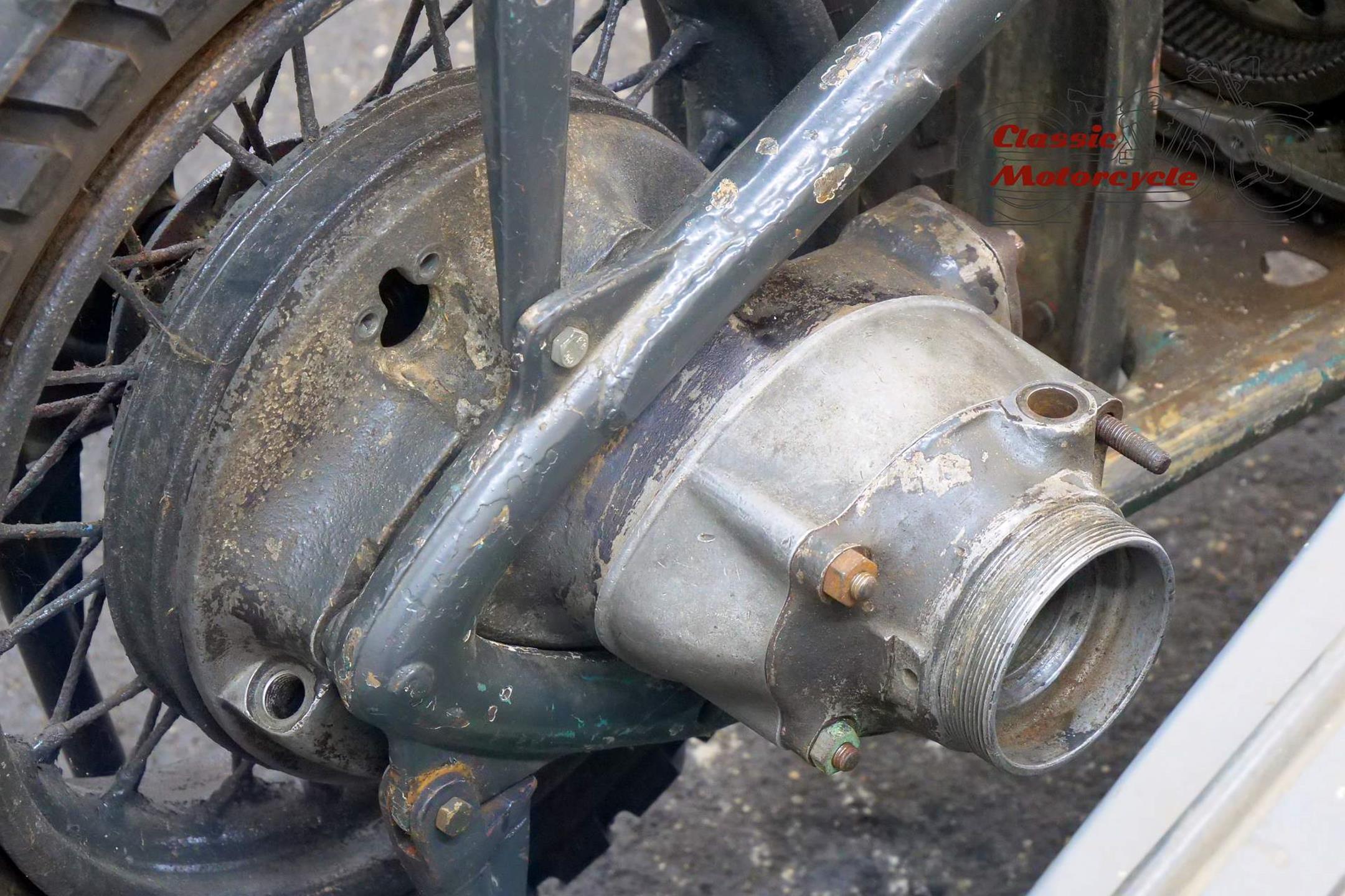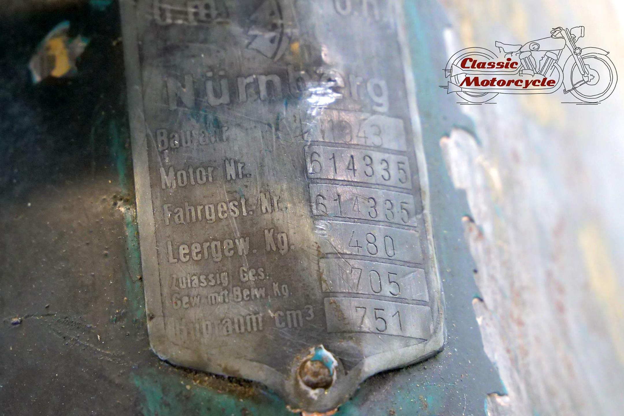 This bike has been bought from the previous owner 10 years ago as an overpainted running project. Some of the parts has been dismantled and were and stored in a dry place. The big surprise: the original paint it visible under the gray paint. We think the original paint can be rescued with careful removal of the gray paint. The Special part is the Neumann cyclone air filter with air pre-warming. All major parts are present with this bike including the original type plate. It is a rewarding project with a look at the strong raising market prices of the Wehrmacht Zündapp KS 750.