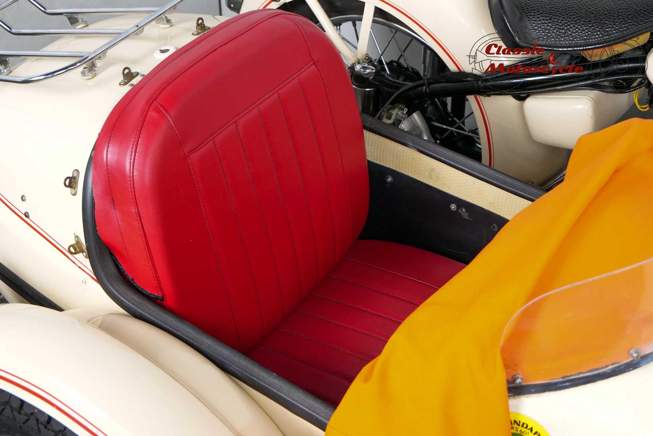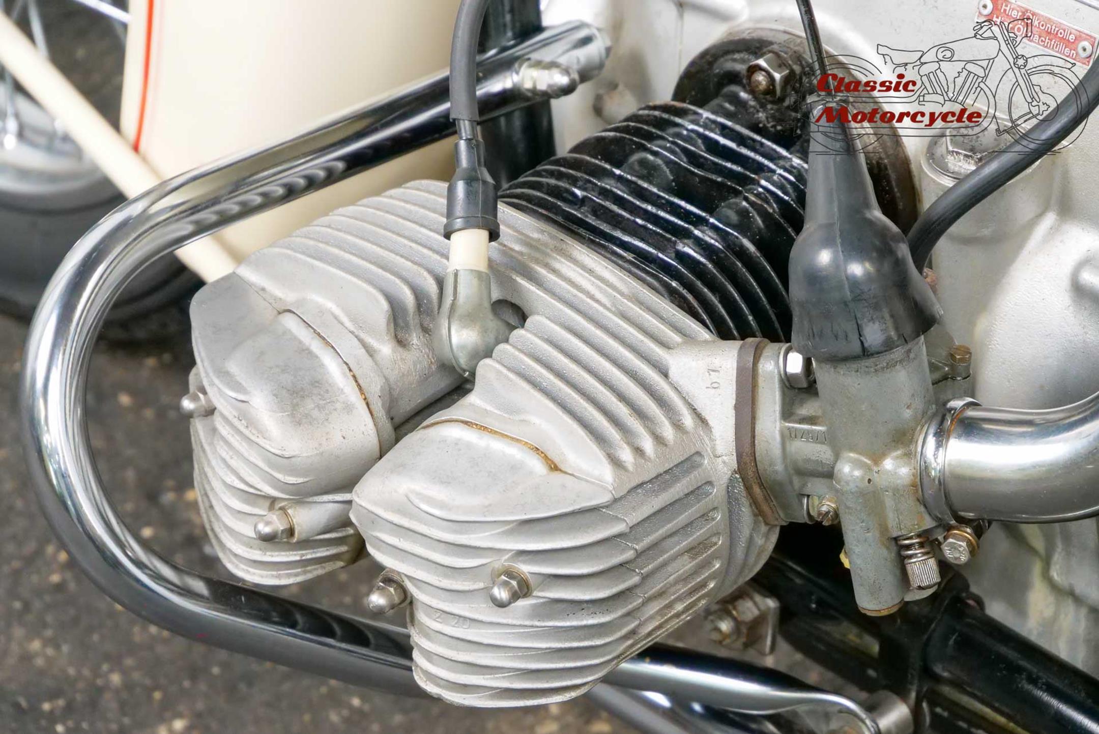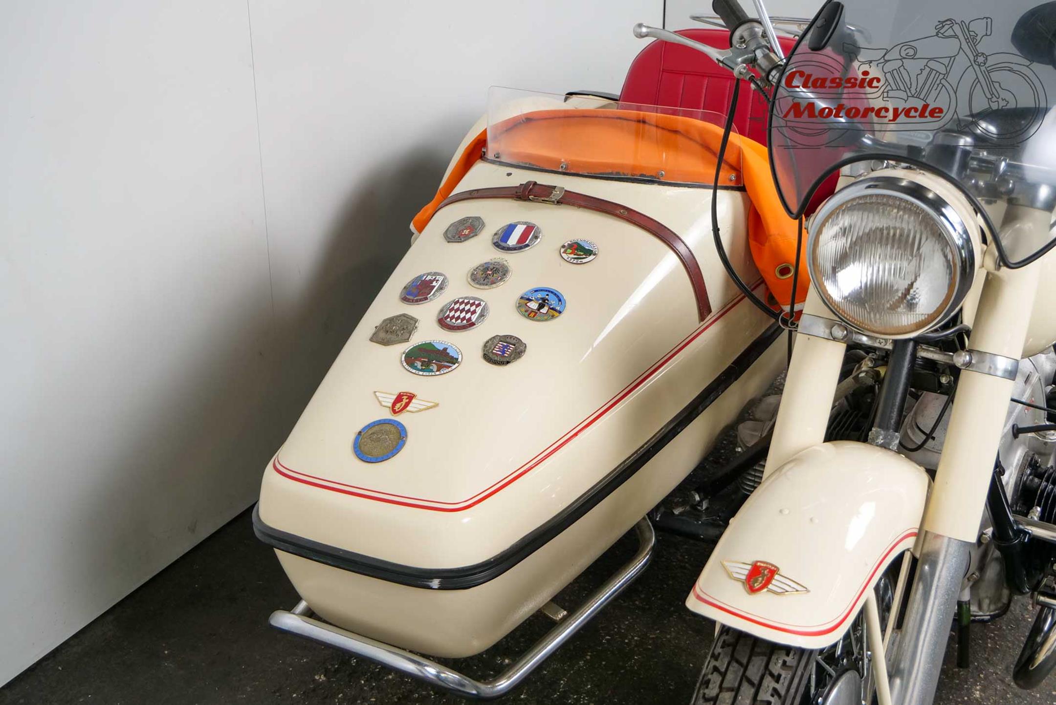 The Zündapp KS601 Sport is the successor of the proven KS600. The engine produces 32ps and is very well suited for sidecar operation. The machine was restored a few years ago and was upgraded with a Velorex sidecar model 562 in the 1990s. The original type plate matches the frame-, engine- and numbers on both cylinders. The machine is fully road ready and has papers from Germany.