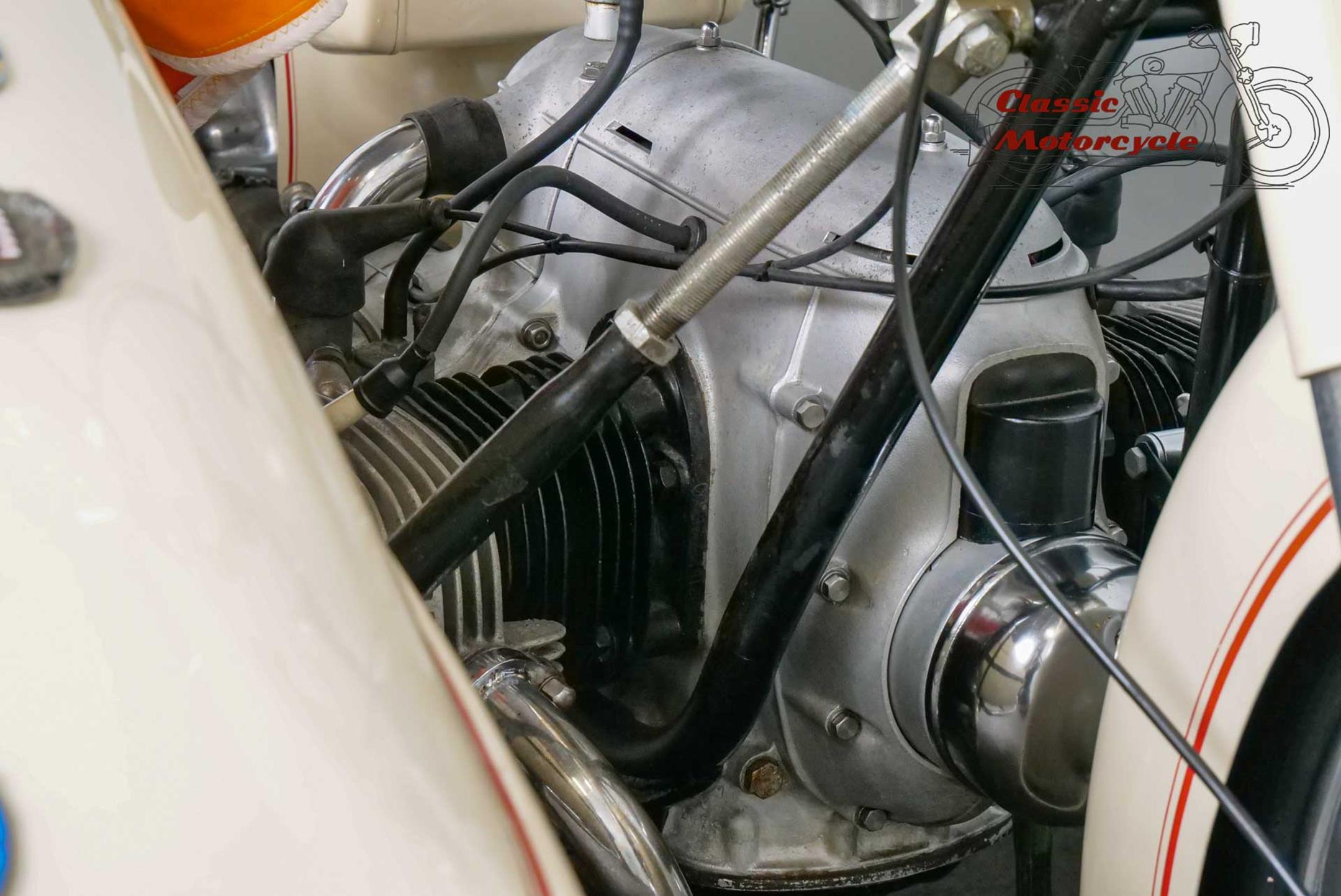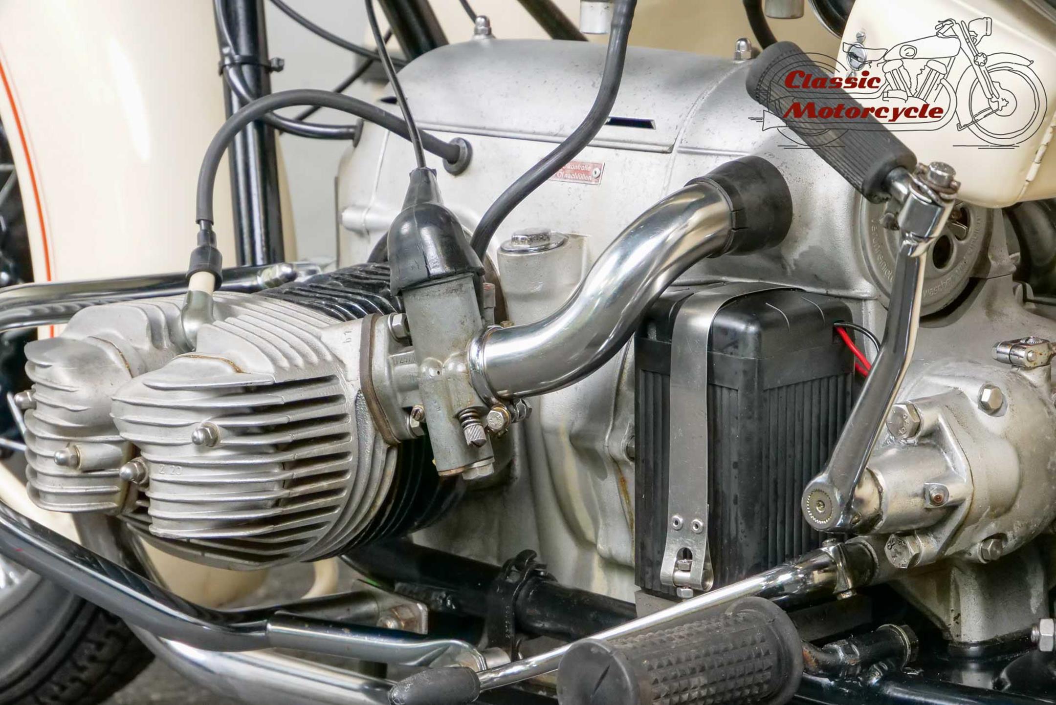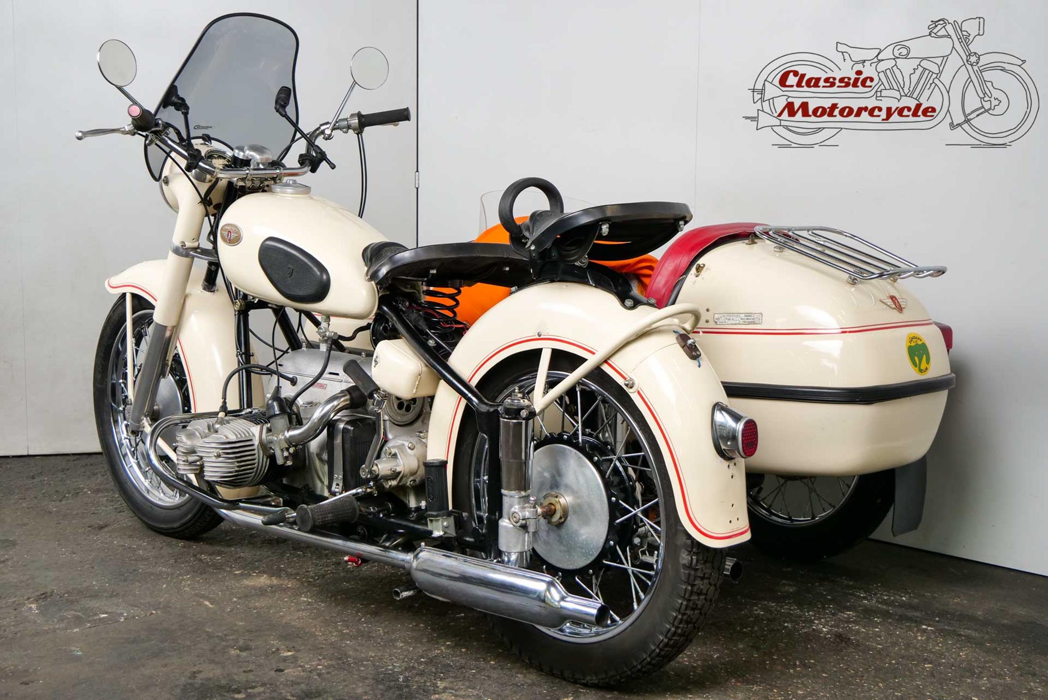 The Zündapp KS601 Sport is the successor of the proven KS600. The engine produces 32ps and is very well suited for sidecar operation. The machine was restored a few years ago and was upgraded with a Velorex sidecar model 562 in the 1990s. The original type plate matches the frame-, engine- and numbers on both cylinders. The machine is fully road ready and has papers from Germany.