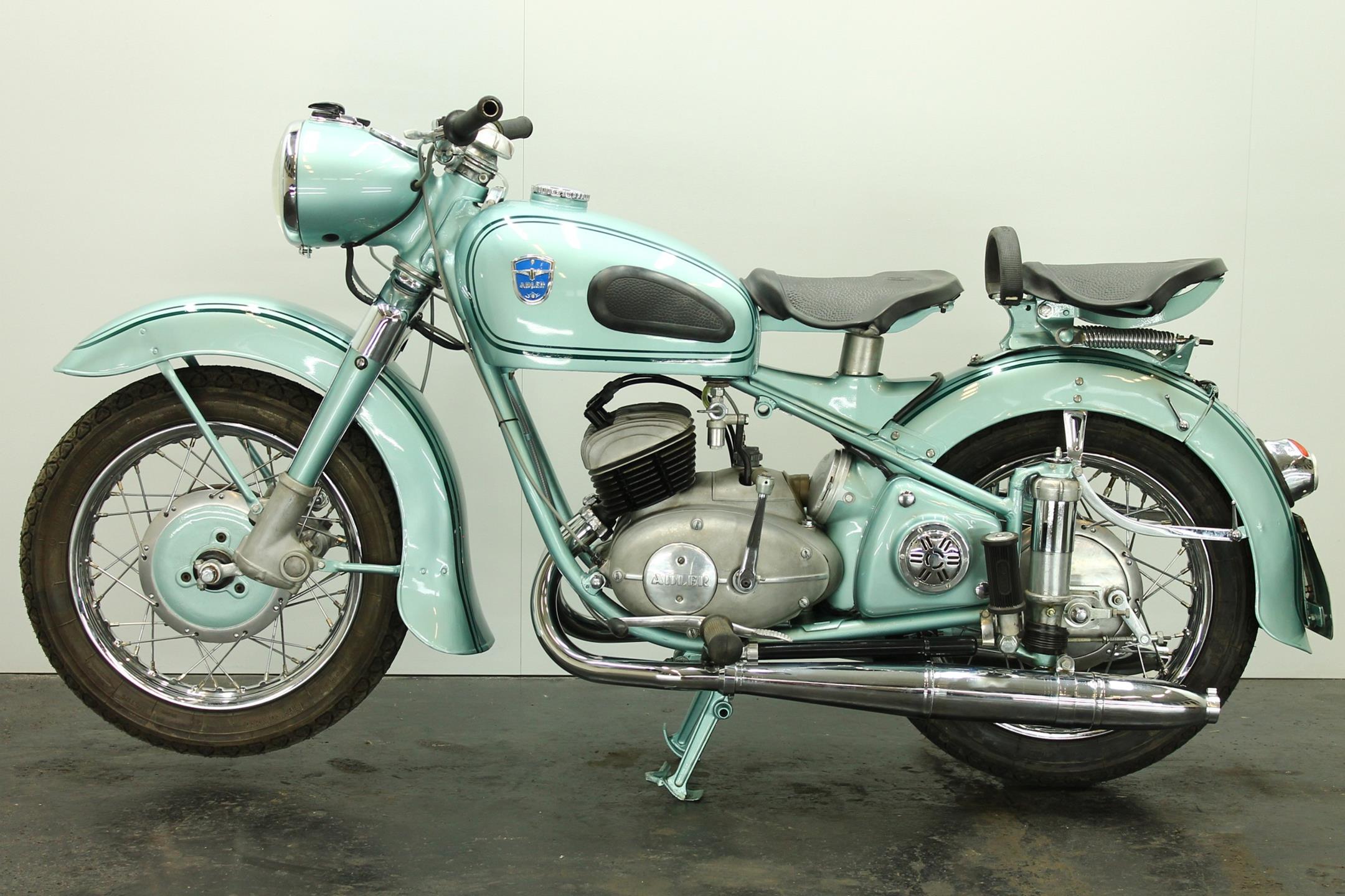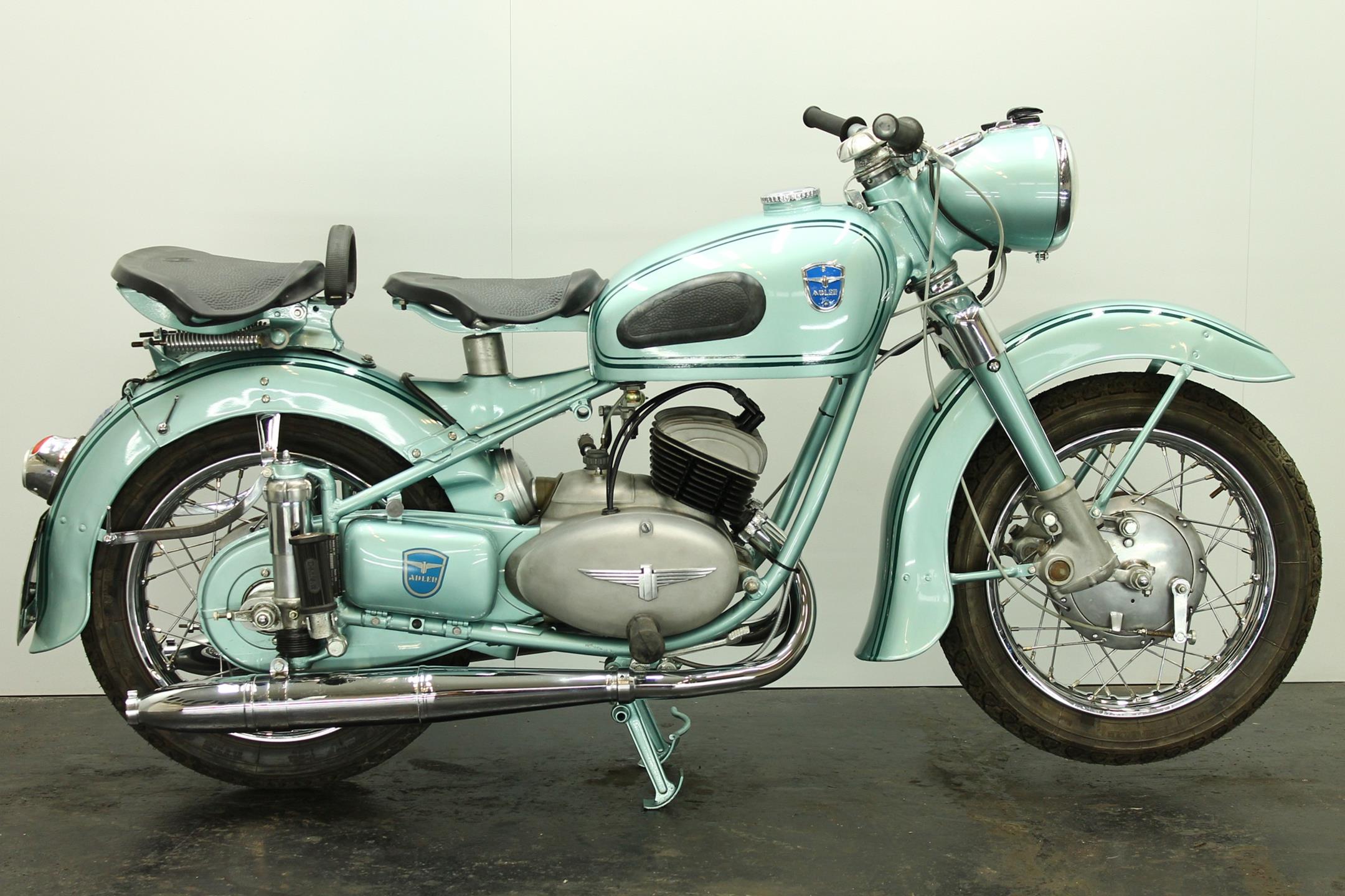 Heinrich Kleyer was the first to manufacture typewriters in Germany. He started in 1898 in Frankfurt and eventually built his Adler company – German for eagle – into something of an engineering powerhouse. Adler followed typewriters – his revolutionary Model No. 7 acquired legendary status before the word digital ever reached a dictionary - with bicycles, automobiles and motorcycles. Post WW II motor car manufacture was not resumed but in 1949 motorcycle production restarted which soon led to the Adler MB250, a high quality, two-stroke machine whose design features were then given to BSA as part of the Allies' war reparations program; BSA used some of the Adler design concepts in the Ariel Arrow and Leader models. Soon Suzuki and Yamaha took notice, too. Meanwhile Adler focused on all kinds of other office equipment, too is bought by Grundig, merged with the (German) Triumph typewriter company to form Trumf-Adler, then taken over by Olivetti. Motorcycle manufacture ends in 1956.