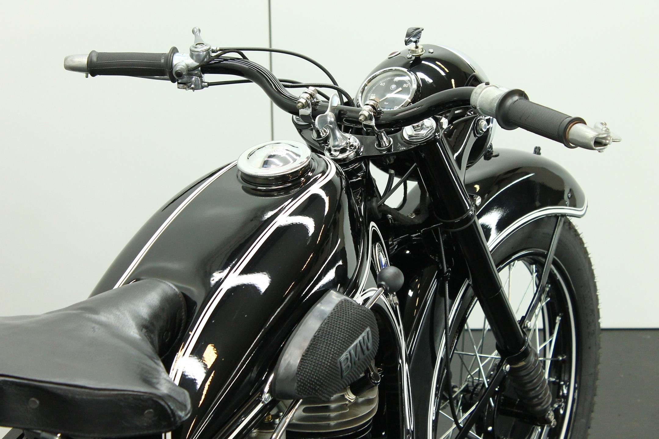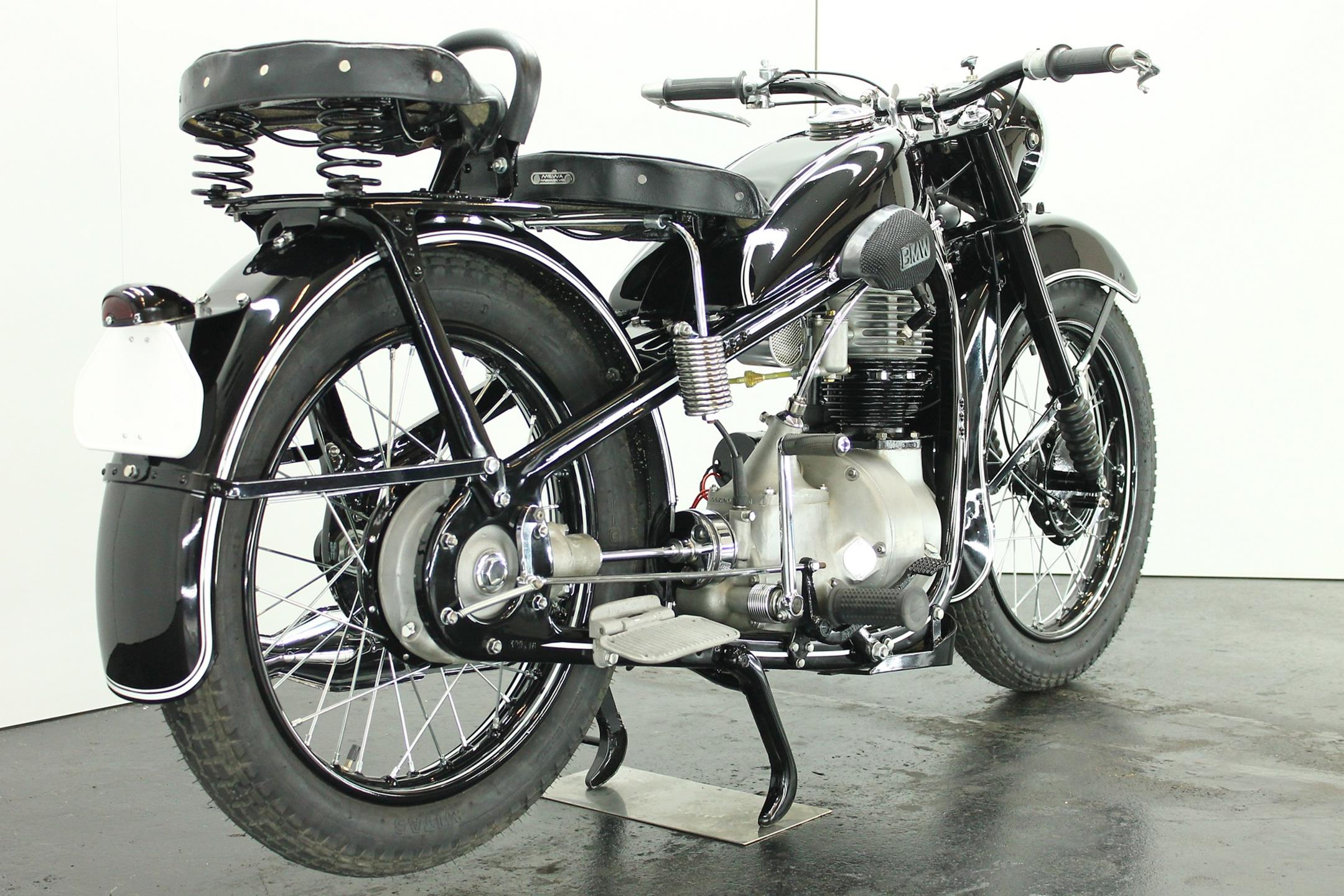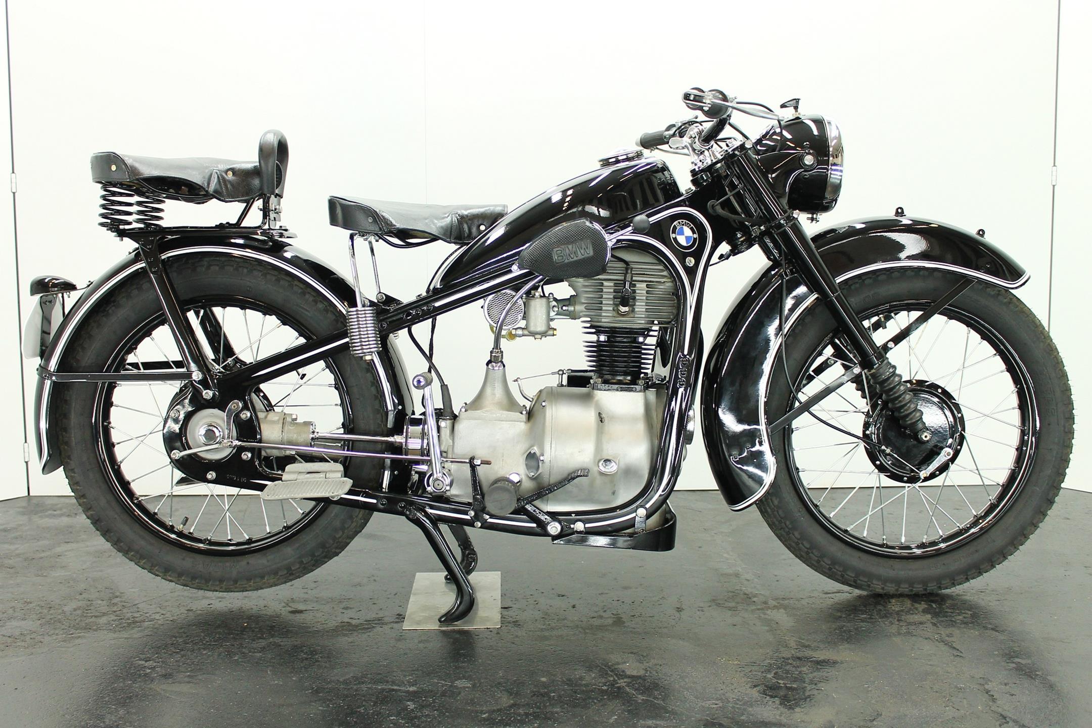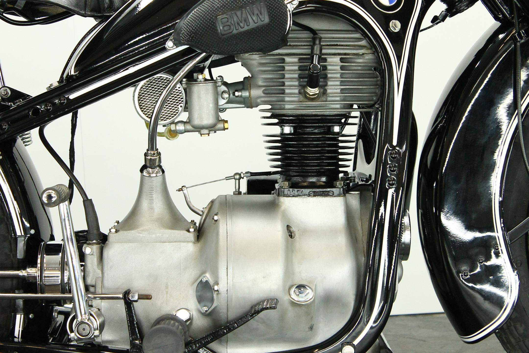 BMW made a host of successful shaft-driven, single-cylinder motorcycles. Starting with the first model, the 250cc 1925 R39, there came the R2 series, the R35, the R20, the R24, R25 series, the R26, and the final model, the R27. All except for the R2, R4, and R35 were 250cc models. After World War II, BMW no longer made R35 motorcycles. "Eisenacher Motorenwerk" (EMW) was an East German manufacturer of automobiles and motorcycles based in Eisenach, then East Germany. It made R35s essentially identical to the pre-war BMW R35. One of the pre-World-War-II BMW factories was located in Eisenach, which after the war was taken over by the Soviets as it was located in the Soviet occupation zone. The factory continued producing cars and motorcycles using the BMW logo, but after a lawsuit in 1952 it had to change the name to EMW instead. The EMW logo was also similar, but instead of the blue BMW used, EMW used red. After the R3 with its 300cc engine had enjoyed very little commercial success, BMW introduced a new single-cylinder model in 1937, the R35. Its engine was derived from the 400cc R4, but by reducing the bore the displacement was decreased to 350cc. The R35 also developed 14 horsepower and like the R4 had a top speed of 100km/h. The suspension had in the meantime been modernized. The frame was still made from massive-looking pressed steel sections but the antiquated leaf spring at the front was now replaced by a modern telescopic fork. In contrast to the exclusive "Boxer" models, however, there was no hydraulic damping. By the close of production, the R35 was the most successful model in BMW's motorcycle history and when you see the bikes today, it's easy to understand where the appeal lies.