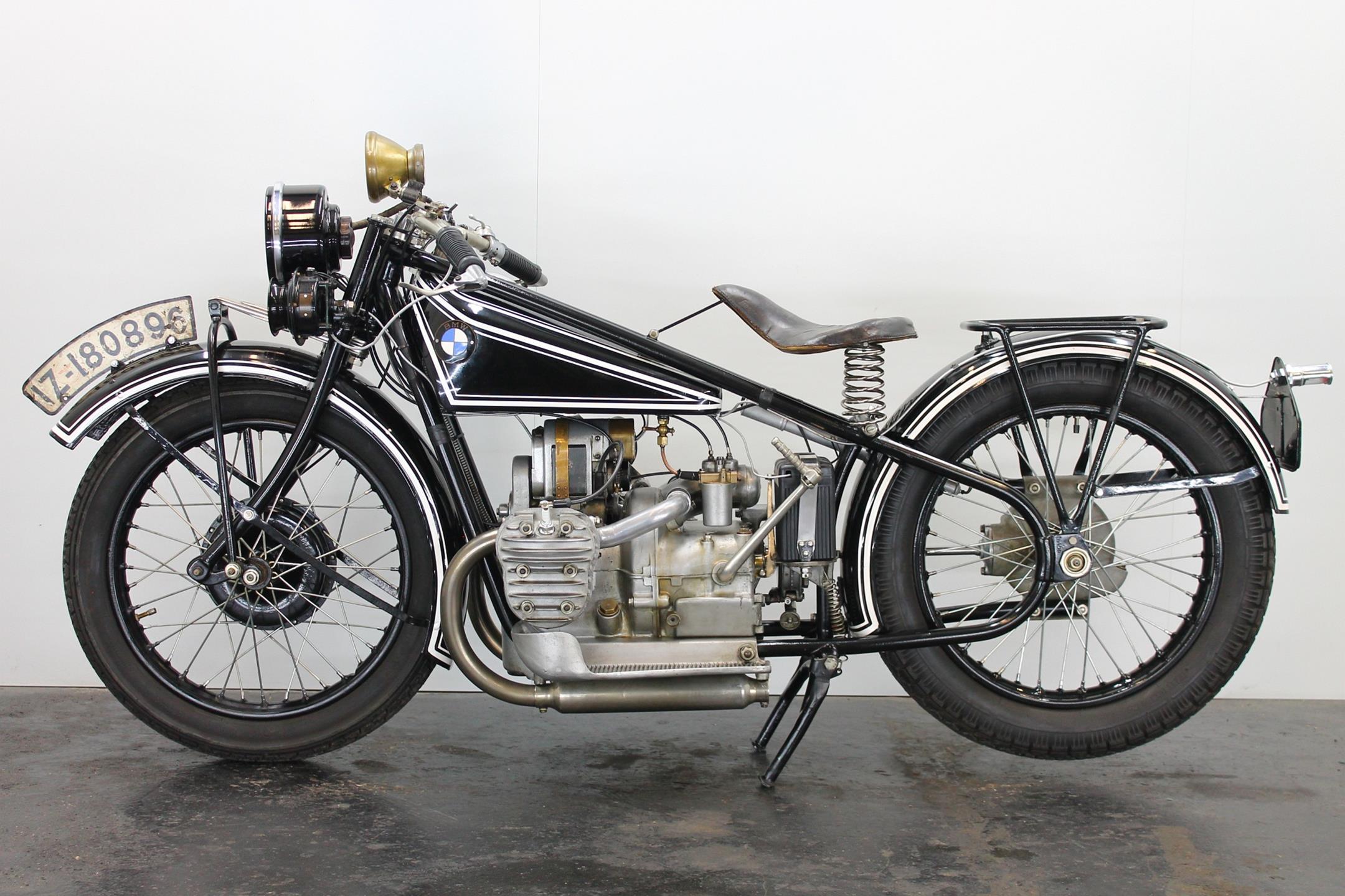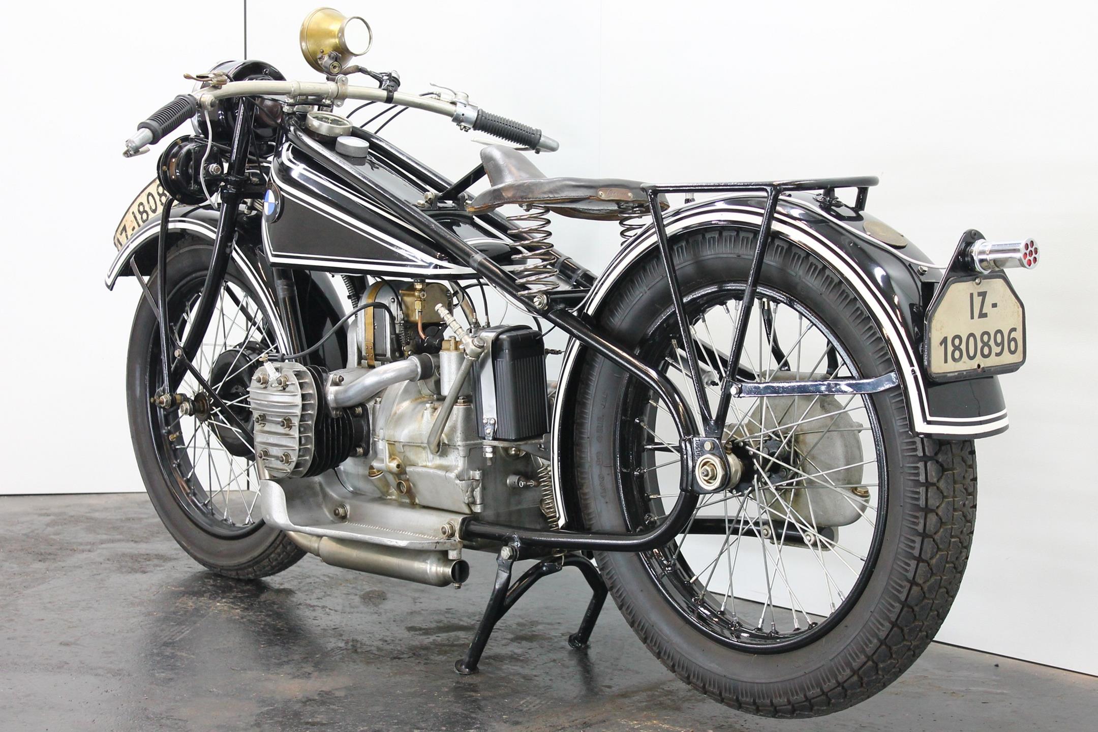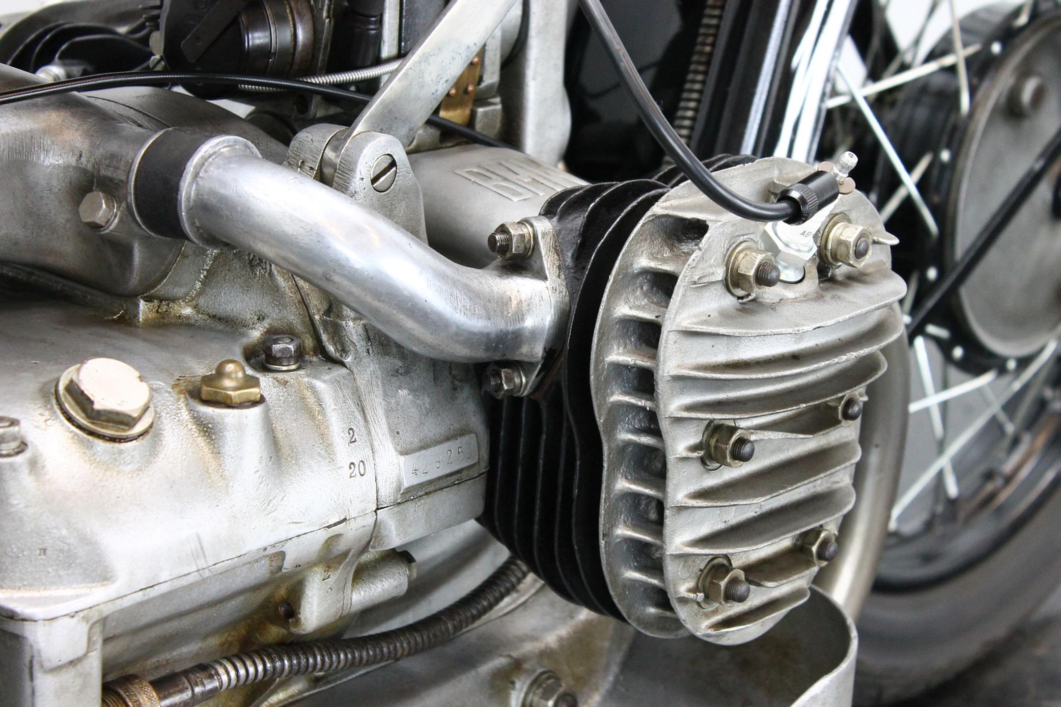 It was designer Max Fitz, forbidden by treaty from working on aircraft engines following World War I, who came up with the blueprint for BMW motorcycles that the company follows to this day, 90 years after the first R32 was produced. That first bike featured his now-familiar transverse-mounted "boxer" motor, its twin cylinders jutting out into the cooling breeze. Also present from the beginning was shaft final drive; BMW's attention to engineering and focus on solid build quality was already readily apparent. The R42, introduced three years later in 1926, moved the brand more firmly down the road to profitability and success. Its redesigned and more powerful 500cc engine, now with aggressively finned detachable alloy heads, made the bike a better tourer. With the engine repositioned in the frame for improved weight distribution, stronger, straighter front downtubes could be employed, sharpening the bike's handling. Braking too was improved; gone was the arcane block-and-pulley type rear brake, replaced by a drum on the driveshaft gripped by external contracting bands. Stylistically, the R32's quaint valanced fenders gave way to simpler, more modern looking sheetmetal. Despite the fact that all BMW two-wheelers built up to 1941 owe much to the R42, its production lasted just three years, making this rare Bimmer among the brand's most desirable and sought-after vintage machines. BMW catalogued the R42 for 1.510 Reichsmark.