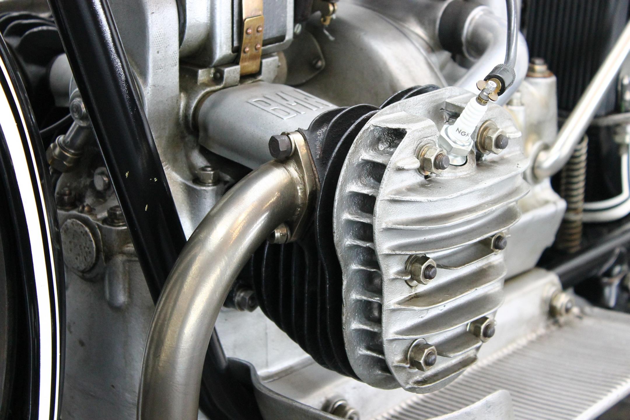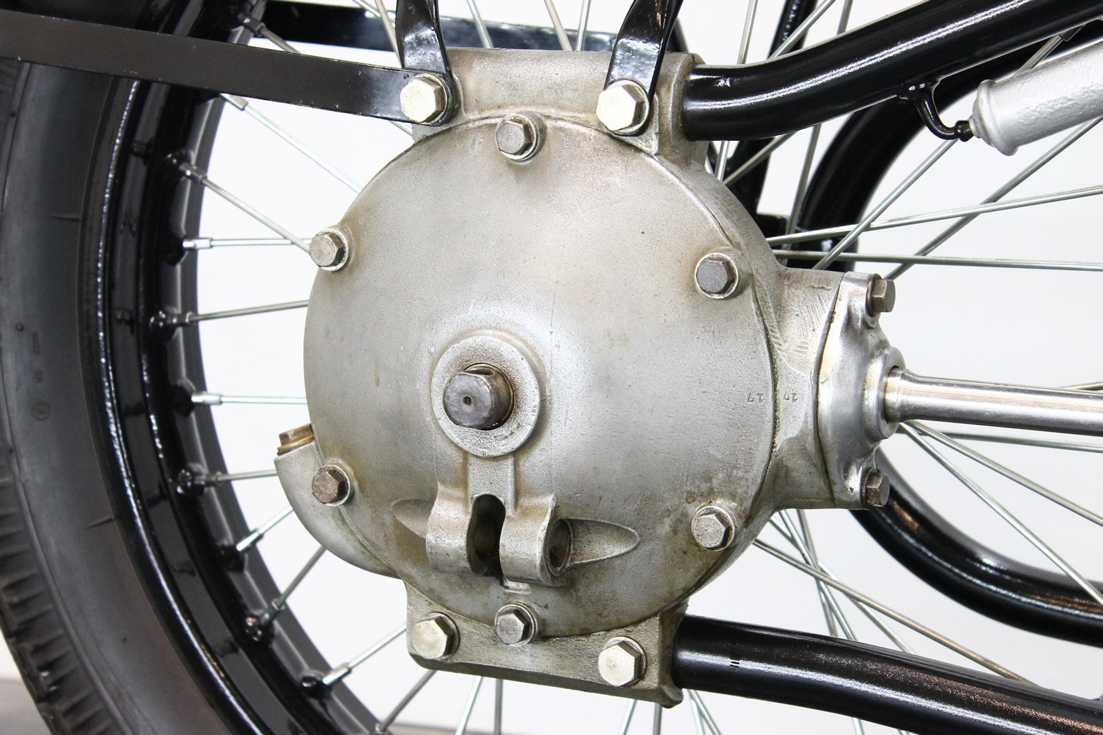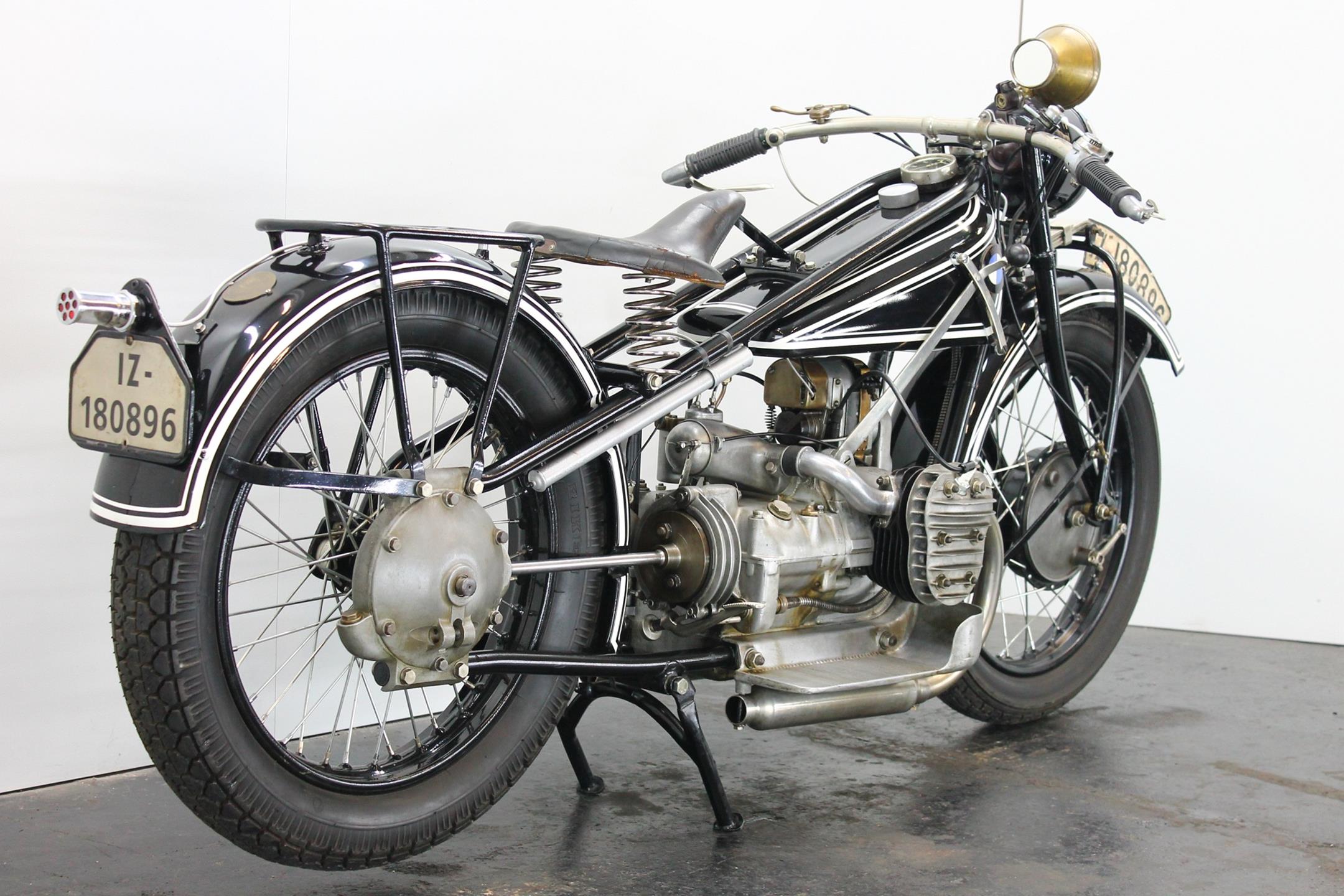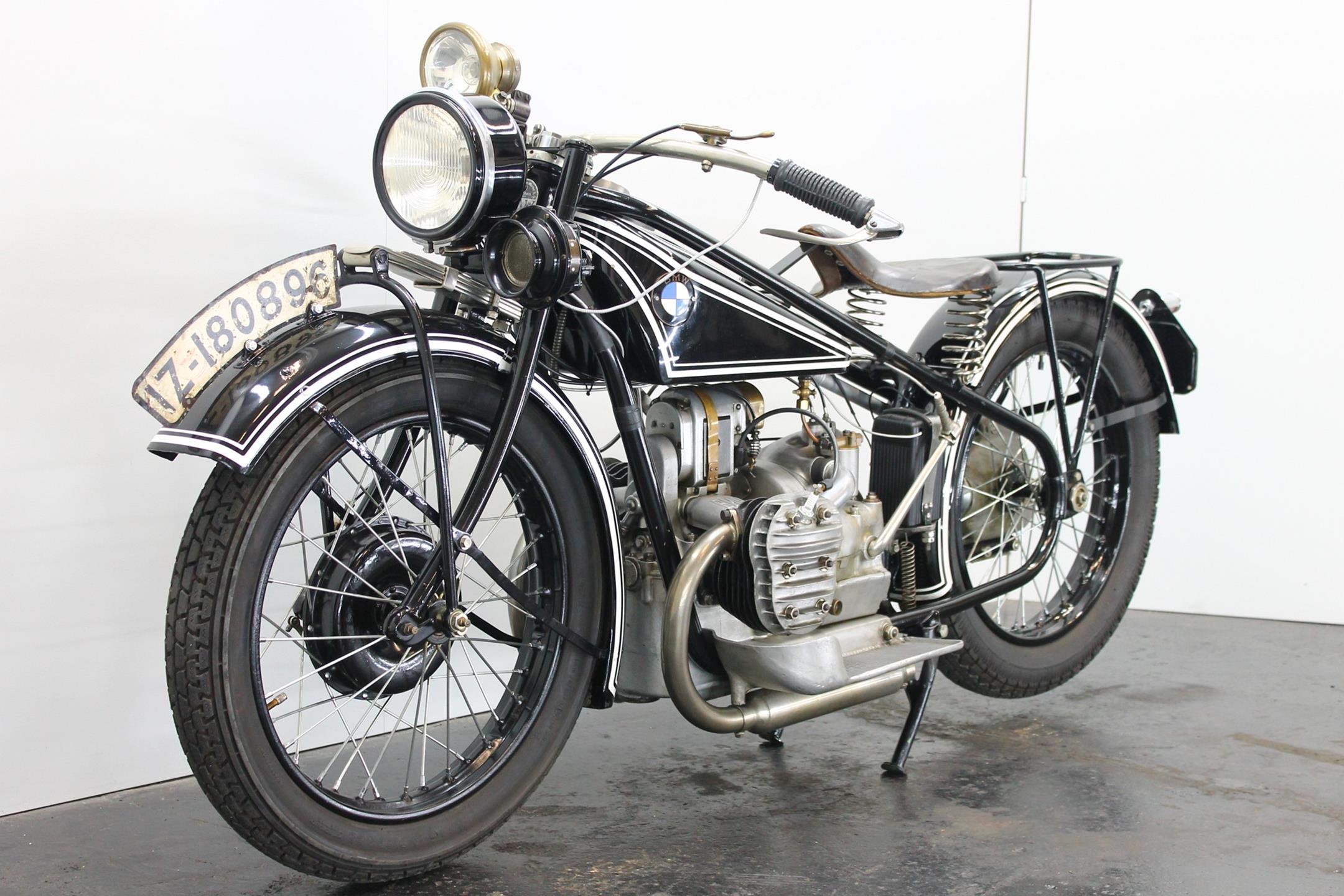 It was designer Max Fitz, forbidden by treaty from working on aircraft engines following World War I, who came up with the blueprint for BMW motorcycles that the company follows to this day, 90 years after the first R32 was produced. That first bike featured his now-familiar transverse-mounted "boxer" motor, its twin cylinders jutting out into the cooling breeze. Also present from the beginning was shaft final drive; BMW's attention to engineering and focus on solid build quality was already readily apparent. The R42, introduced three years later in 1926, moved the brand more firmly down the road to profitability and success. Its redesigned and more powerful 500cc engine, now with aggressively finned detachable alloy heads, made the bike a better tourer. With the engine repositioned in the frame for improved weight distribution, stronger, straighter front downtubes could be employed, sharpening the bike's handling. Braking too was improved; gone was the arcane block-and-pulley type rear brake, replaced by a drum on the driveshaft gripped by external contracting bands. Stylistically, the R32's quaint valanced fenders gave way to simpler, more modern looking sheetmetal. Despite the fact that all BMW two-wheelers built up to 1941 owe much to the R42, its production lasted just three years, making this rare Bimmer among the brand's most desirable and sought-after vintage machines. BMW catalogued the R42 for 1.510 Reichsmark.