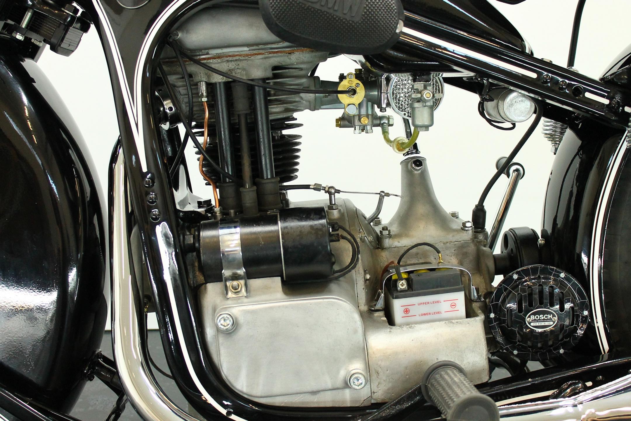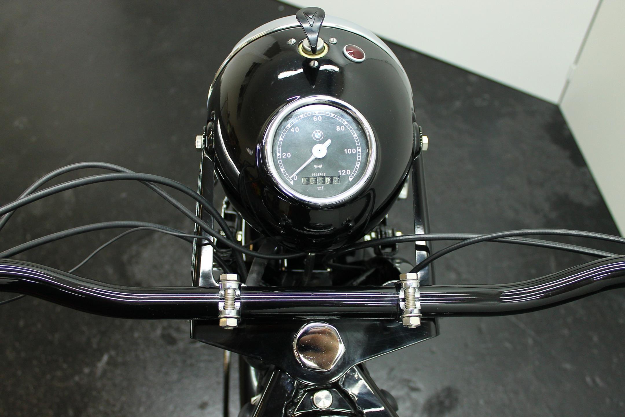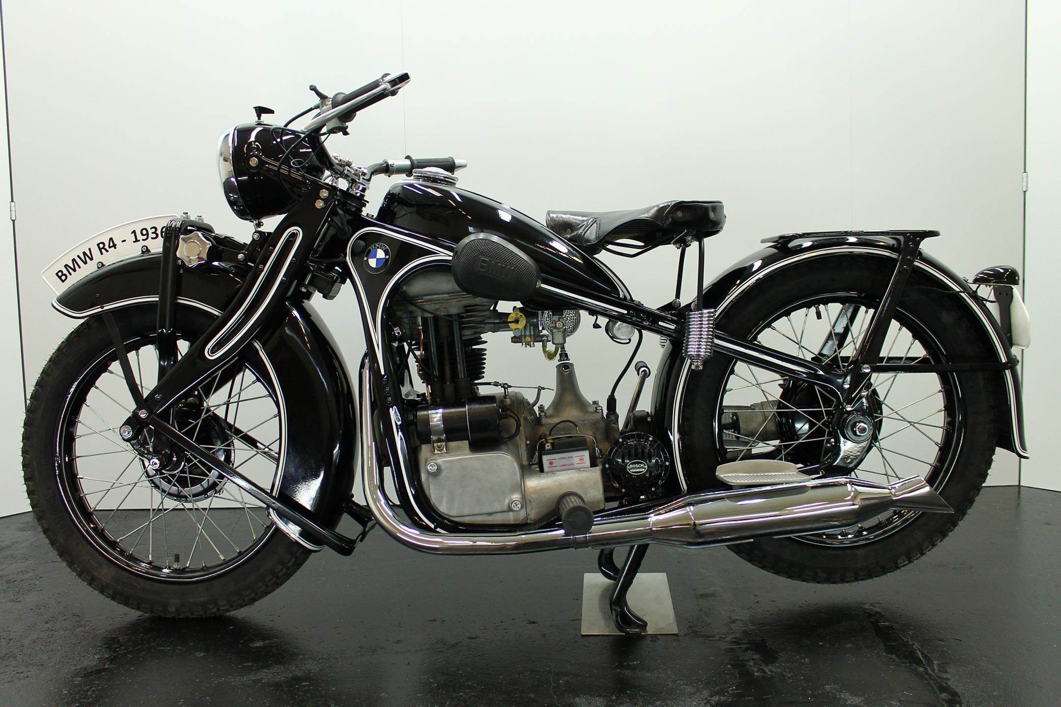 Introduced in 1932 and intended to bridge the gap between the 'budget' BMW R2 198cc single and the expensive twins, the R4 looked much like the former, whose channel-section steel frame and running gear it used almost unaltered. The 398cc overhead-valve engine featured enclosed valve gear and produced 12bhp, gaining an extra two horsepower in 1933 when the BMW R4 was updated to Series 2 specification with revised styling and a four-speed gearbox. A new cylinder head, tidier engine casings and changes to the toolbox and generator locations were introduced as the rugged R4 - a favourite with police forces and the German Army - progressed through to Series 5 before production ceased in 1936. BMW produced 15,295 R4 motorcycles using innovative mass production techniques, setting new standards of design and quality. Pressed steel frame and components were quick and easy to stamp out and assemble, reducing manufacturing costs.