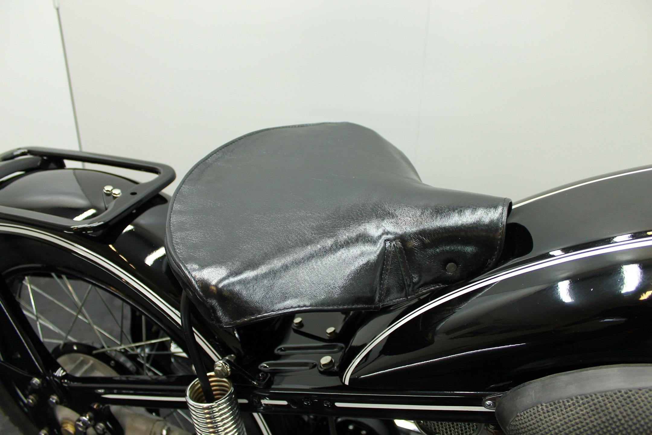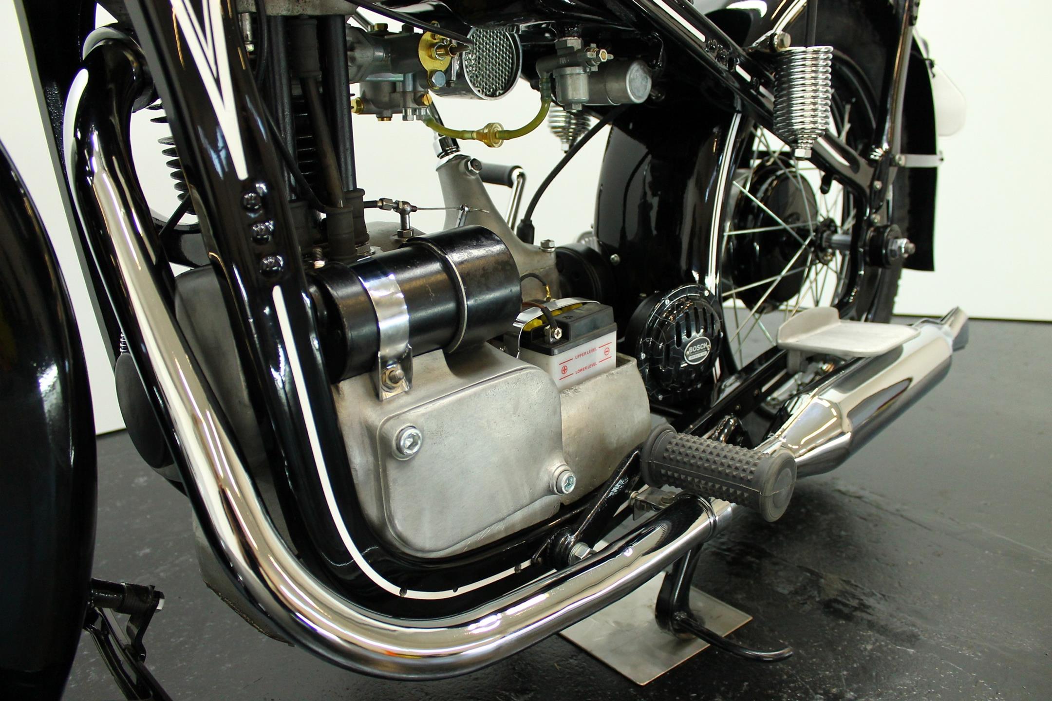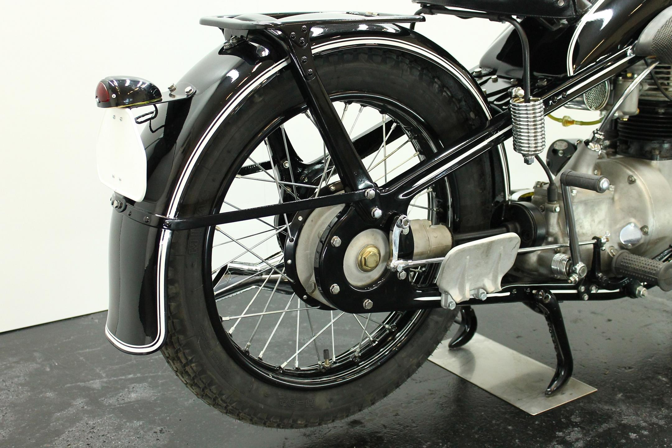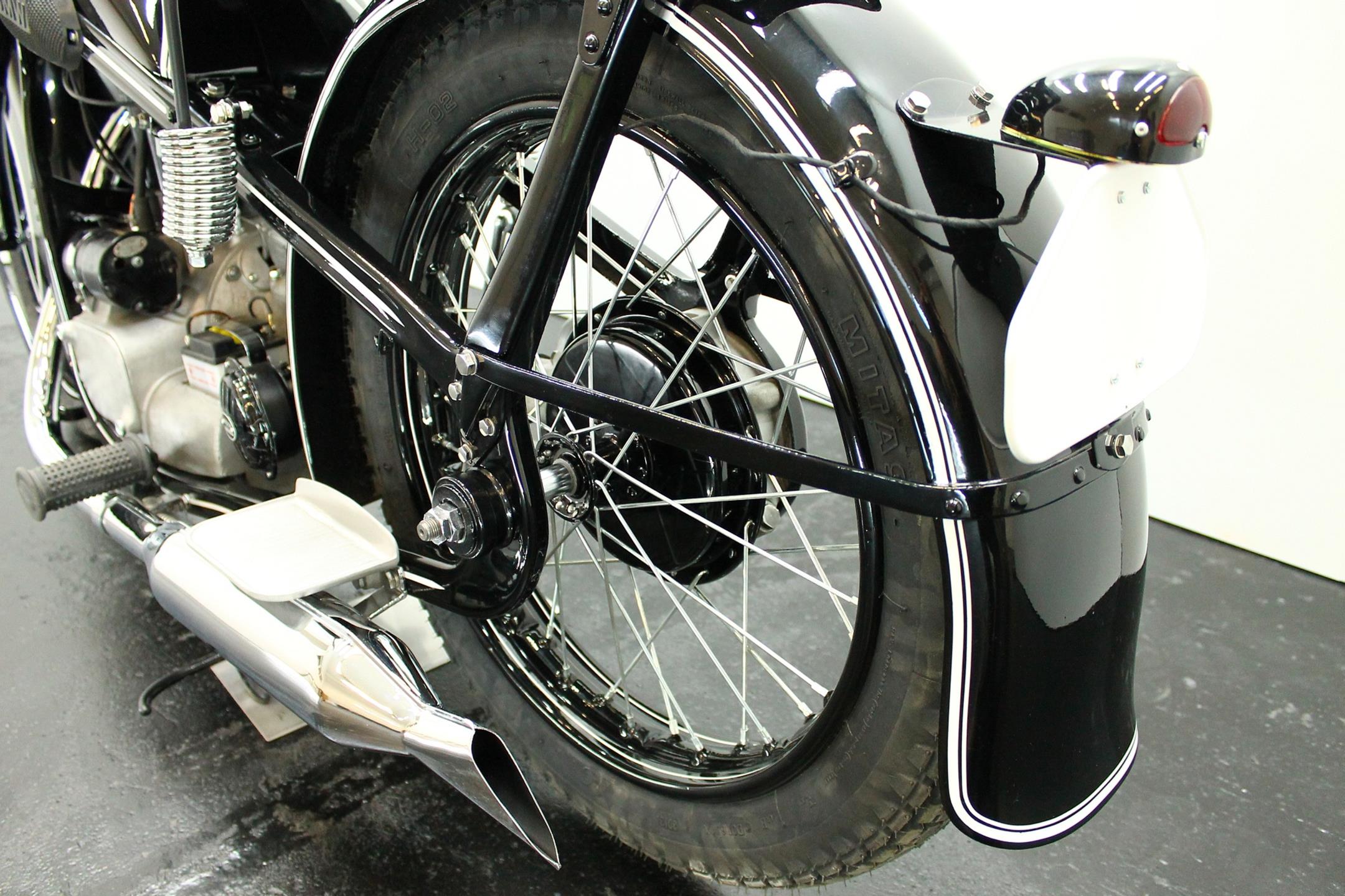 Introduced in 1932 and intended to bridge the gap between the 'budget' BMW R2 198cc single and the expensive twins, the R4 looked much like the former, whose channel-section steel frame and running gear it used almost unaltered. The 398cc overhead-valve engine featured enclosed valve gear and produced 12bhp, gaining an extra two horsepower in 1933 when the BMW R4 was updated to Series 2 specification with revised styling and a four-speed gearbox. A new cylinder head, tidier engine casings and changes to the toolbox and generator locations were introduced as the rugged R4 - a favourite with police forces and the German Army - progressed through to Series 5 before production ceased in 1936. BMW produced 15,295 R4 motorcycles using innovative mass production techniques, setting new standards of design and quality. Pressed steel frame and components were quick and easy to stamp out and assemble, reducing manufacturing costs.