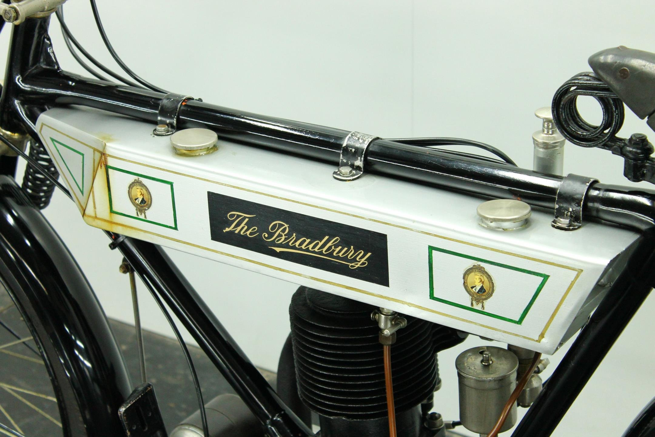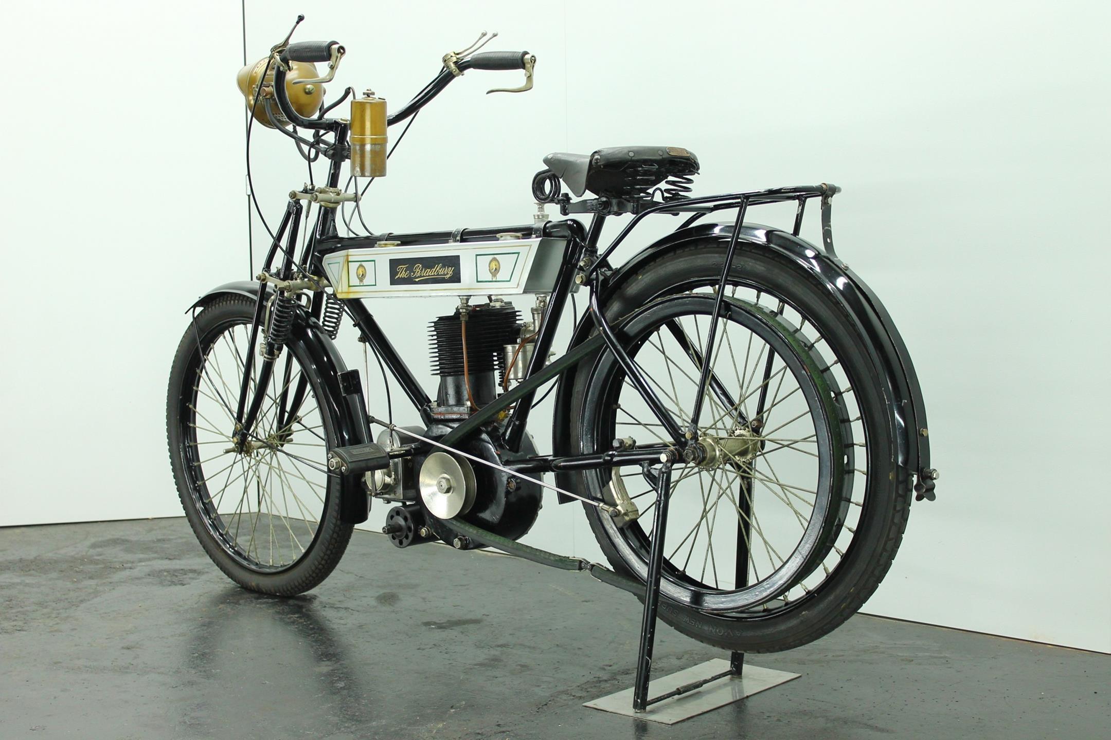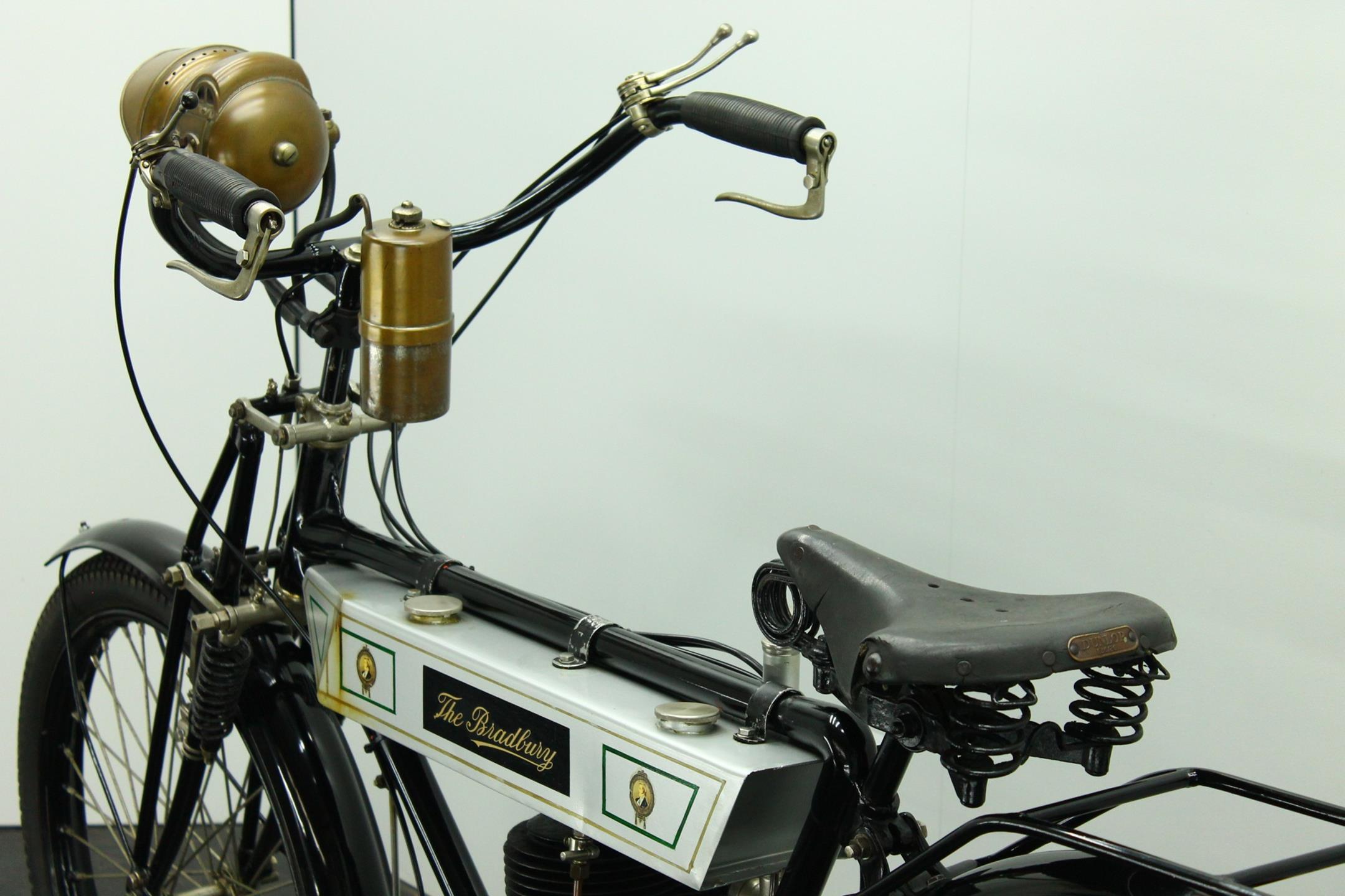 Bradbury & Co Ltd was founded in 1862. It was UK’s first and largest sewing machine manufacturer but Bradbury & Co. of Oldham started in 1852 as Britain’s and Europe’s first sewing machine manufacturer. The company then manufactured bicycles from 1895, and its first motorcycles were produced in 1902 as bicycles with clip-on Minerva engines. In the early 1900s diversified into making other things. These included prams, bicycles and eventually motorcycles. The company later produced single-cylinder, V-twin and horizontally-opposed-twin motorcycles. The main stay of the Bradbury motor cycle range was the 3½ h.p. single cylinder machine introduced in 1909. Year by year the models were improved: by 1908 both valves were mechanically operated, by 1910 the crankcase ran on ball bearings. In 1910 the Company announced that it had made considerable improvements in detail, finish and fittings to the 1909 Model and in 1911 the Company produced two versions - the Standard Model and the Speed Model.The only differences between the 1911 3 ½ h.p. Standard Model and that of the previous year were both wheels were fitted with Dunlop Rubber studded non skid tyres and the saddle was change to Brooks' B 104/4 padded. In 1912 the 3½hp Bradbury employed a single-cylinder sidevalve engine of 554cc and could be ordered in single-gear belt-driven form or with the refinements of hub gears and chain drive. Perhaps the model's most unusual feature was a crankcase integral with the frame 'ensuring better balance, greater strength and rigidity'. The 1912 Bradbury motorcycles were one of the earliest with variable gearing. Although the factory survived the First World War it closed in 1924.