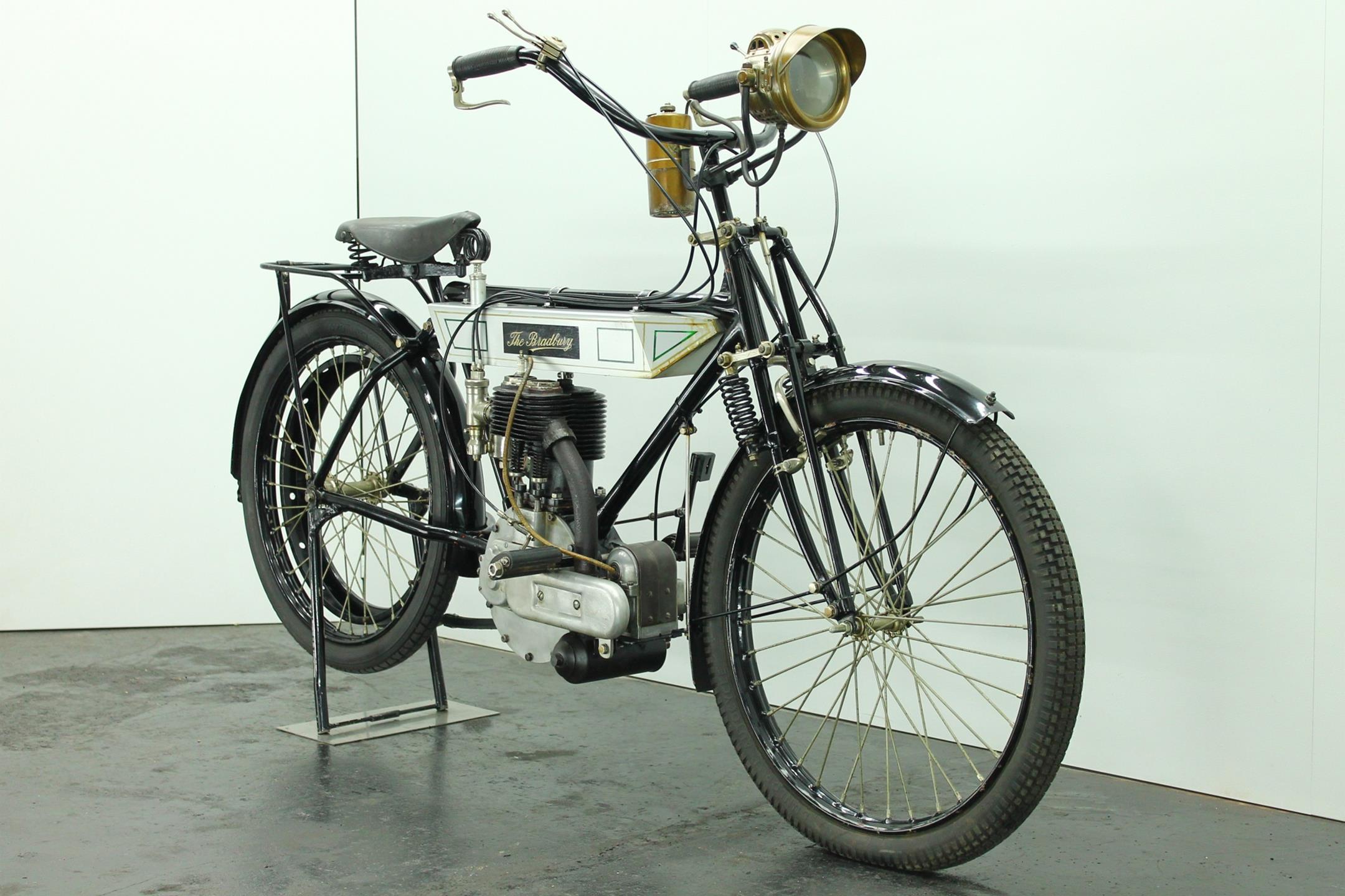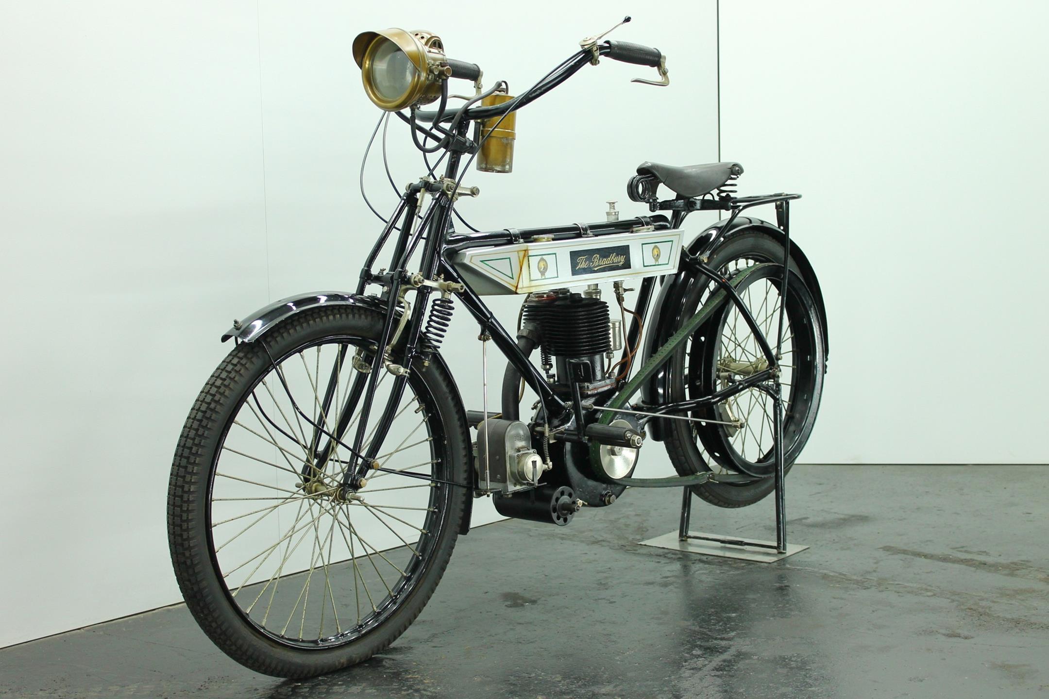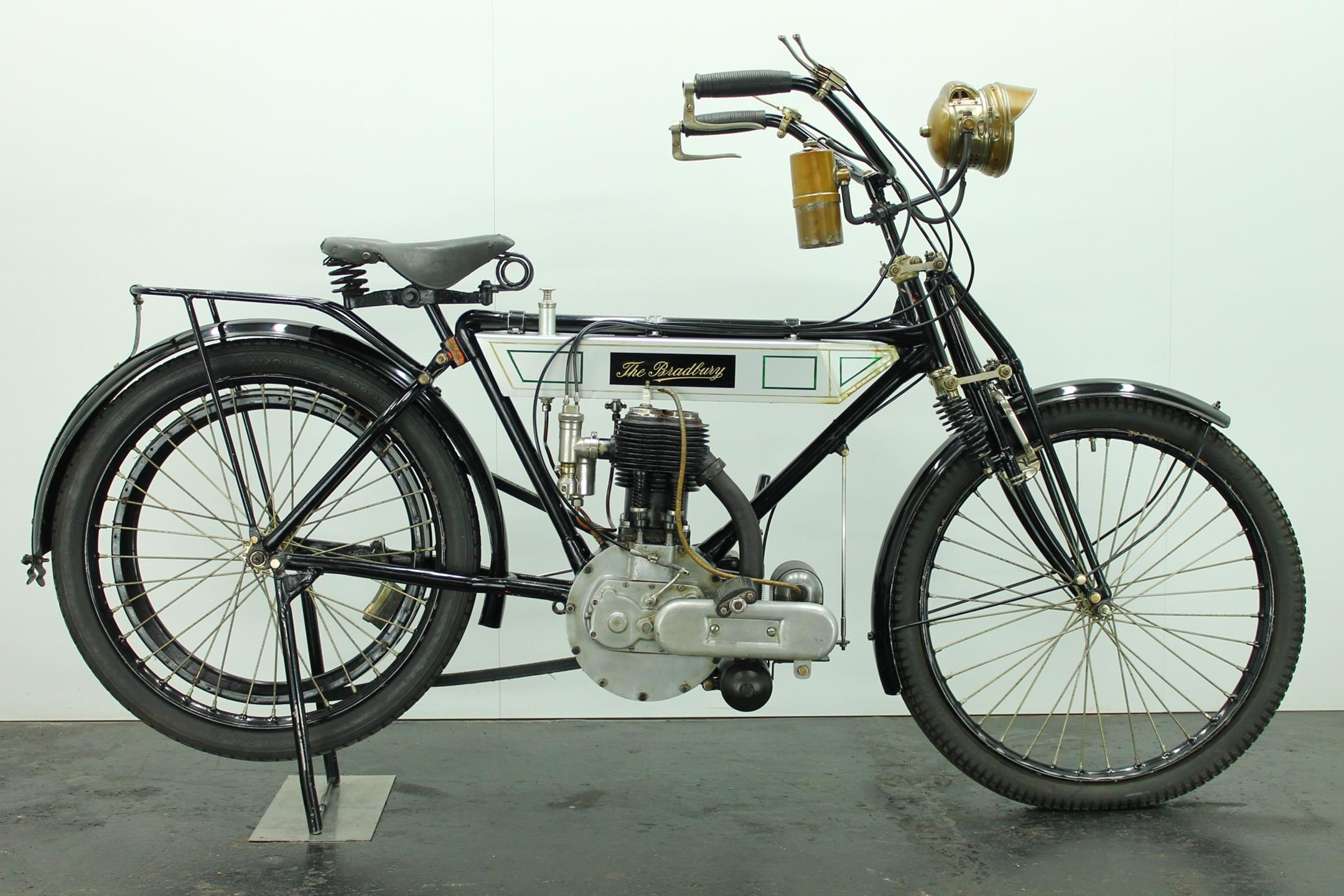 Bradbury & Co Ltd was founded in 1862. It was UK’s first and largest sewing machine manufacturer but Bradbury & Co. of Oldham started in 1852 as Britain’s and Europe’s first sewing machine manufacturer. The company then manufactured bicycles from 1895, and its first motorcycles were produced in 1902 as bicycles with clip-on Minerva engines. In the early 1900s diversified into making other things. These included prams, bicycles and eventually motorcycles. The company later produced single-cylinder, V-twin and horizontally-opposed-twin motorcycles. The main stay of the Bradbury motor cycle range was the 3½ h.p. single cylinder machine introduced in 1909. Year by year the models were improved: by 1908 both valves were mechanically operated, by 1910 the crankcase ran on ball bearings. In 1910 the Company announced that it had made considerable improvements in detail, finish and fittings to the 1909 Model and in 1911 the Company produced two versions - the Standard Model and the Speed Model.The only differences between the 1911 3 ½ h.p. Standard Model and that of the previous year were both wheels were fitted with Dunlop Rubber studded non skid tyres and the saddle was change to Brooks' B 104/4 padded. In 1912 the 3½hp Bradbury employed a single-cylinder sidevalve engine of 554cc and could be ordered in single-gear belt-driven form or with the refinements of hub gears and chain drive. Perhaps the model's most unusual feature was a crankcase integral with the frame 'ensuring better balance, greater strength and rigidity'. The 1912 Bradbury motorcycles were one of the earliest with variable gearing. Although the factory survived the First World War it closed in 1924.