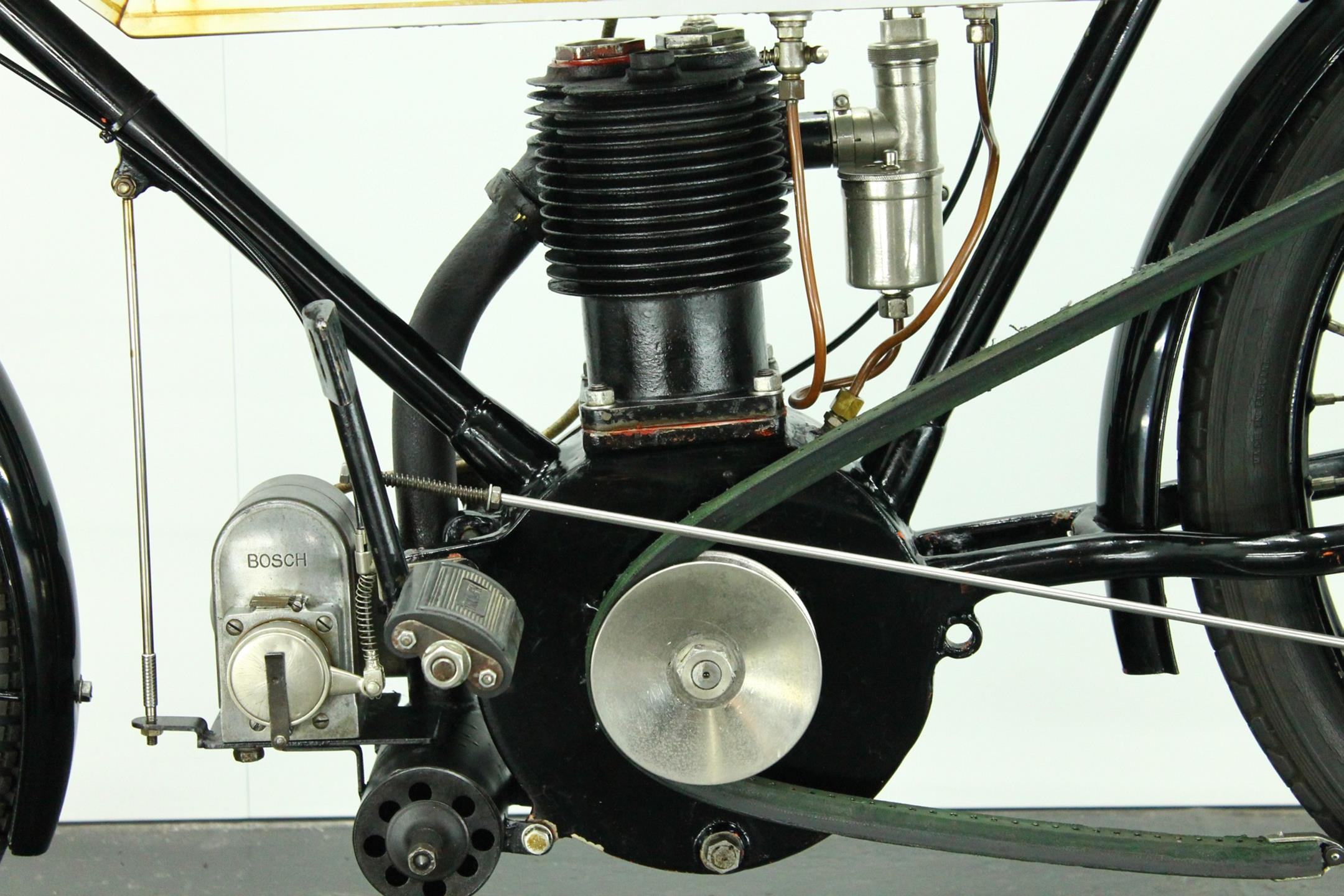 This rare and authentic survivor is fitted with a Brown and Barlow carburetor, Powell and Hanmer headlight and a Bosch magneto. It's an older restoration and a good runner.