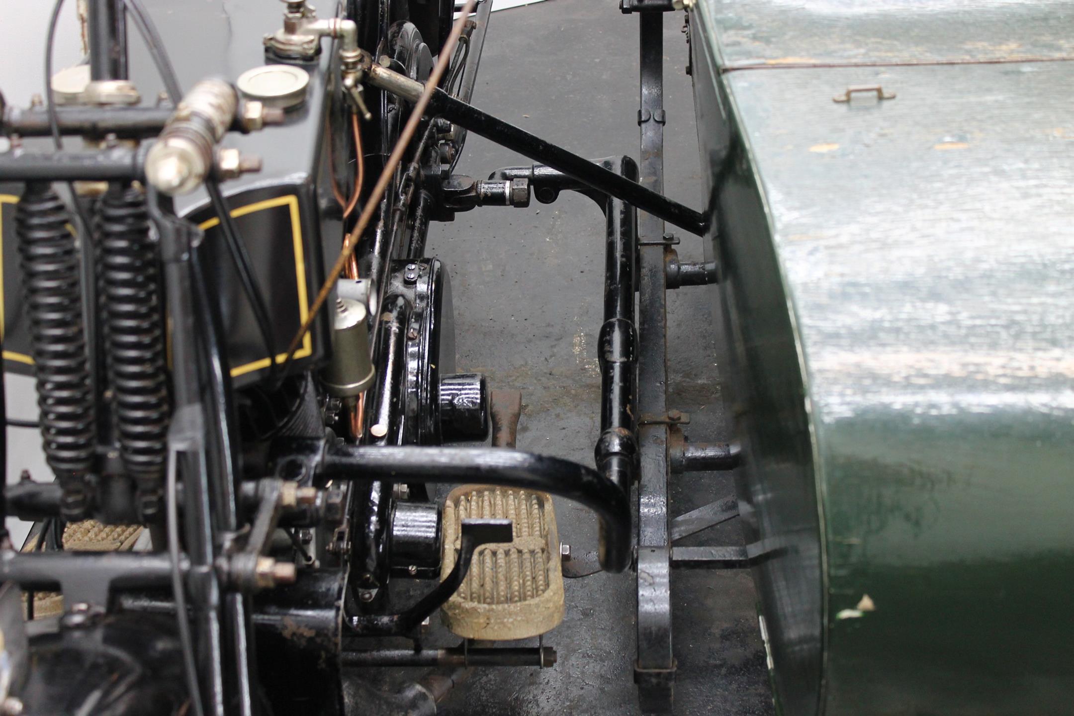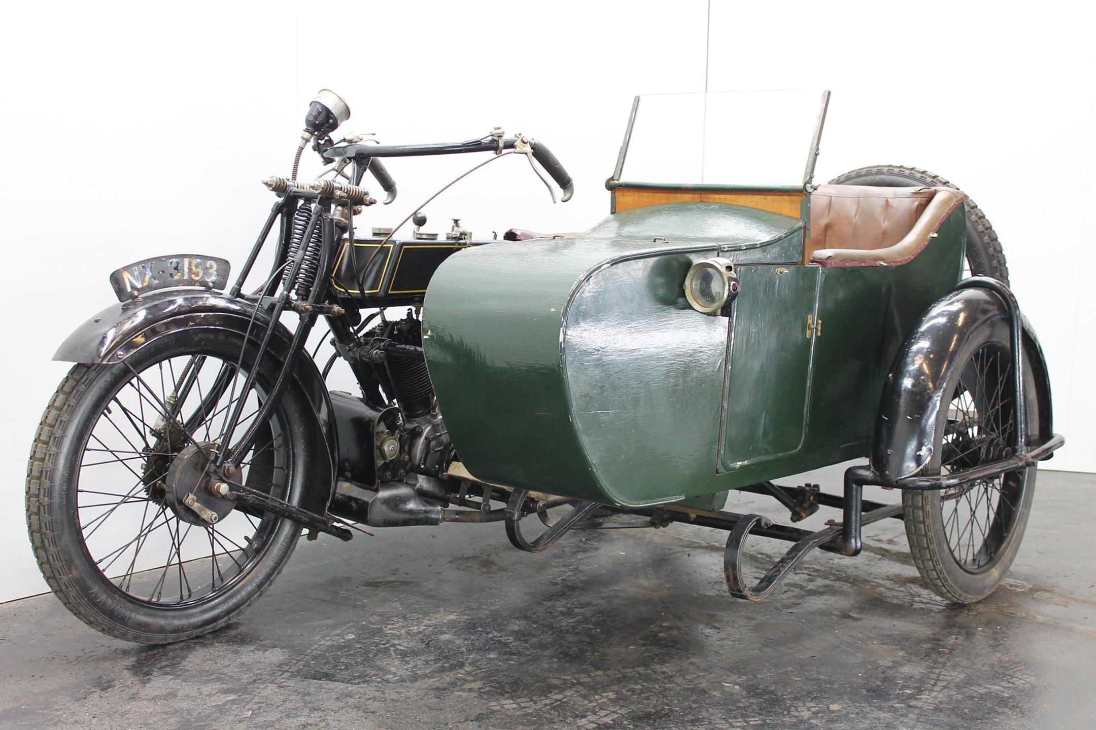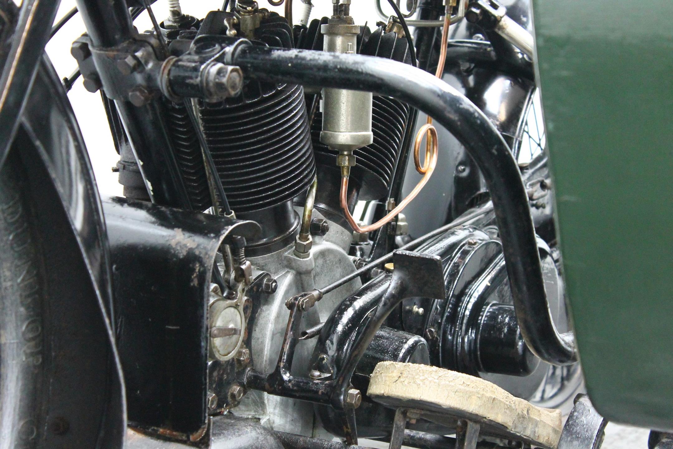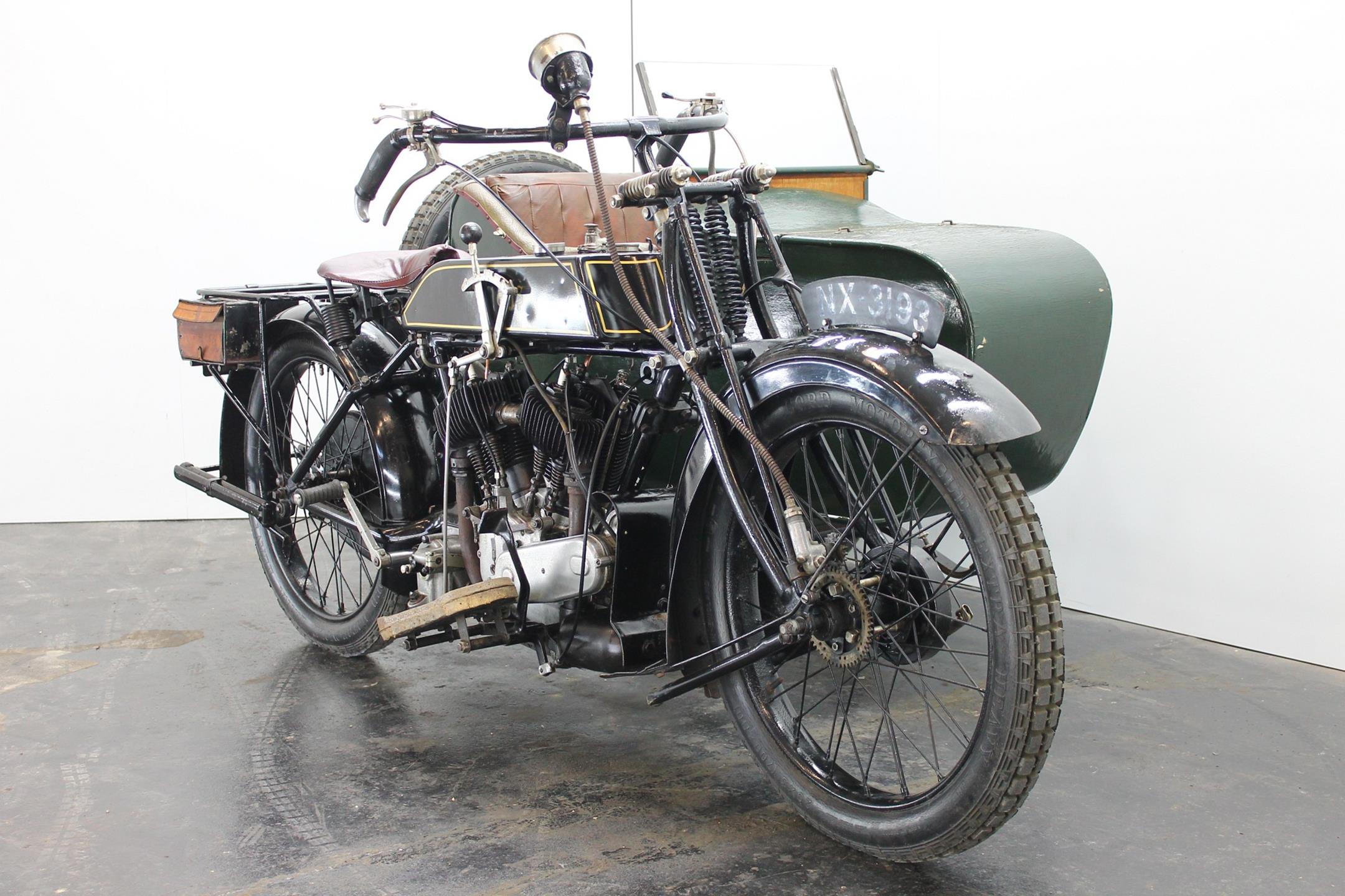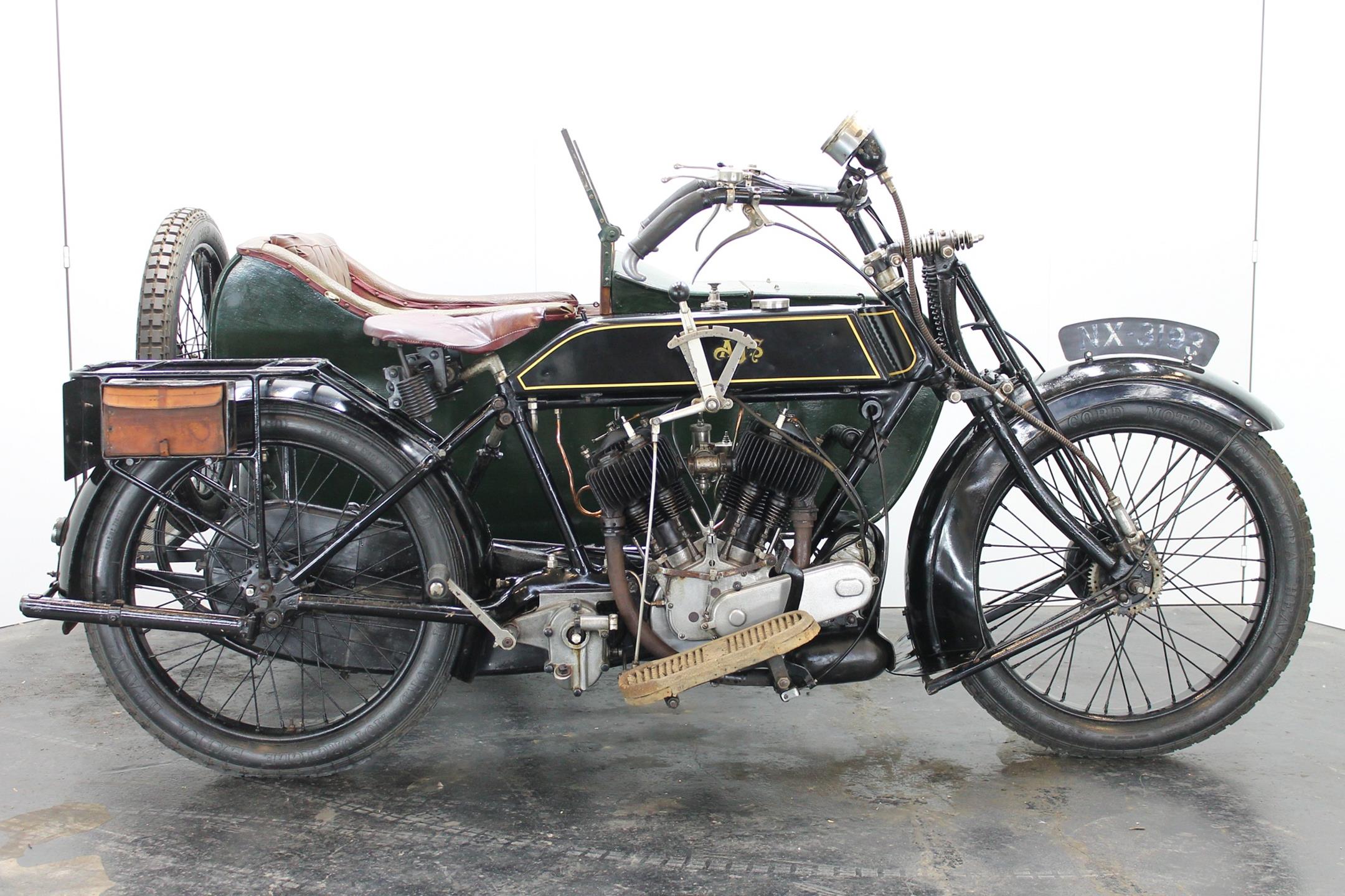 This comfortable 1924 AJS combination is fitted with a Amac carburetor, Smiths speedo, Thompson Bennet magneto and a spare wheel on the sidecar. This 800cc V-twin bears a lot of patina and is lovely running condition.