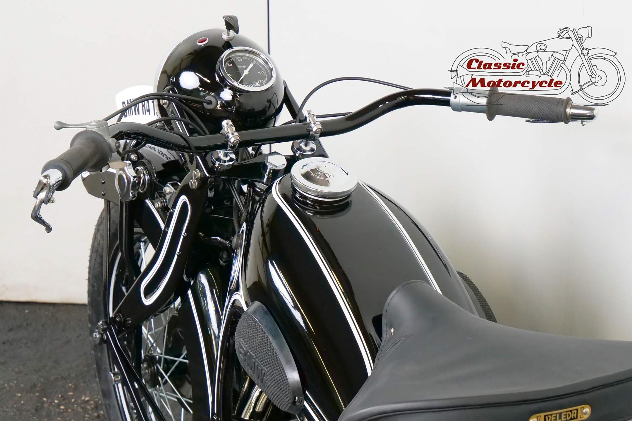 Introduced in 1932 and intended to bridge the gap between the 'budget' BMW R2 198cc single and the expensive twins, the R4 looked much like the former, whose channel-section steel frame and running gear it used almost unaltered. The 398cc overhead-valve engine featured enclosed valve gear and produced 12bhp, gaining an extra two horsepower in 1933 when the BMW R4 was updated to Series 2 specification with revised styling and a four-speed gearbox. A new cylinder head, tidier engine casings and changes to the toolbox and generator locations were introduced as the rugged R4 - a favourite with police forces and the German Army - progressed through to Series 5 before production ceased in 1936. BMW produced 15,295 R4 motorcycles using innovative mass production techniques, setting new standards of design and quality. Pressed steel frame and components were quick and easy to stamp out and assemble, reducing manufacturing costs.