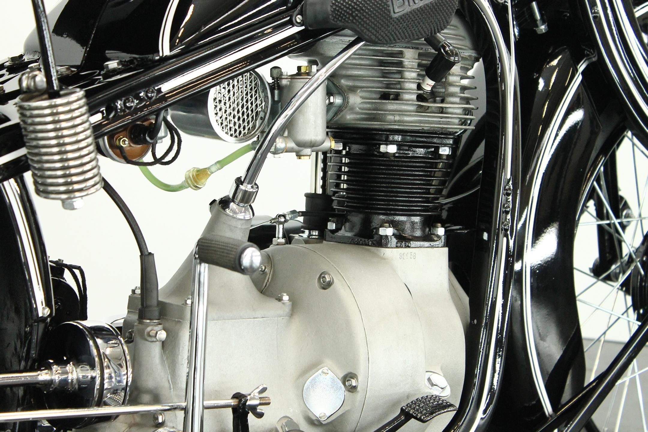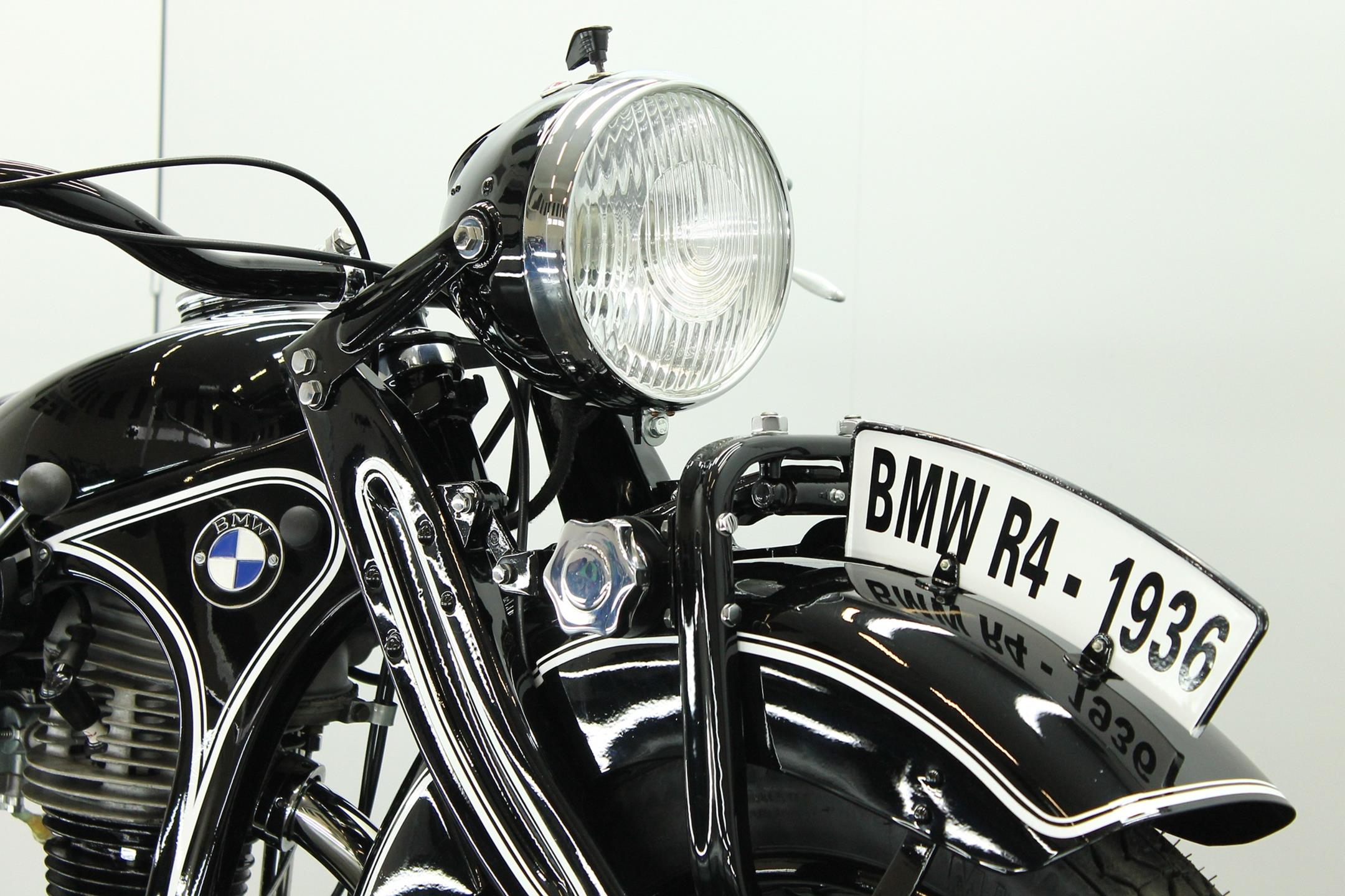 Introduced in 1932 and intended to bridge the gap between the 'budget' BMW R2 198cc single and the expensive twins, the R4 looked much like the former, whose channel-section steel frame and running gear it used almost unaltered. The 398cc overhead-valve engine featured enclosed valve gear and produced 12bhp, gaining an extra two horsepower in 1933 when the BMW R4 was updated to Series 2 specification with revised styling and a four-speed gearbox. A new cylinder head, tidier engine casings and changes to the toolbox and generator locations were introduced as the rugged R4 - a favourite with police forces and the German Army - progressed through to Series 5 before production ceased in 1936. BMW produced 15,295 R4 motorcycles using innovative mass production techniques, setting new standards of design and quality. Pressed steel frame and components were quick and easy to stamp out and assemble, reducing manufacturing costs.
