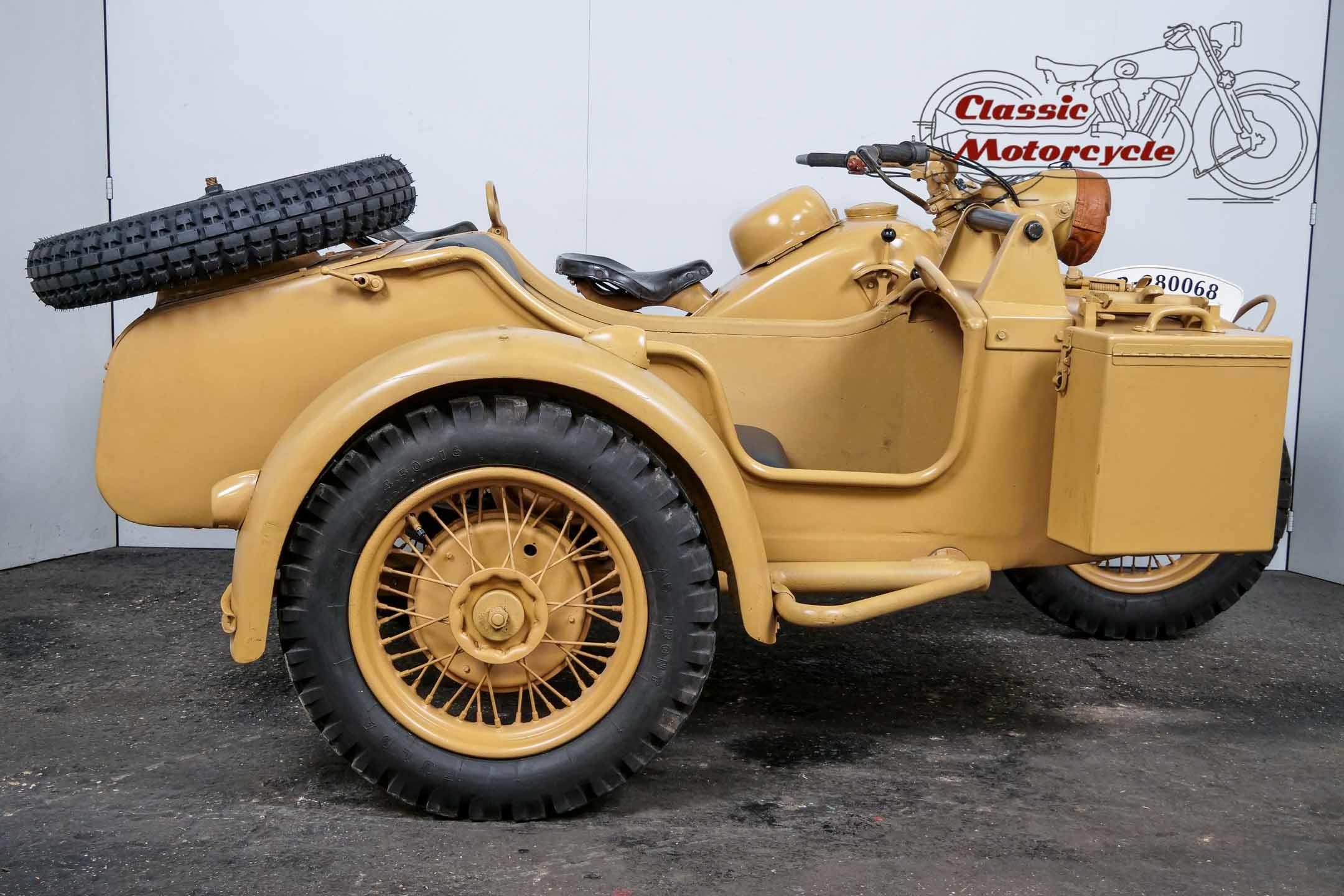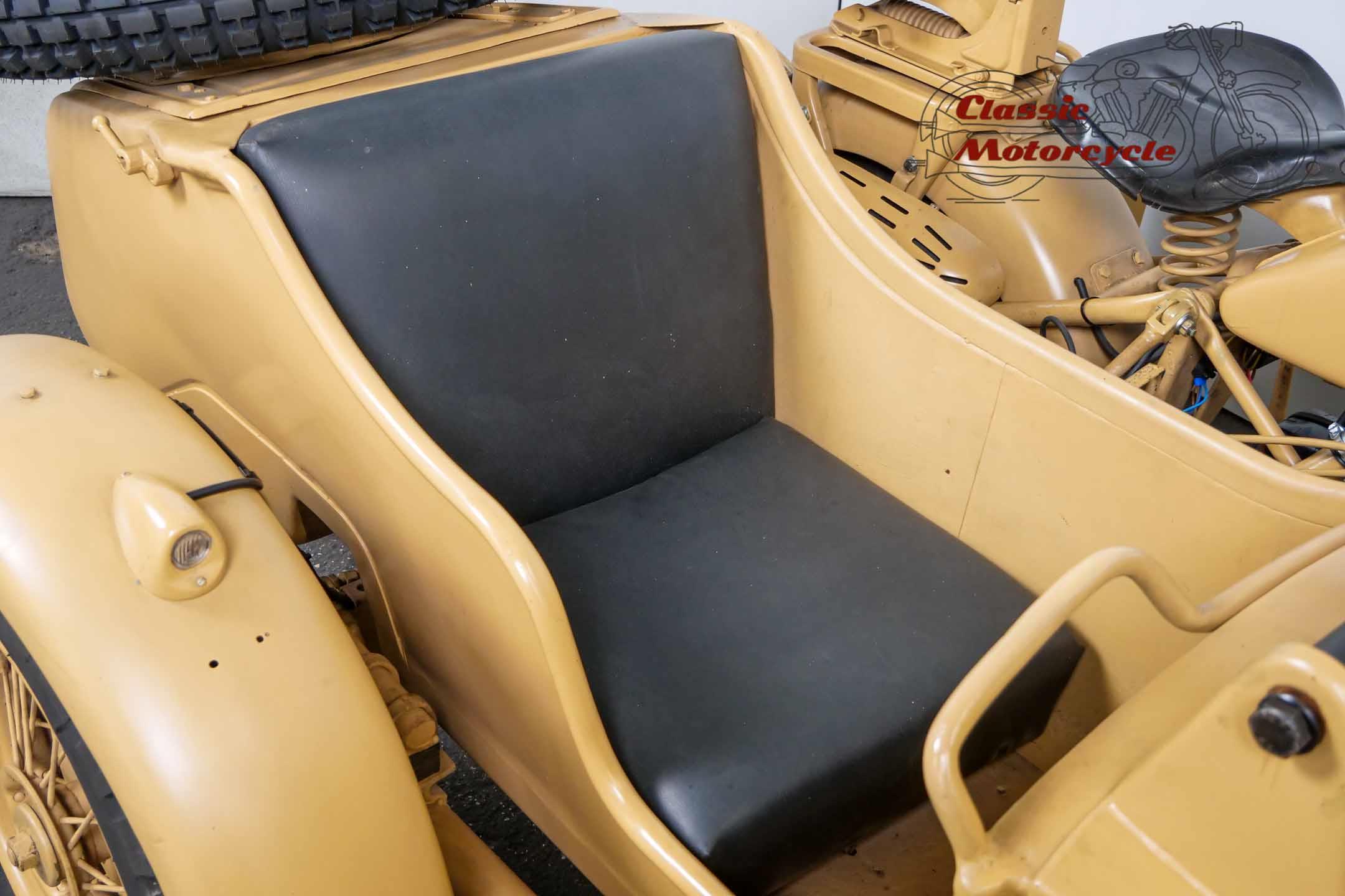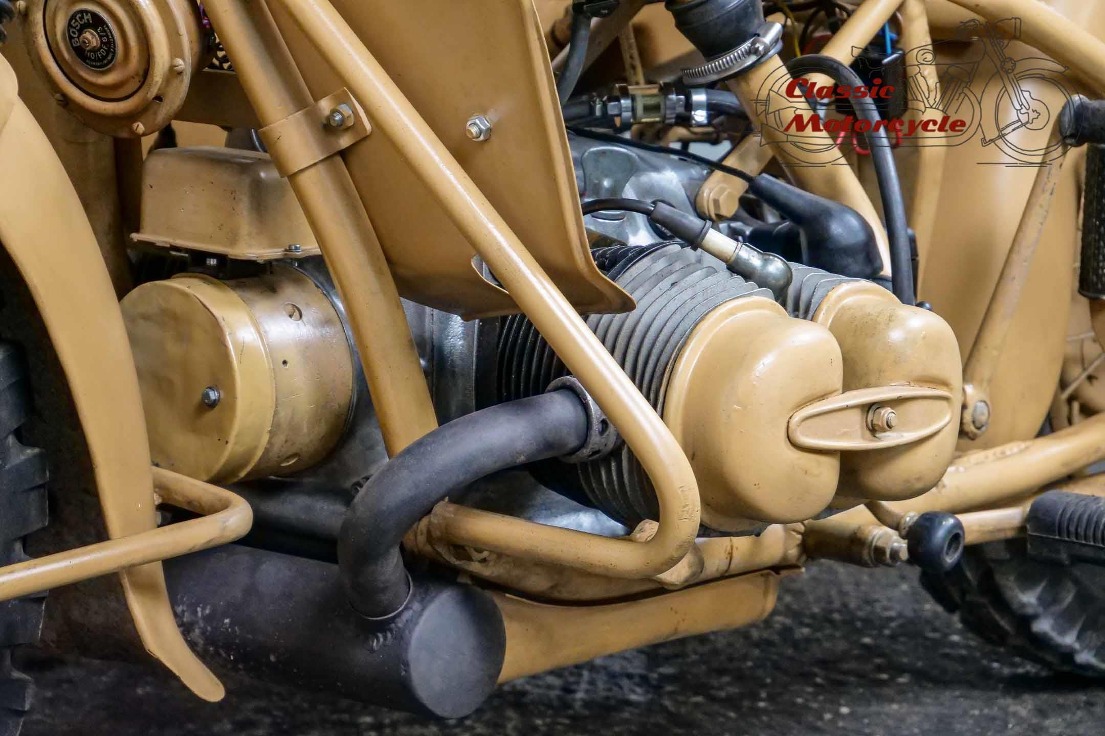 The R75 represented the spearhead of the super-heavy combinations at BMW. The construction was intended exclusively for hard wartime use. Accordingly, the machines were considered very robust and almost indestructible. This piece of war history was produced on June 15, 1943 and delivered to the Army Stuff Office in Chemnitz, Germany, on the same day. The crankshaft was completely overhauled last year. Nothing stands in the way of a longer trip. The R75 is ready to drive.