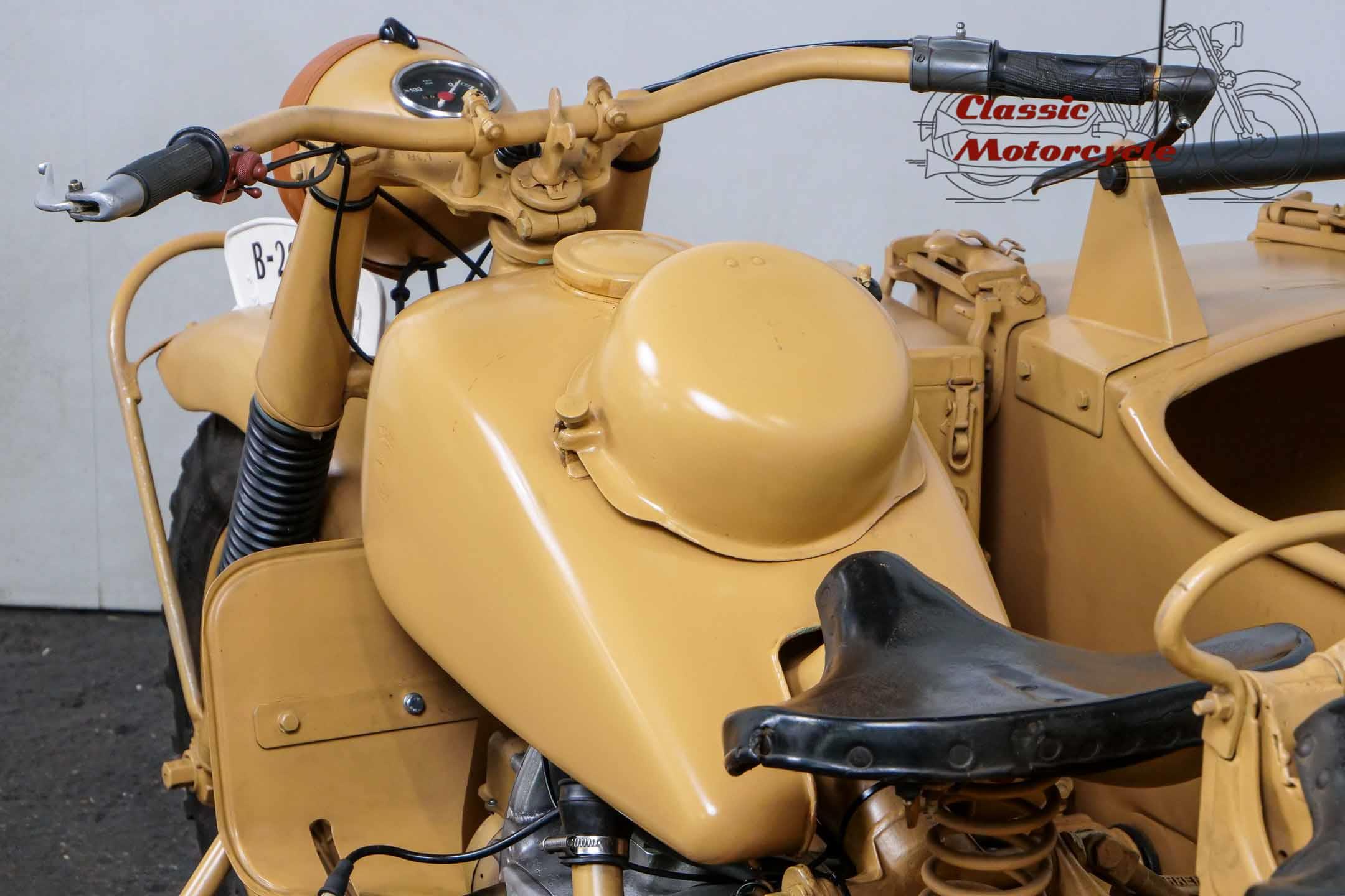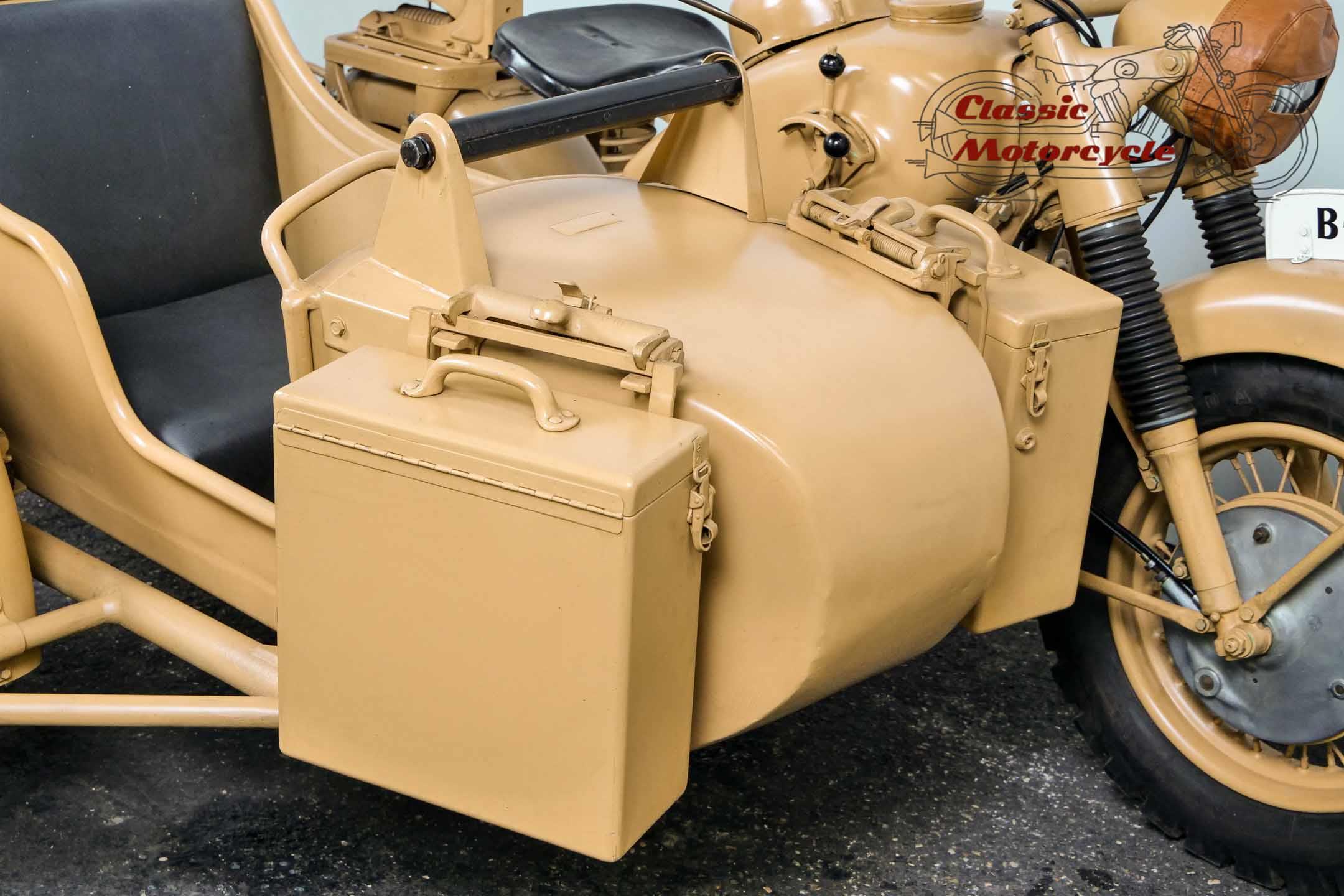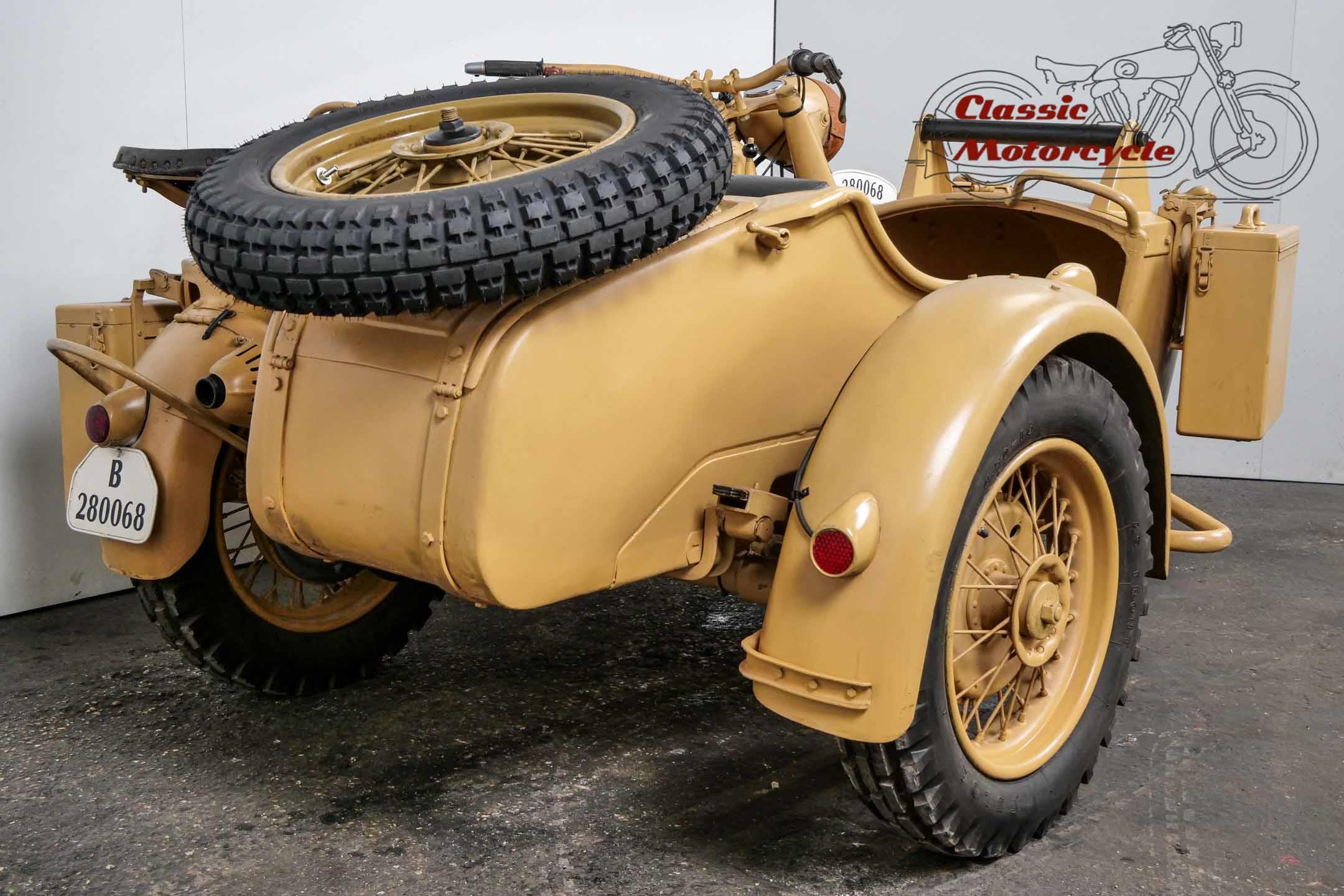 The R75 represented the spearhead of the super-heavy combinations at BMW. The construction was intended exclusively for hard wartime use. Accordingly, the machines were considered very robust and almost indestructible. This piece of war history was produced on June 15, 1943 and delivered to the Army Stuff Office in Chemnitz, Germany, on the same day. The crankshaft was completely overhauled last year. Nothing stands in the way of a longer trip. The R75 is ready to drive.