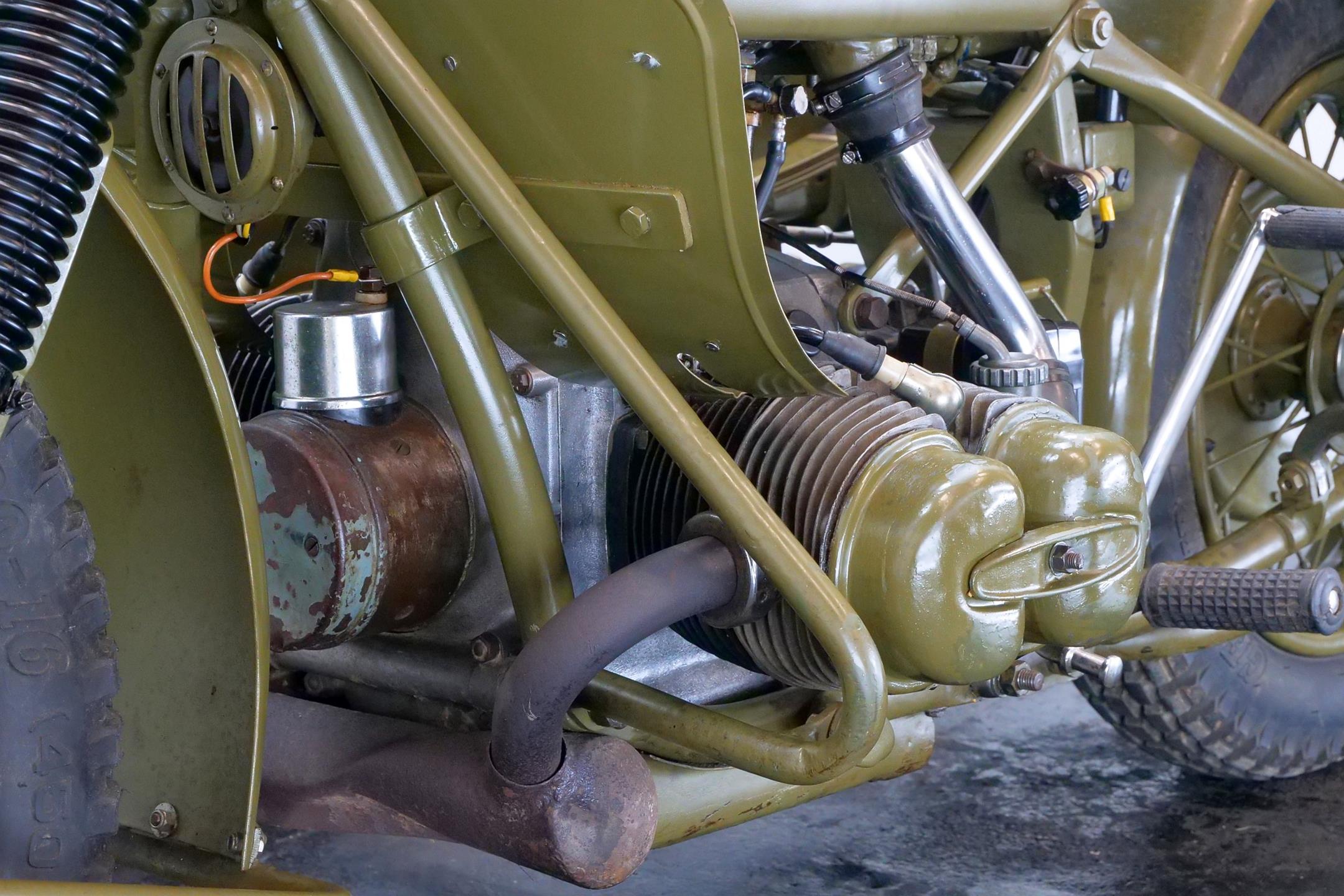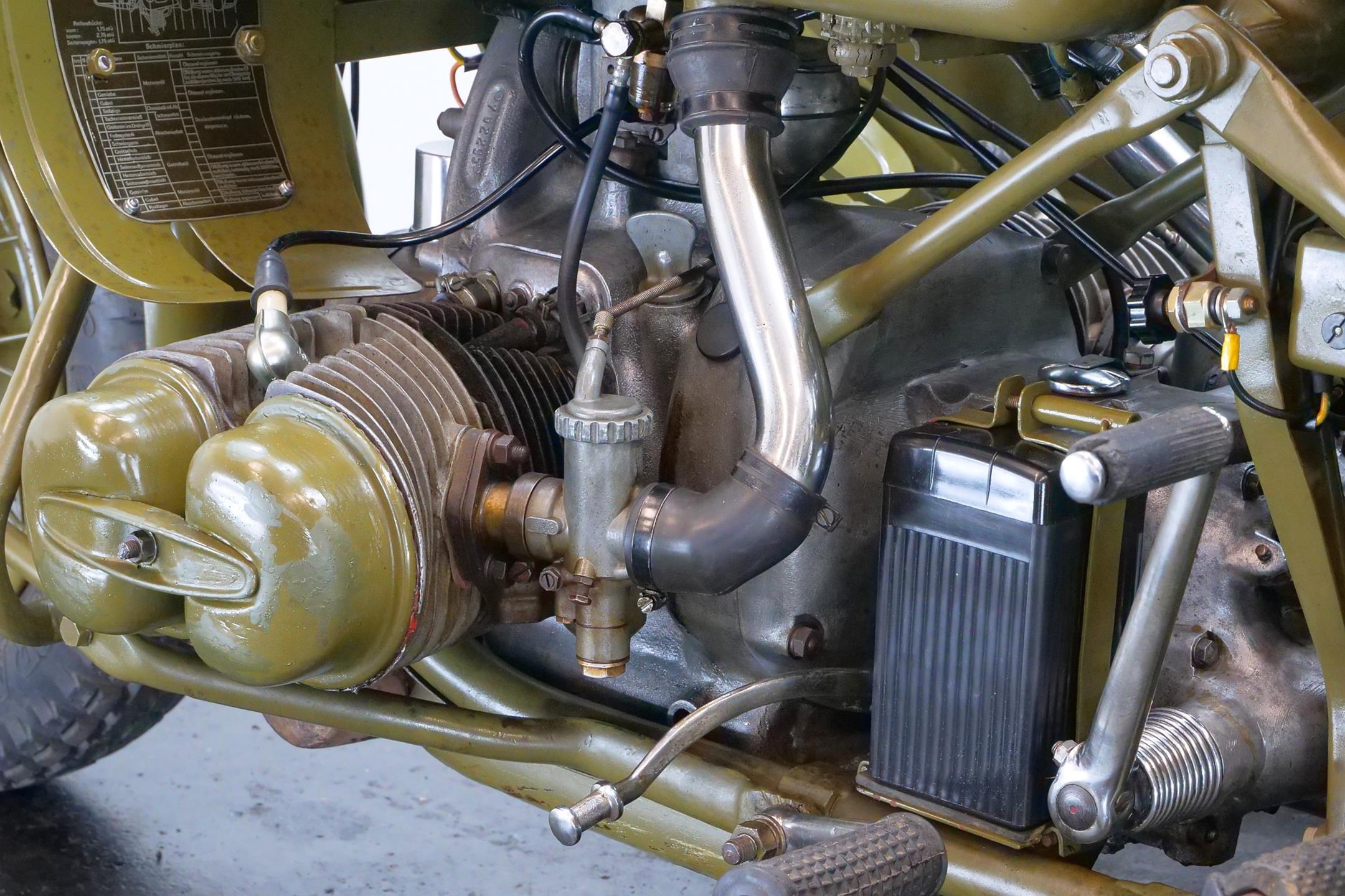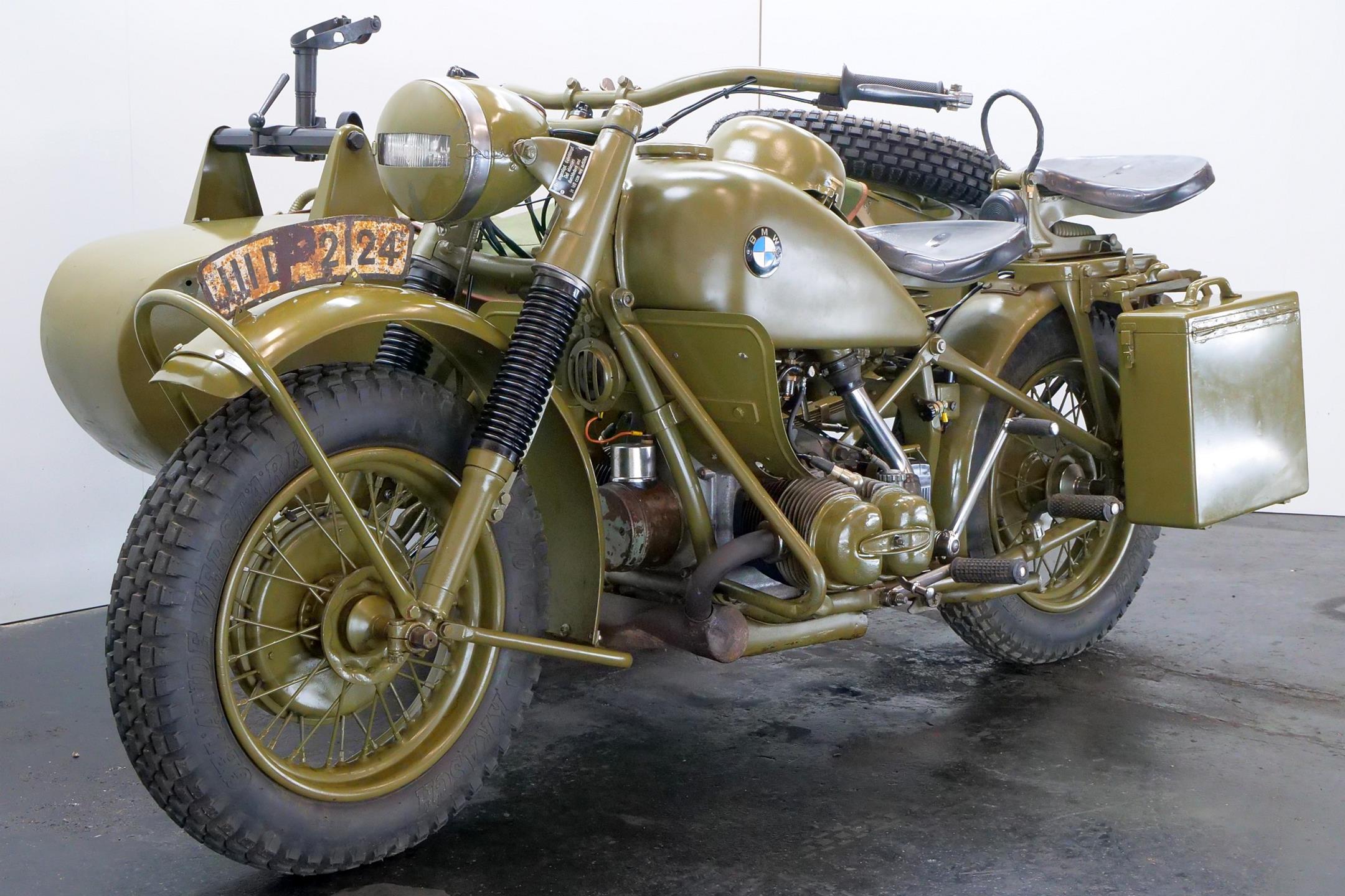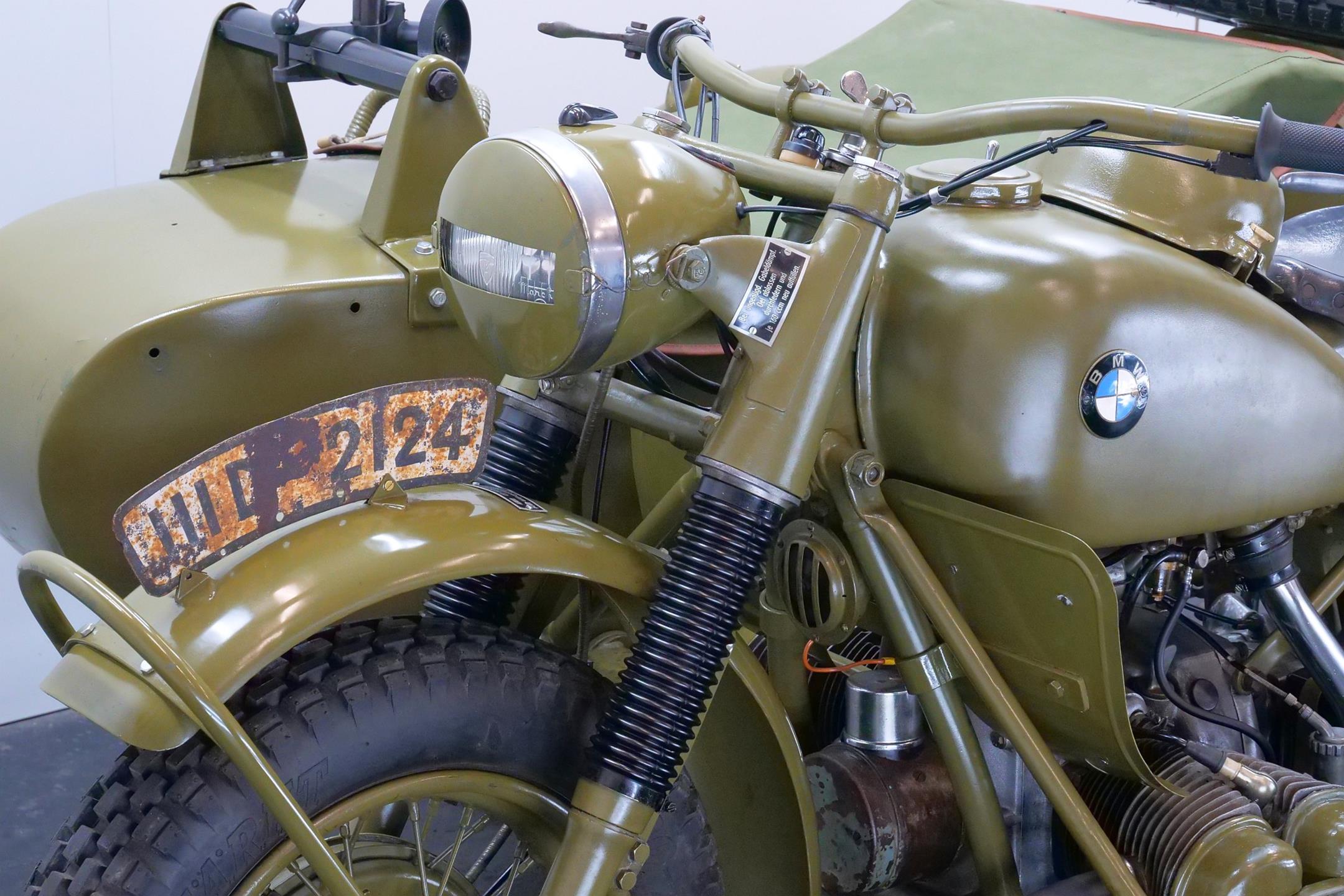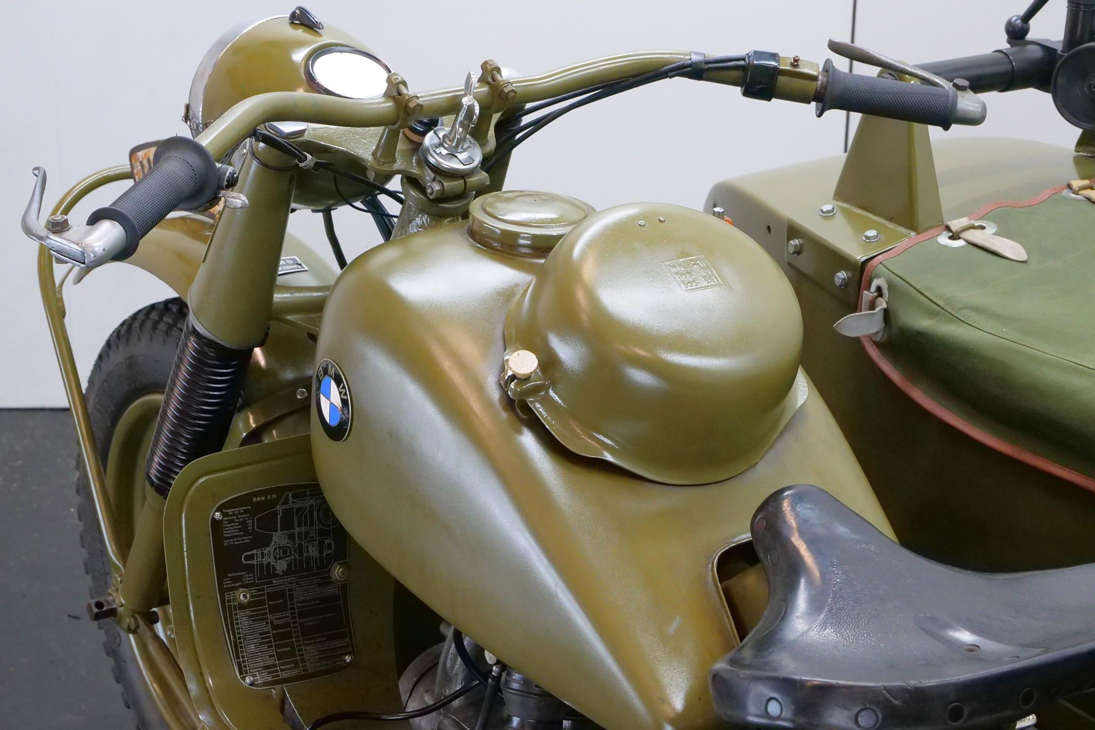 Preproduction models of the R75 were powered by a 750 cc side valve engine, which was based on the R71 engine. However it was quickly found necessary to design an all-new OHV 750 cc engine for the R75 unit. This OHV engine later proved to be the basis for subsequent post-war twin BMW engines like the R51/3, R67 and R68.The third side-car wheel was driven with an axle connected to the rear wheel of the motorcycle. These were fitted with a locking differential and selectable road and off-road gear ratios through which all four and reverse gears worked. This made the R75 highly manoeuvrable and capable of negotiating most surfaces. A few other motorcycle manufactures, like FN and Norton, provided an optional drive to sidecars. The BMW R75 and its rival the Zündapp KS 750 were both widely used by the Wehrmacht in Russia and North Africa, though after a period of evaluation it became clear that the Zündapp was the superior machine. In August 1942 Zündapp and BMW, on the urging of the Army, agreed upon standardization of parts for both machines, with a view of eventually creating a Zündapp-BMW hybrid (designated the BW 43), in which a BMW 286/1 side-car would be grafted onto a Zündapp KS 750 motorcycle. They also agreed that the manufacture of the R75 would cease once production reached 20,200 units, and after that point BMW and Zündapp would only produce the Zündapp-BMW machine, manufacturing 20,000 each year. Since the target of 20,200 BMW R75's was not reached, it remained in production until the Eisenach factory was so badly damaged by Allied bombing that production ceased in 1944. A further 98 units were assembled by the Soviets in 1946 as reparations. However the standardisation programme meant that machines that were produced by BMW and Zündapp used 70% of the same components. This simplifies the supply of spare parts for these vehicles, many of which are still in the hands of historic motorcycle enthusiasts. These vehicles are still highly desirable as collector's items because of their complex and durable technology, and are correspondingly expensive. A well-restored R75 can be still used for everyday purposes, on or off-road without problems.