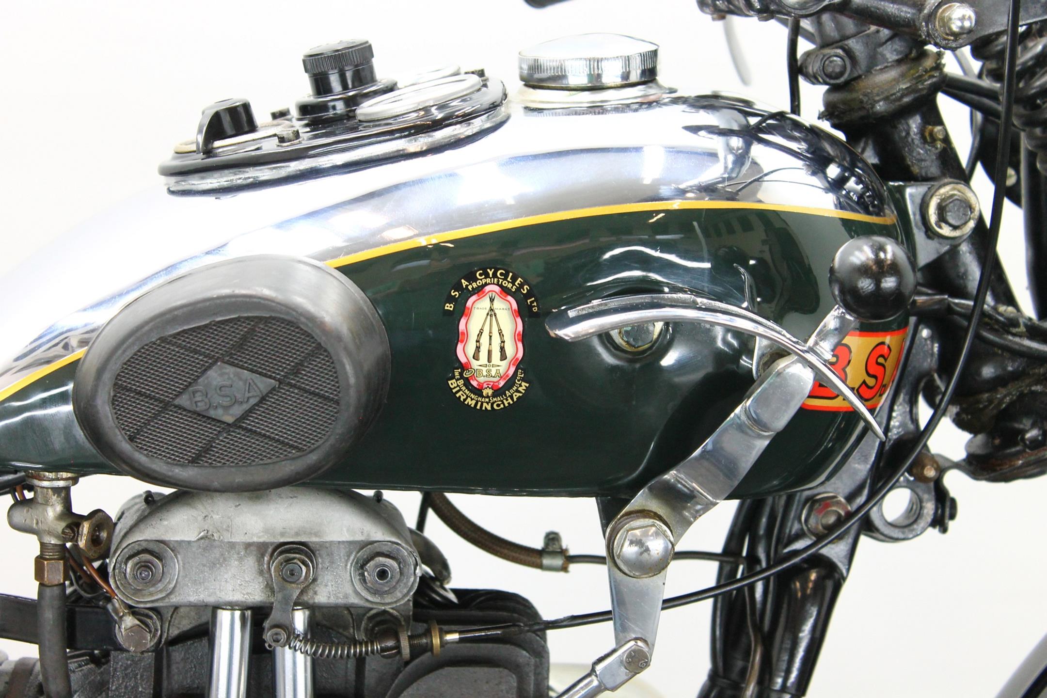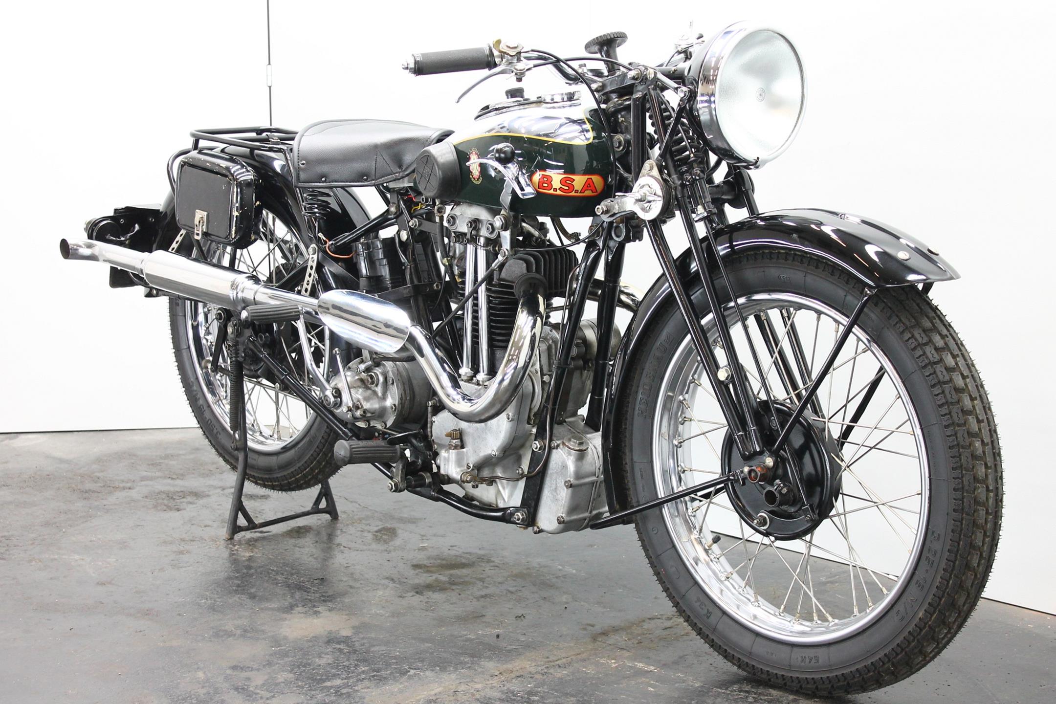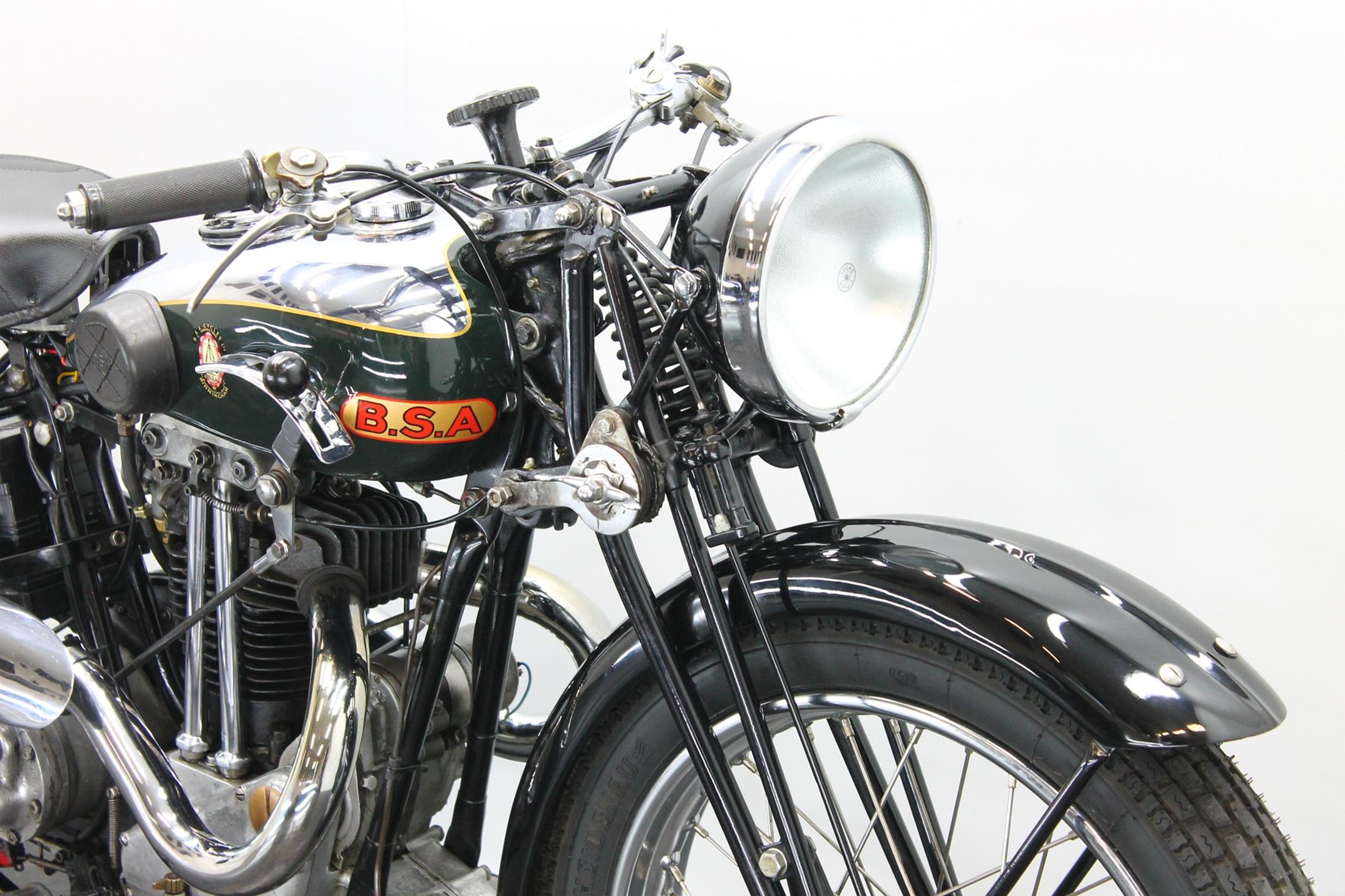 During the 1930s BSA concentrated on producing a range of dependable, well-made, competitively priced motorcycles. Its contemporary advertising slogan: 'One in Four is a BSA', reflected the Birmingham-based company's status as the world's largest motorcycle manufacturer. In 1927 BSA had introduced the influential 'Sloper' - so called because its inclined cylinder - starting a trend that saw many of its rivals launch similar machines. Nevertheless, models with vertical cylinders continued to form part of BSA's extensive range, outliving the Sloper when the fashion for inclined cylinders faded. The Depression of the early 1930s forced a cut back in the number of models, just ten being offered for 1932. Among these though, were three new 500s, one a sidevalve and two with overhead valves, all of which shared a common bottom end and the 85x88mm bore/stroke dimensions that would characterise all BSA's 500cc singles, including the legendary Gold Star, right up to the beginning of the unit-construction era in the 1960s. The two new ohv 500s were typed W32-7, the sports version being given the name 'Blue Star', a title that was also applied to the equivalent 250 and 350 models. Both featured engines having vertical cylinders and magneto ignition carried in conventional cycle parts with rigid frames and girder front forks. The Blue Star came with a tuned engine incorporating a high-compression piston and 'hotter' cams, twin-port cylinder which makes it a very sporty and powerful bike with 28hp! Originally an optional extra, a full electric lighting system became standard equipment for 1934. The W32-7 Bluestar model were available in two versions: hand gear change or foot gear change. This bike is manufactured in first year of production of Bluestar line.