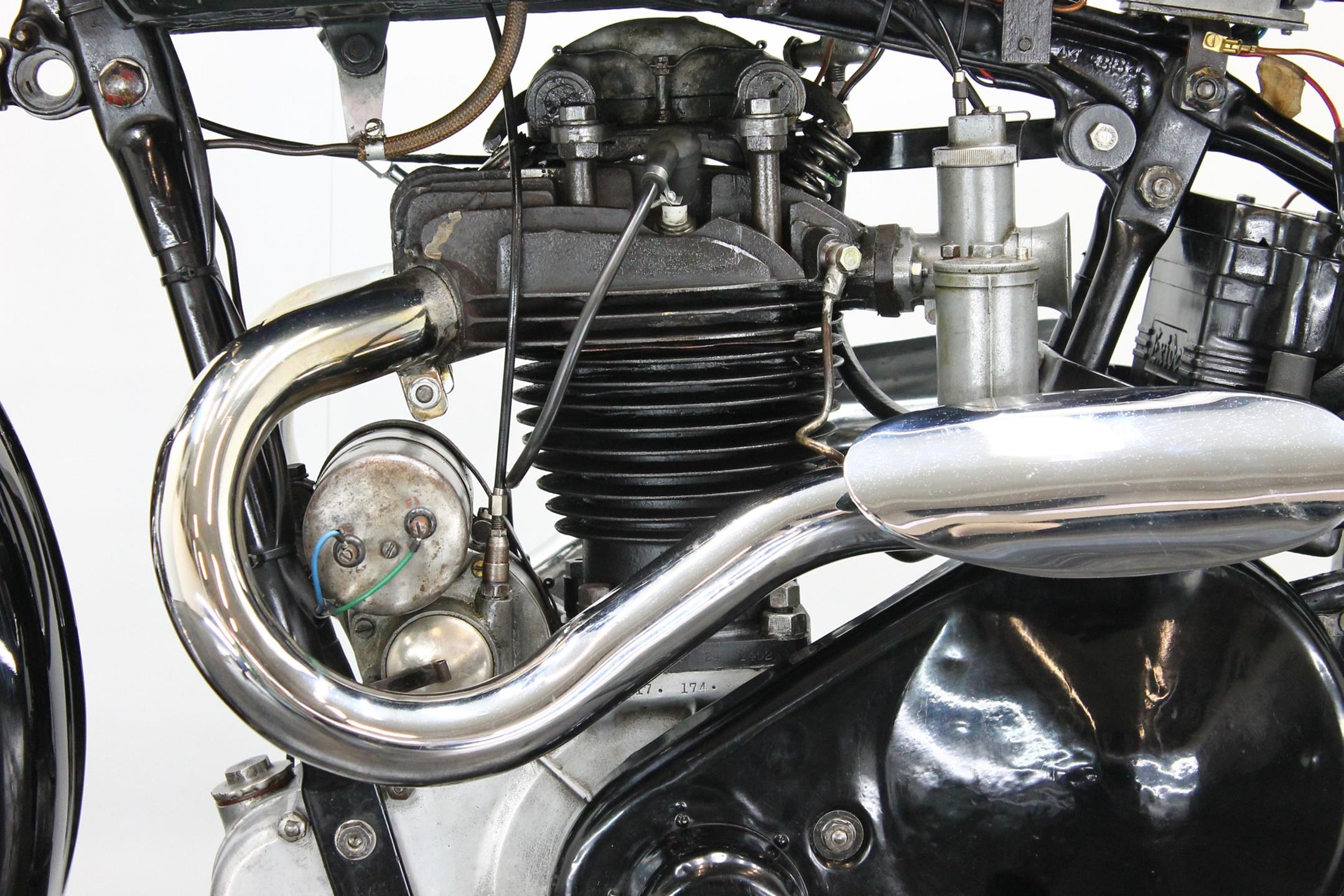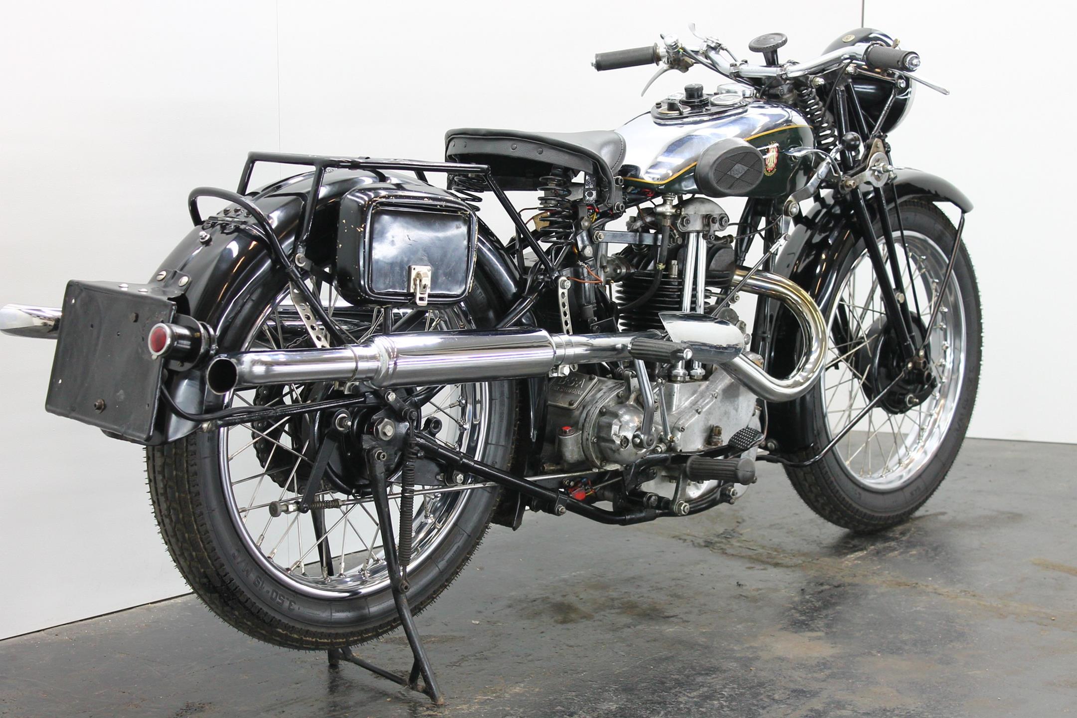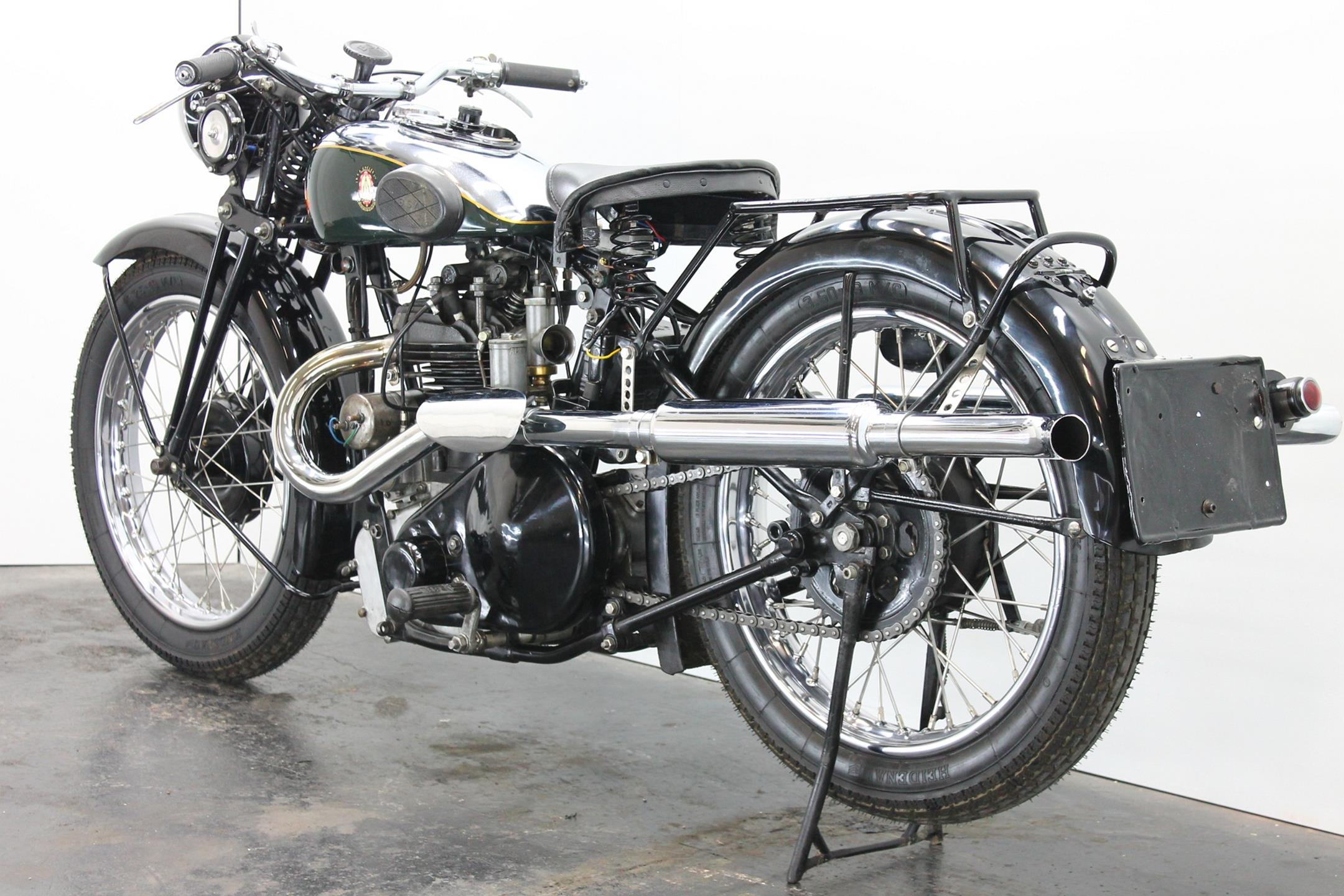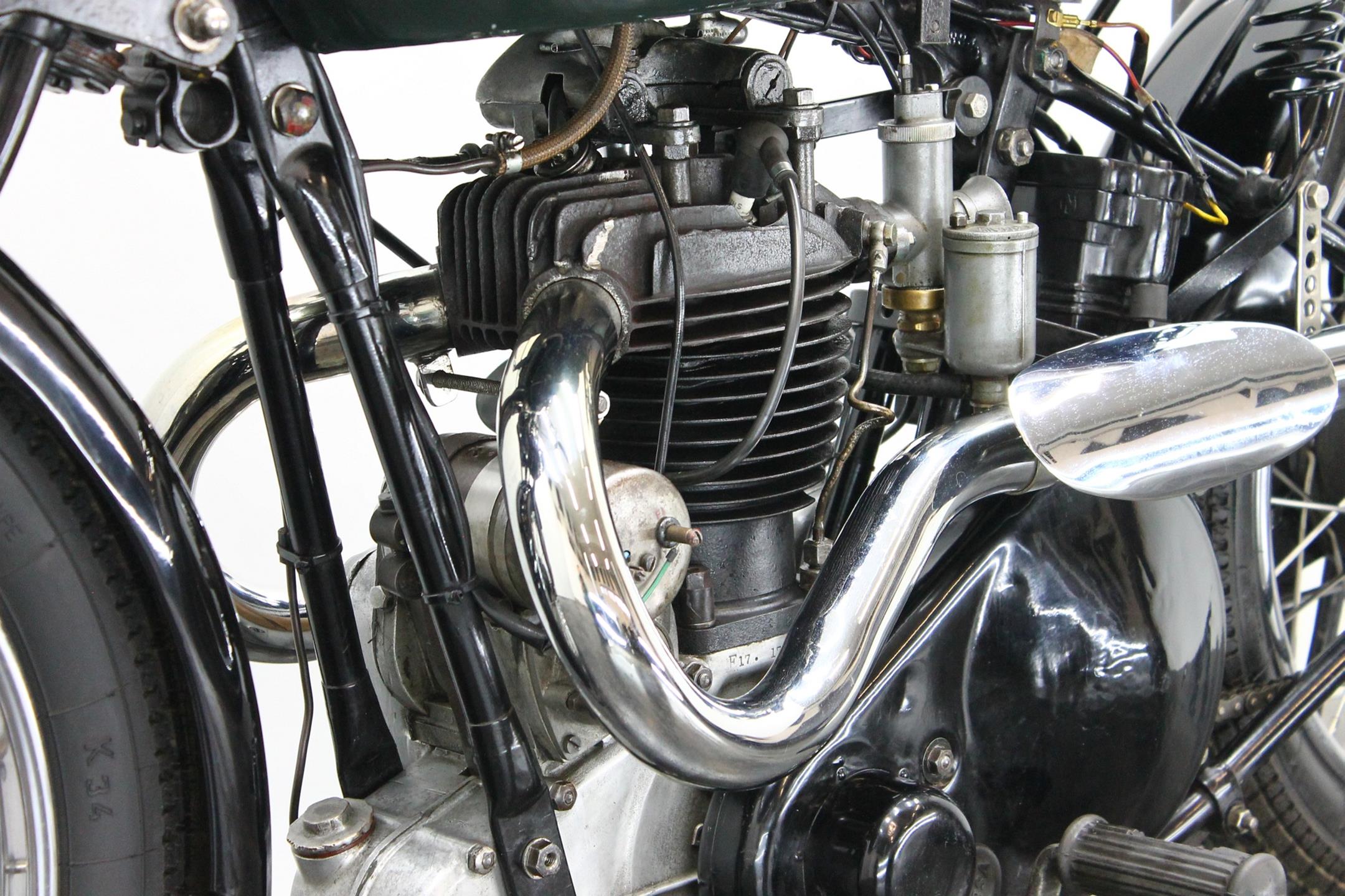 During the 1930s BSA concentrated on producing a range of dependable, well-made, competitively priced motorcycles. Its contemporary advertising slogan: 'One in Four is a BSA', reflected the Birmingham-based company's status as the world's largest motorcycle manufacturer. In 1927 BSA had introduced the influential 'Sloper' - so called because its inclined cylinder - starting a trend that saw many of its rivals launch similar machines. Nevertheless, models with vertical cylinders continued to form part of BSA's extensive range, outliving the Sloper when the fashion for inclined cylinders faded. The Depression of the early 1930s forced a cut back in the number of models, just ten being offered for 1932. Among these though, were three new 500s, one a sidevalve and two with overhead valves, all of which shared a common bottom end and the 85x88mm bore/stroke dimensions that would characterise all BSA's 500cc singles, including the legendary Gold Star, right up to the beginning of the unit-construction era in the 1960s. The two new ohv 500s were typed W32-7, the sports version being given the name 'Blue Star', a title that was also applied to the equivalent 250 and 350 models. Both featured engines having vertical cylinders and magneto ignition carried in conventional cycle parts with rigid frames and girder front forks. The Blue Star came with a tuned engine incorporating a high-compression piston and 'hotter' cams, twin-port cylinder which makes it a very sporty and powerful bike with 28hp! Originally an optional extra, a full electric lighting system became standard equipment for 1934. The W32-7 Bluestar model were available in two versions: hand gear change or foot gear change. This bike is manufactured in first year of production of Bluestar line.