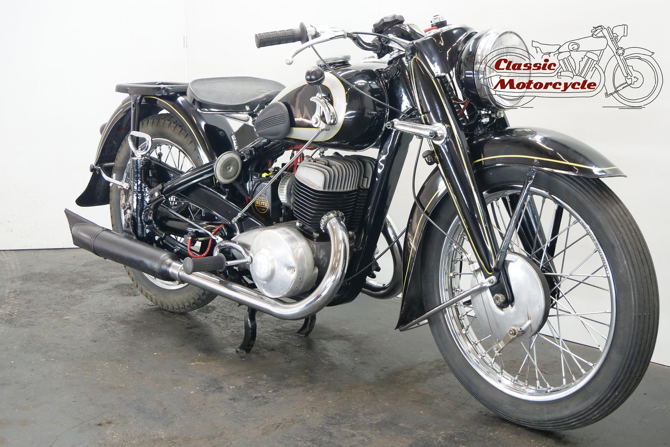 DKW was founded in Zschopau in 1919 by Danish engineer Jorgen Rasmussen and built its first motorcycle power unit, a single-cylinder, clip-on engine for bicycle attachment, in 1921. Designed by Hugo Ruppe, this 122cc motor was a two-stroke, and DKW would remain faithful to this engine type from then on, becoming world leaders in two-stroke design in the 1930s thanks to the prescient adoption of the Schnuerle loop-scavenge system. The latter used flat-topped pistons rather than the then-conventional deflector-crown type, relying on carefully angled transfer ports to direct the incoming charge around the cylinder. DKW was Continental Europe’s largest motorcycle maker at this time, manufacturing a huge and diverse range of road bikes during the 1930s, the NZ500 being one of the fastest and most powerful. An air-cooled twin of advanced design featuring swinging-arm rear suspension, the NZ500 employed engine dimensions of 64x76mm bore/stroke (for a capacity of 489cc) and produced 18.5hp. Representing the pinnacle of pre-war DKW motorcycle design, approximately 4,200 of these rare and desirable models were made between 1939 and 1942, almost all of which were supplied to Hitler’s SS.