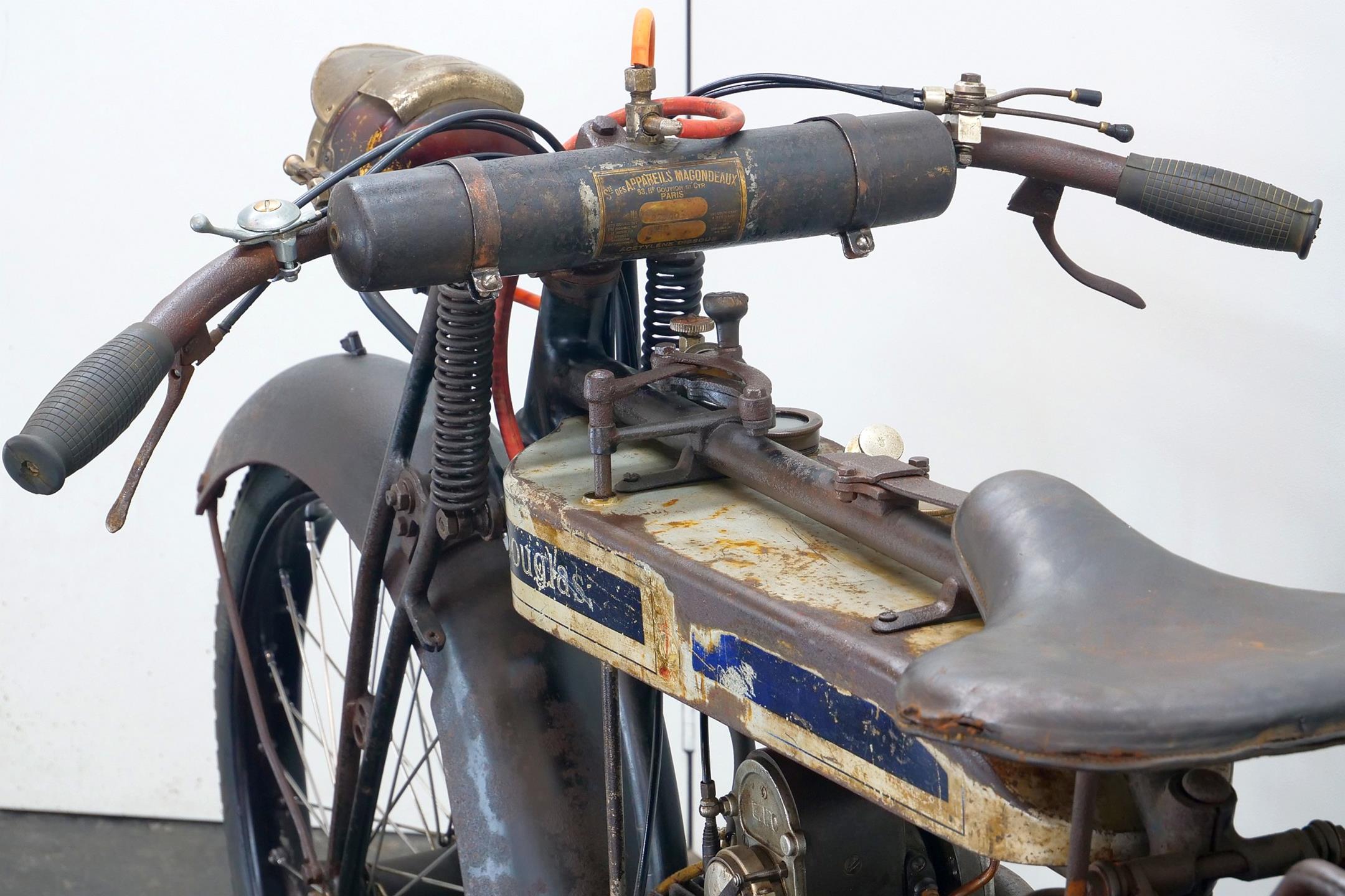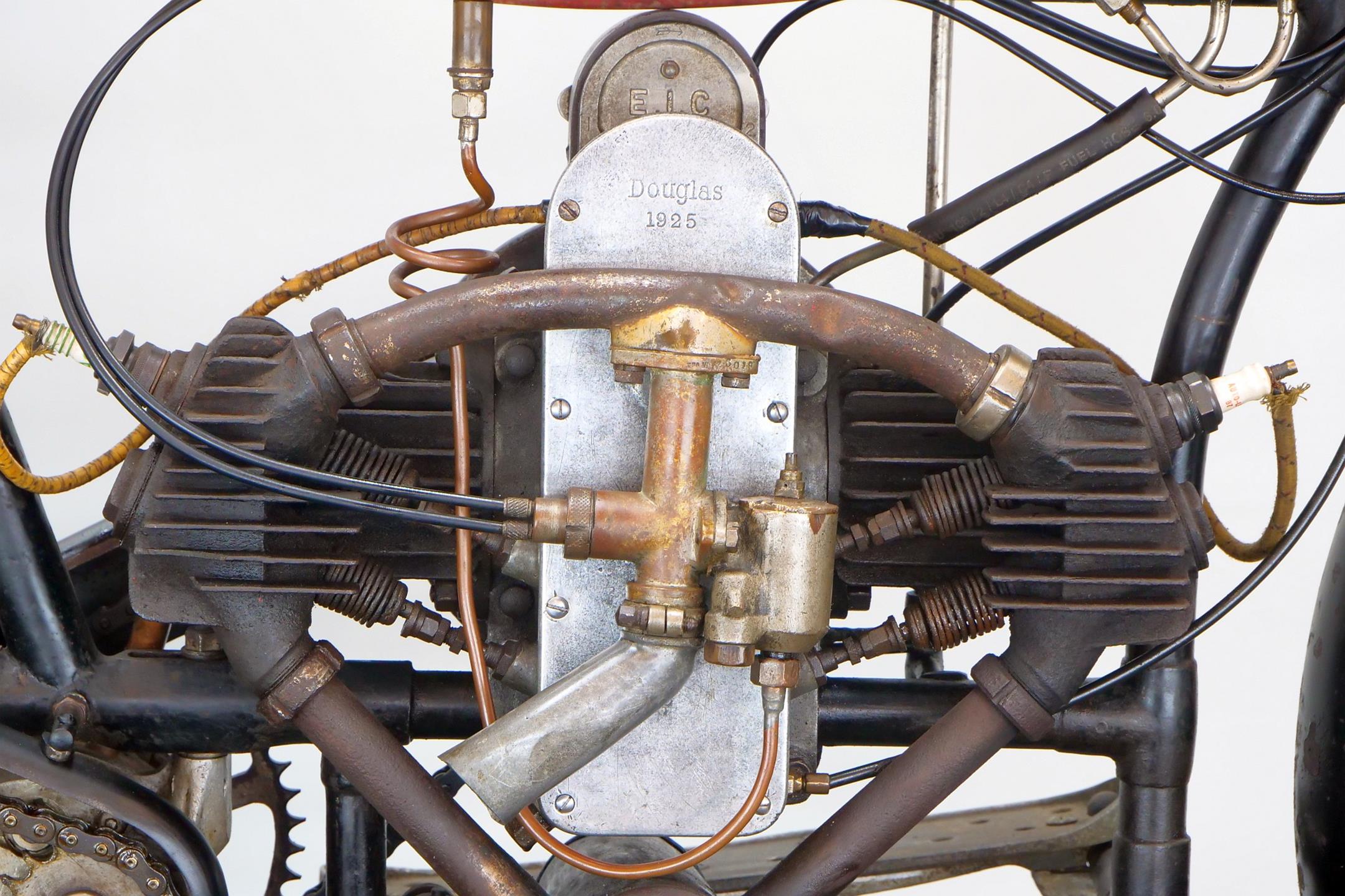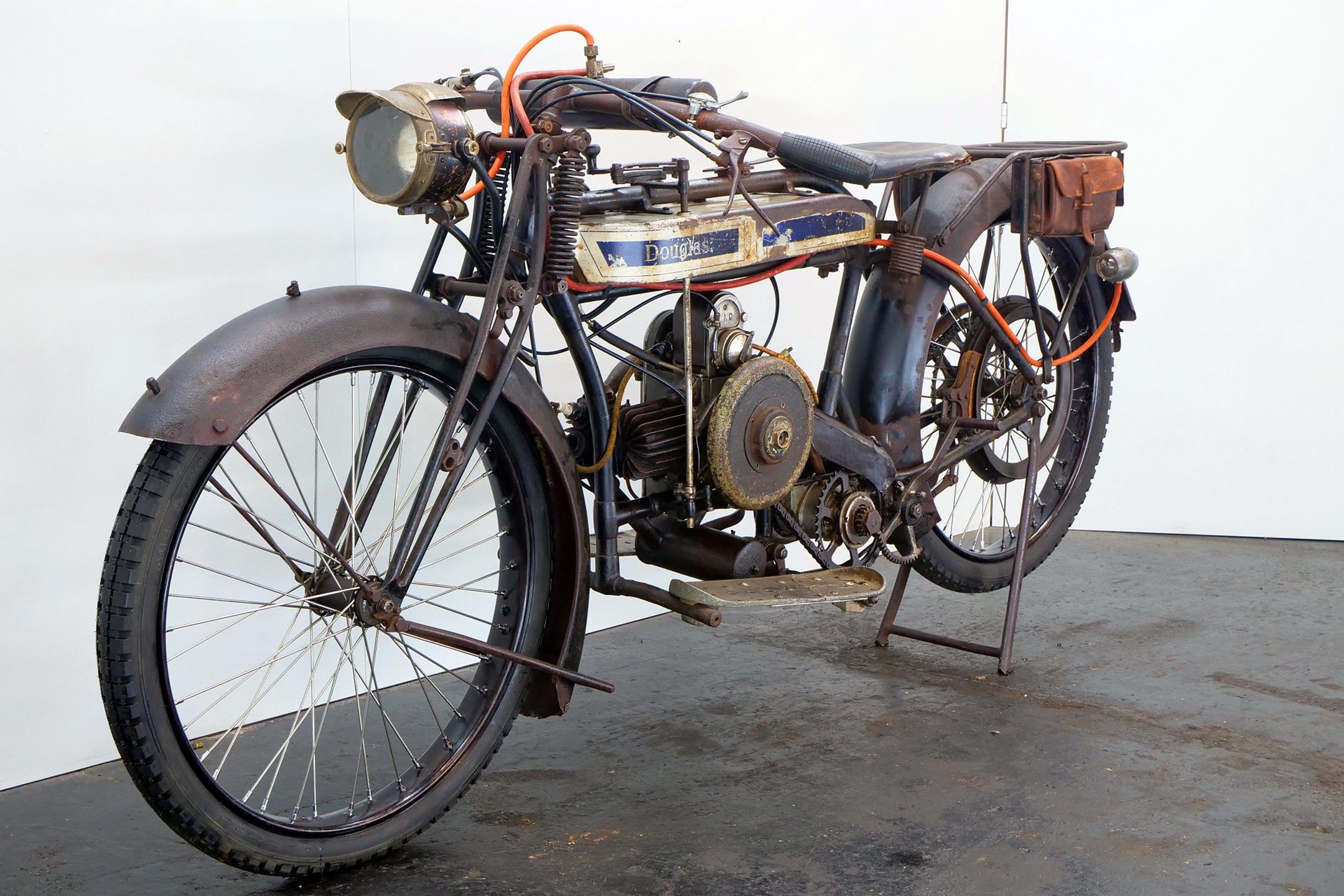 The Bristol-based Douglas Foundry took up motorcycle production in 1907 with a machine powered by a horizontally-opposed twin, and the company would keep faith with this engine layout until it ceased motorcycle production in 1957. Fore-and-aft installation made for a slim machine with a low centre of gravity, and the design's virtues were soon demonstrated in competition, Douglas machines taking first, second, and fourth places in the 1912 Junior TT in the Isle of Man. Douglas were quick realise the advantages of the countershaft gearbox, its three-speed entries gaining the Team Prize in the 1914 Six Days Trial, a conspicuous success which resulted in the firm obtaining a wartime contract for the supply of military machines. This Douglas CW has a 350cc sidevalve engine of 'fixed head' type with outside flywheel and magneto ignition, while the transmission comprises chain primary drive to a three-speed gearbox with chain final drive. The front fork is of the side-spring type while retardation is by means of v-block belt-rim brakes front and rear.