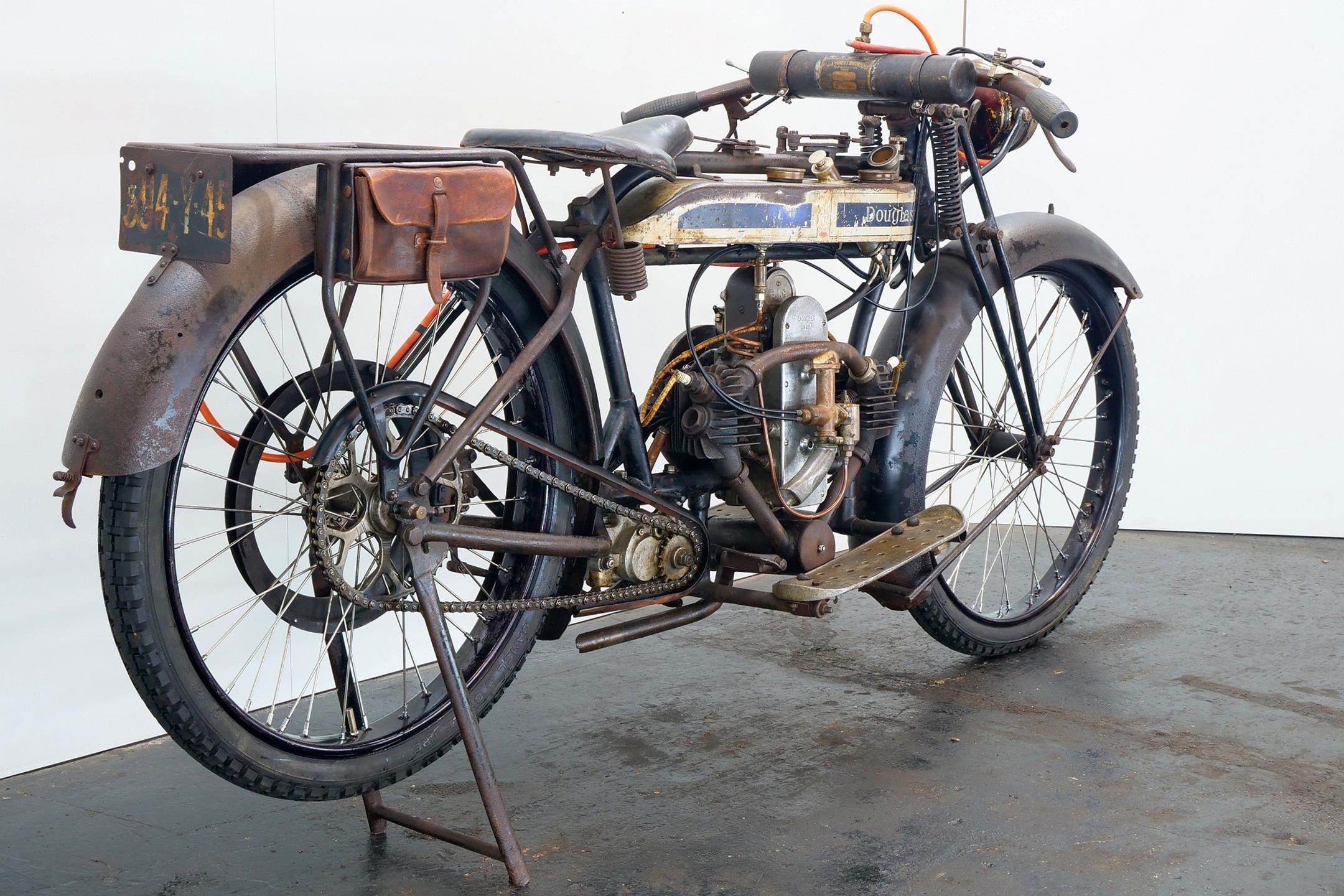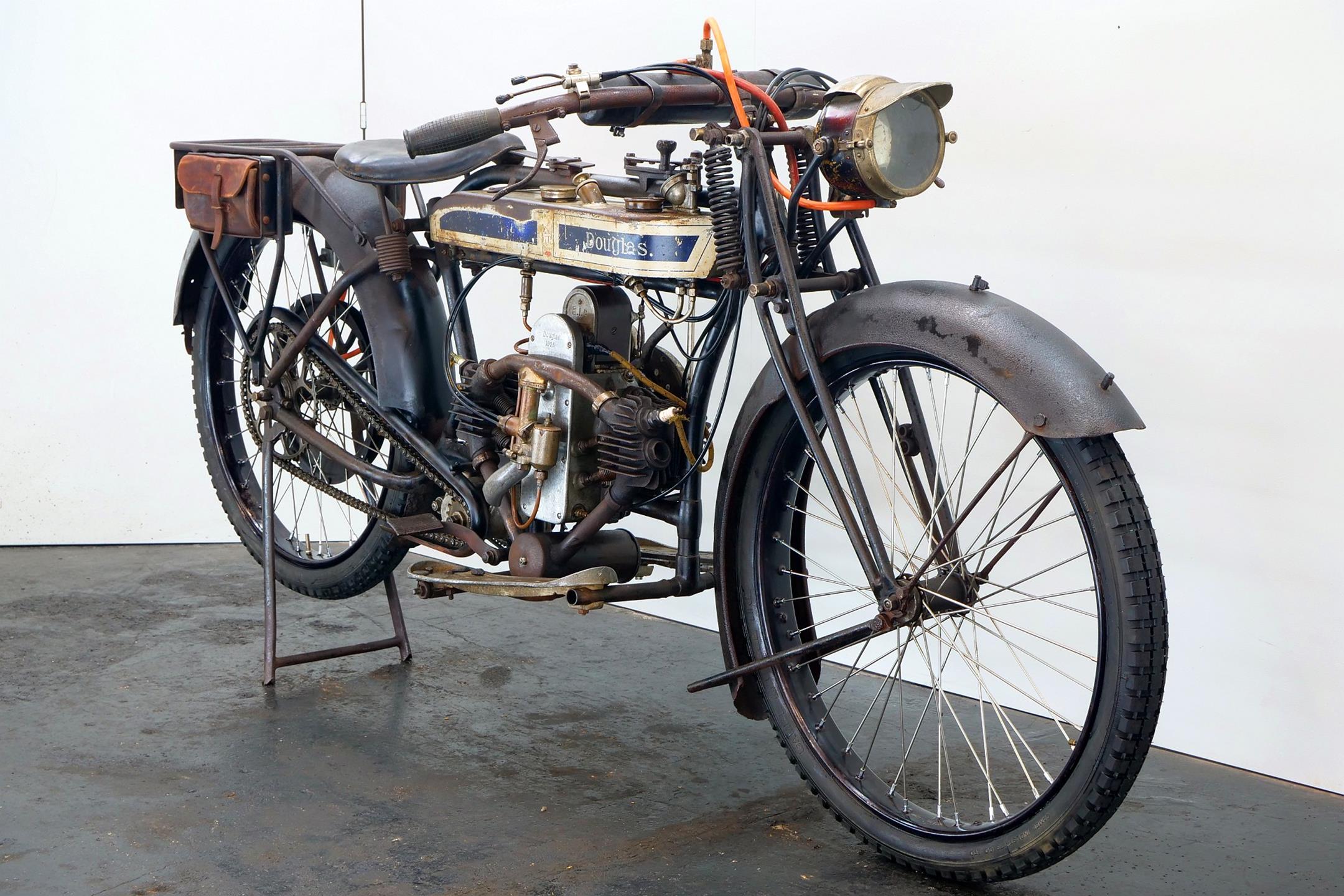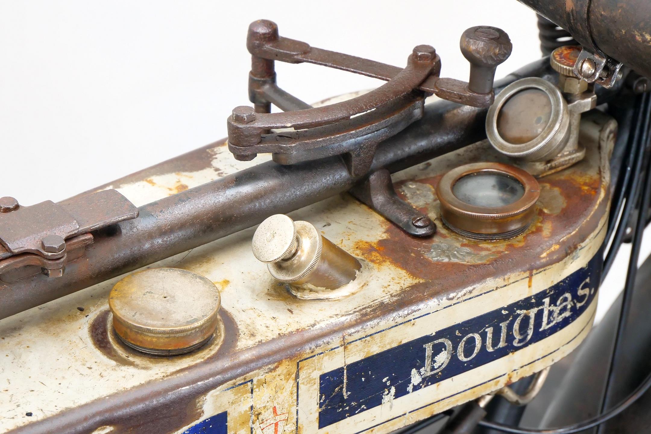 The Bristol-based Douglas Foundry took up motorcycle production in 1907 with a machine powered by a horizontally-opposed twin, and the company would keep faith with this engine layout until it ceased motorcycle production in 1957. Fore-and-aft installation made for a slim machine with a low centre of gravity, and the design's virtues were soon demonstrated in competition, Douglas machines taking first, second, and fourth places in the 1912 Junior TT in the Isle of Man. Douglas were quick realise the advantages of the countershaft gearbox, its three-speed entries gaining the Team Prize in the 1914 Six Days Trial, a conspicuous success which resulted in the firm obtaining a wartime contract for the supply of military machines. This Douglas CW has a 350cc sidevalve engine of 'fixed head' type with outside flywheel and magneto ignition, while the transmission comprises chain primary drive to a three-speed gearbox with chain final drive. The front fork is of the side-spring type while retardation is by means of v-block belt-rim brakes front and rear.