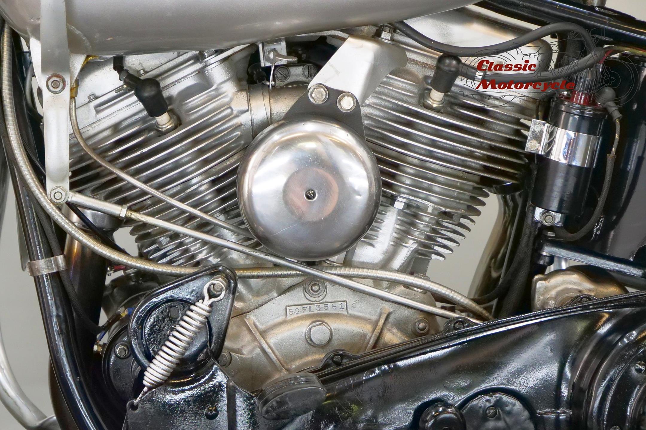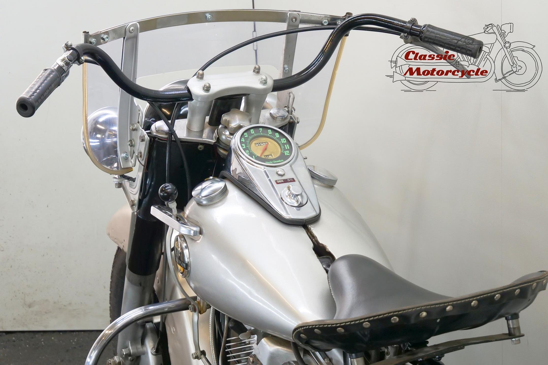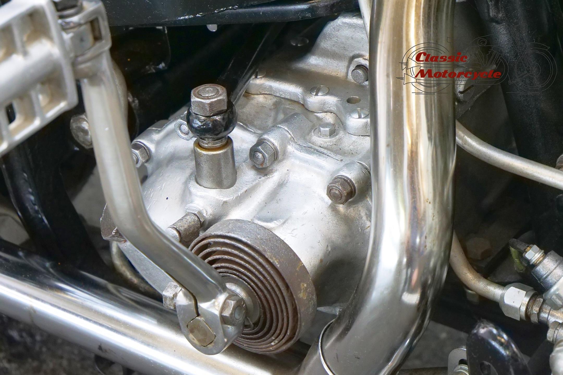 By the late 1940s the ‘Knucklehead’ - Harley-Davidson’s first overhead-valve twin-cylinder roadster - was beginning to show its age, prompting the Milwaukee firm to engage in a wholesale revision of the engine for 1948, the new top end giving rise to the unofficial nickname ‘Panhead’. While the engine’s bottom end remained fundamentally unchanged, the top end gained aluminum cylinder heads and those distinctive pan-shaped rocker covers. Oil lines were internalized and hydraulic valve lifters adopted, an innovation that greatly reduced tappet noise and simplified maintenance. Maximum power went up to 50hp in the 1200cc in FL model, but the main advantage of the many improvements was greater reliability. The Panhead featured a new ‘wishbone’ frame incorporating bowed front down-tubes, and in 1949 gained a hydraulically damped telescopic front fork, becoming the ‘Hydra-Glide’, though this name was originally applied only to the fork and did not become an official model title until 1952. The advent of rear suspension in 1958 saw the Panhead renamed ‘Duo-Glide’, while with the addition of an electric starter in 1965 it became the ‘Electra Glide’.