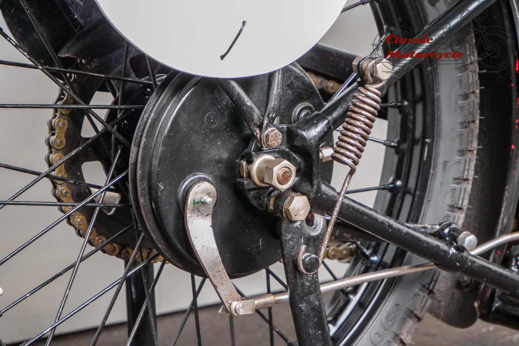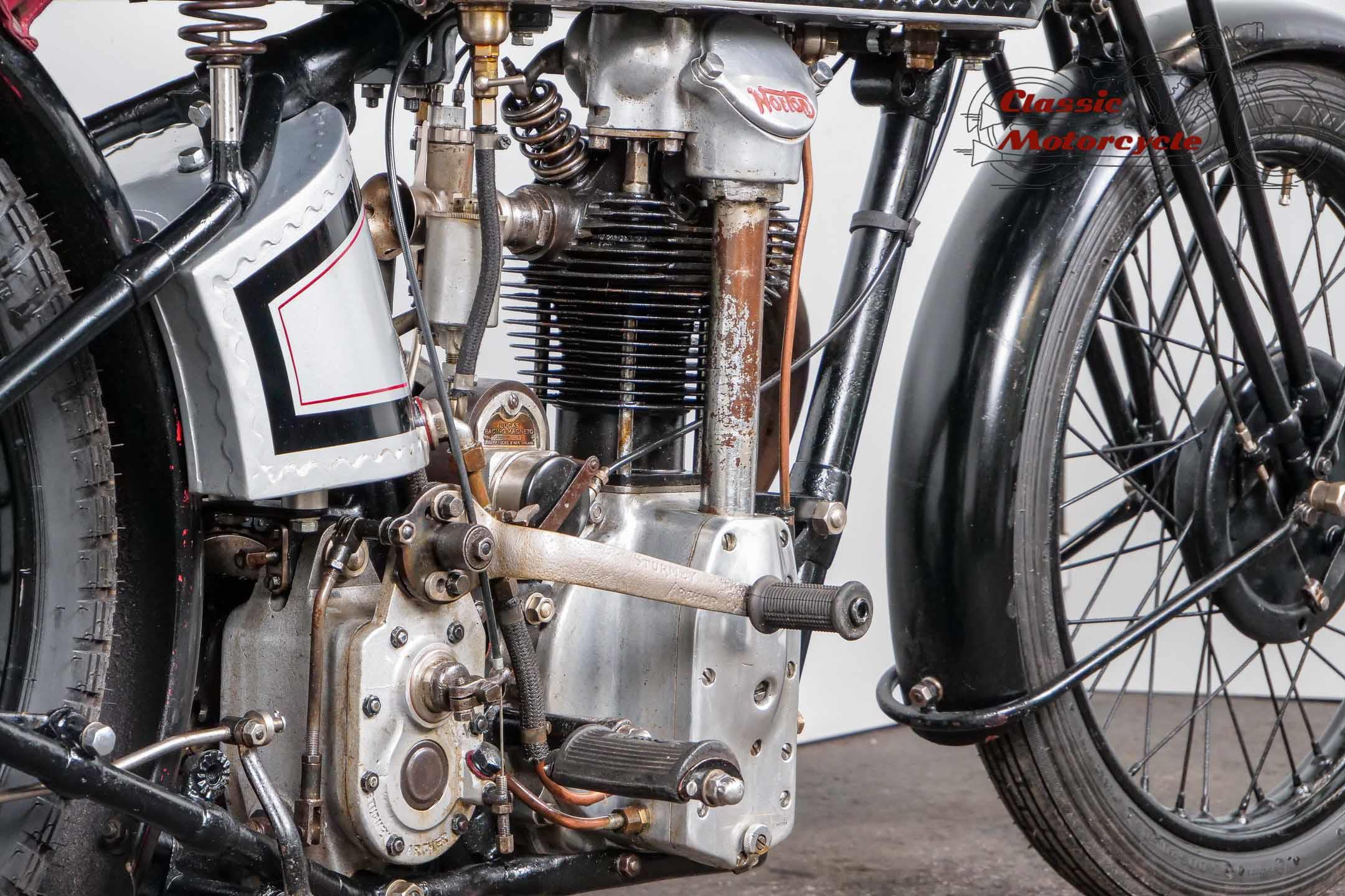 The engine number and frame number match the records. It was equipped with an Amal carburetor, 26 x 3 tires and closed Druid suspension forks. The LS transmission number was 108475. It had a 500cc gas tank, narrow fenders, twist grip and an oil tank with filler neck on the left. The machine came with high compression replacement pistons. Delivered to Piet van Wijngaarden, Netherlands, on 5/14/1929, records also state that the bike was for Mr. Davids and is "specially made by W. Moore".