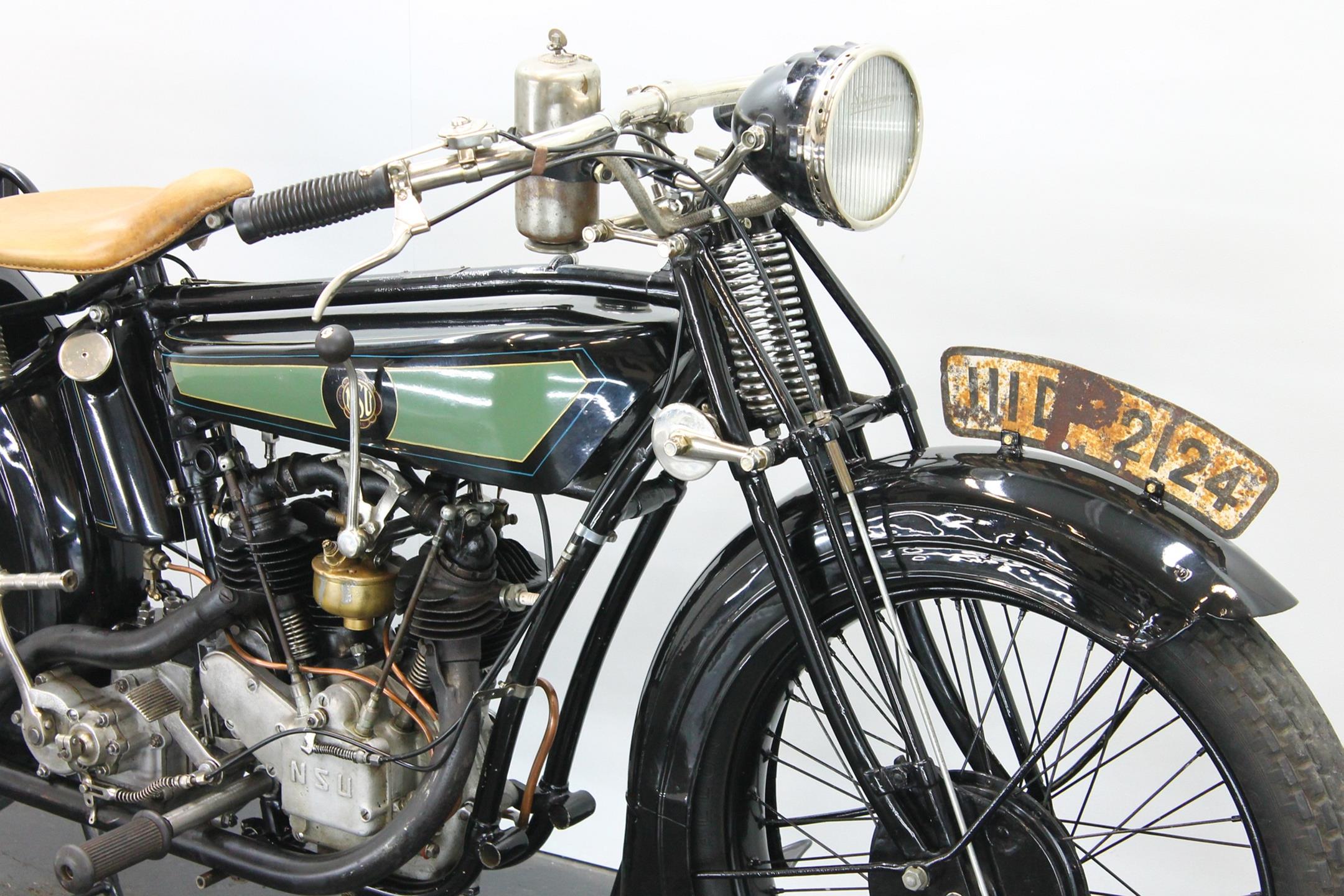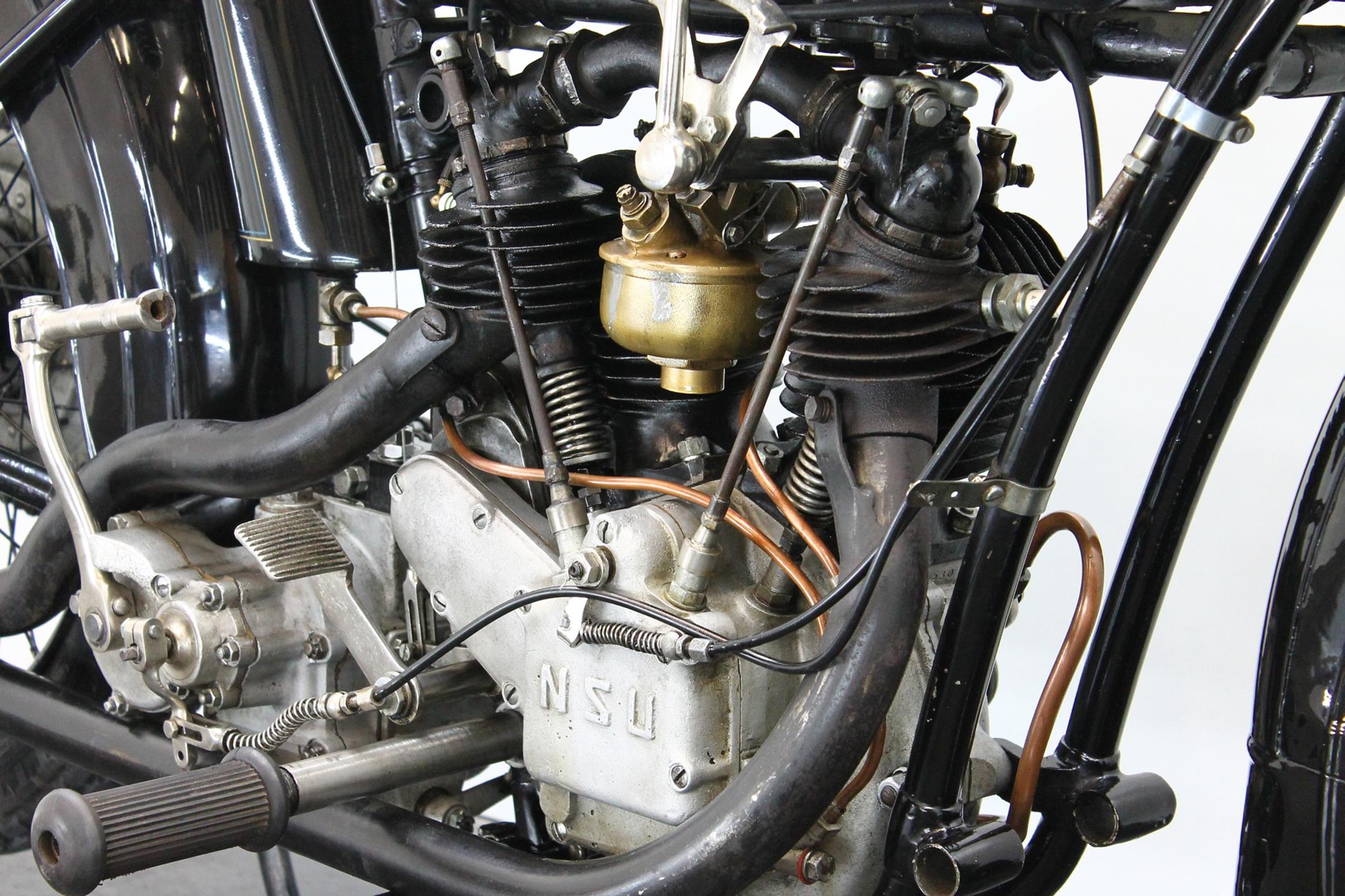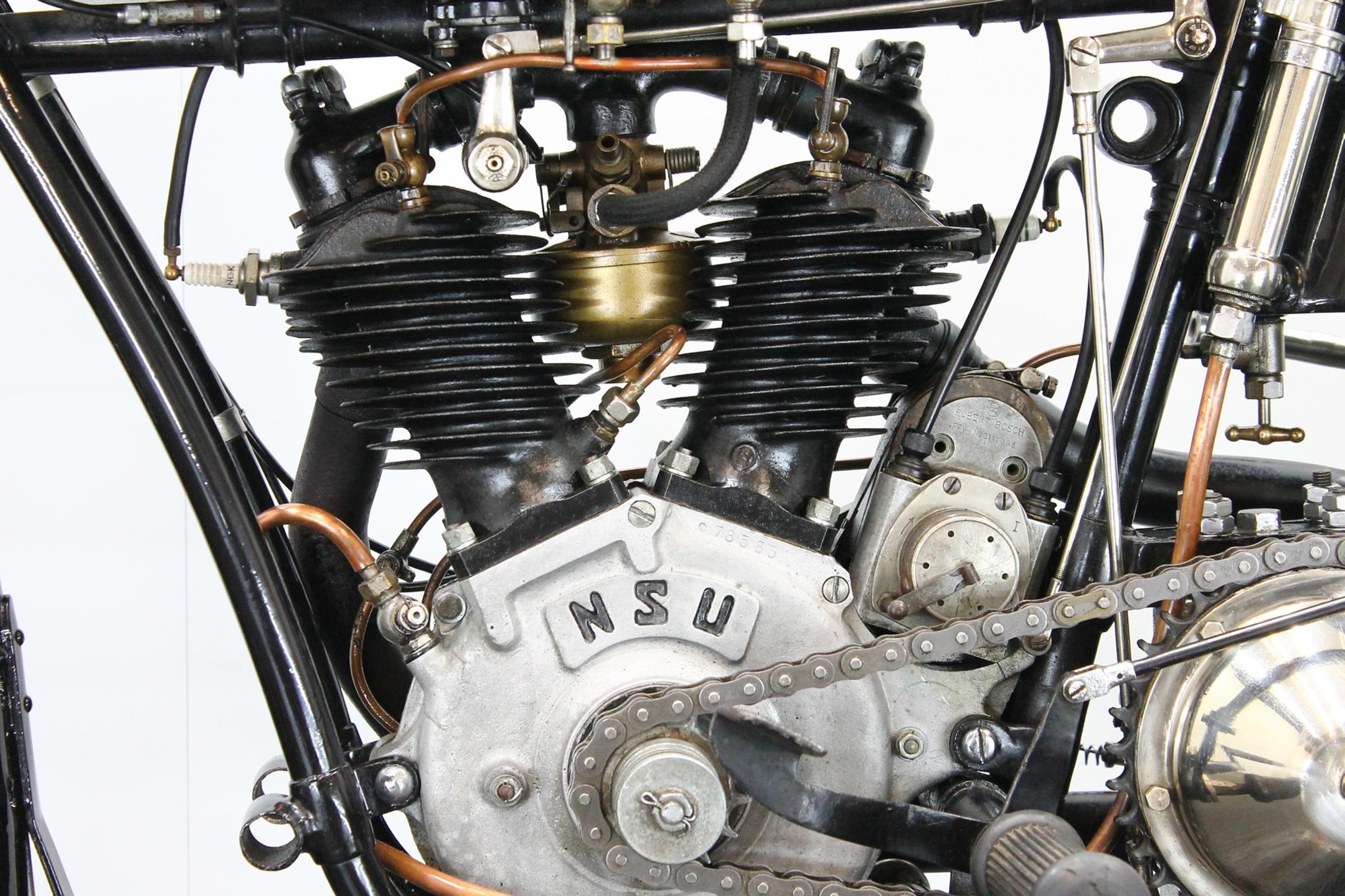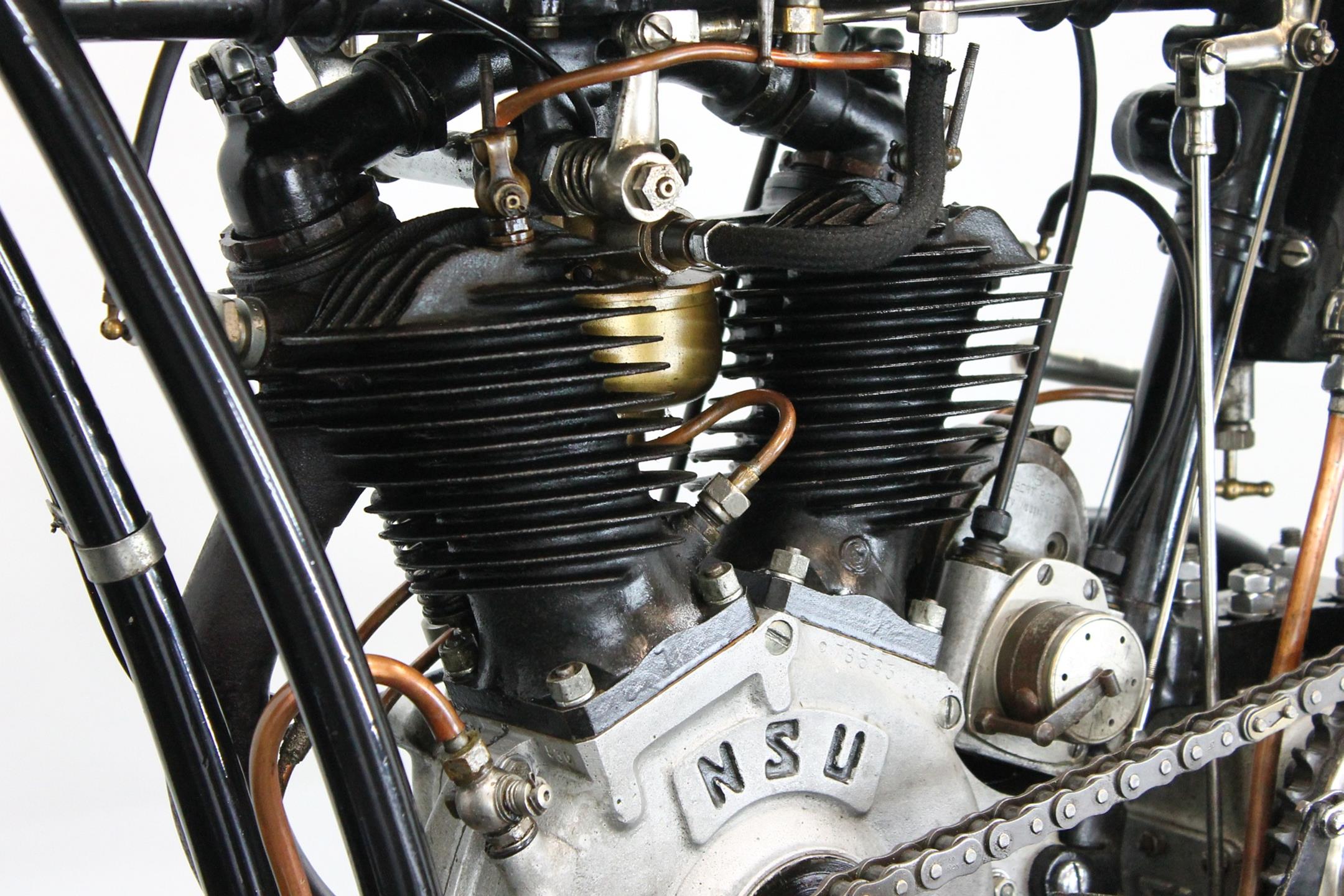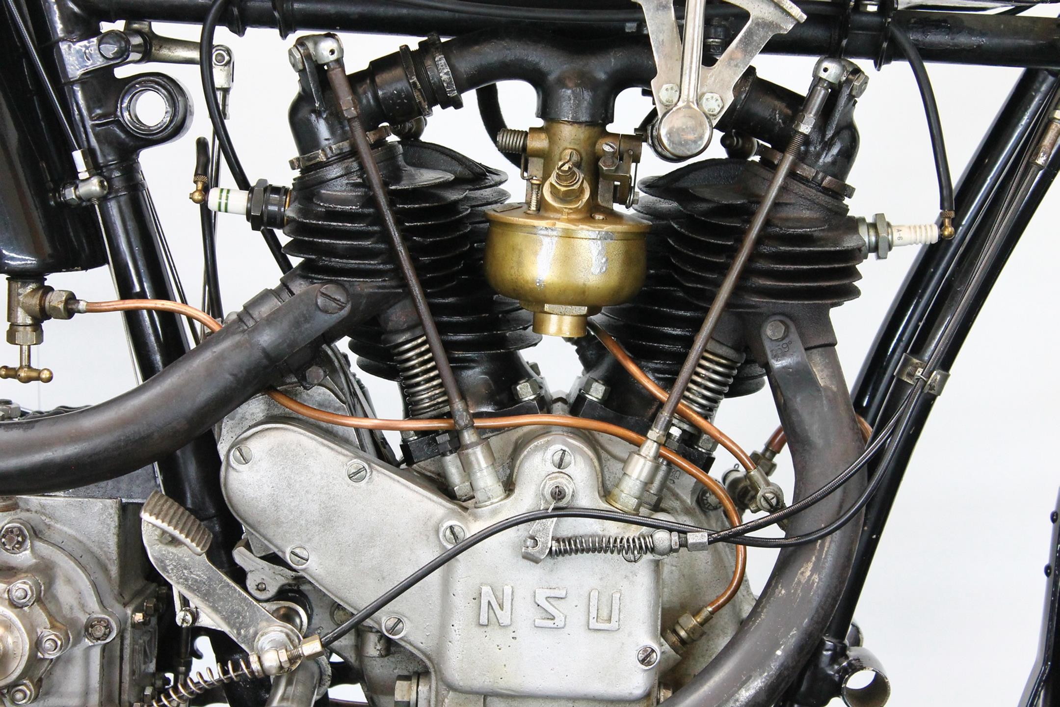 The NSU brand has deep roots in German industry, as the Mechanische Werkstätte zur Herstellung von Strickmaschinen was established in 1873 as a knitting machine manufacturer. Mass-produced clothing was a novelty in the 1800s, and automatic weaving and knitting a revelation—now people could afford ready-made clothing constructed to a high standard. Founder Christian Schmidt was a technically savvy entrepreneur, and he established his factory on the Danube river in the town of Riedlingern. By 1880, a move to larger premises in Neckarsulm was required, and the business really grew and diversified, building high-wheeler bicycles from 1886 called the Germania. Such was the popularity of bicycles in the era that the company dropped knitting machines entirely by 1892 to focus on bicycles, and the company began trading as the Neckarsulm Strickmaschinen Union. Its first motorcycle appeared in 1901, with a Swiss 3/4 HP Zedel motor bolted to an NSU bicycle. In 1927 both V-twins was catalogued the NSU 502 Touring and the NSU 502 Sport.