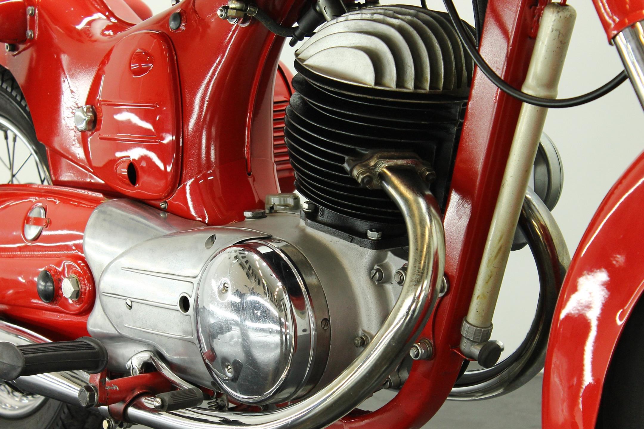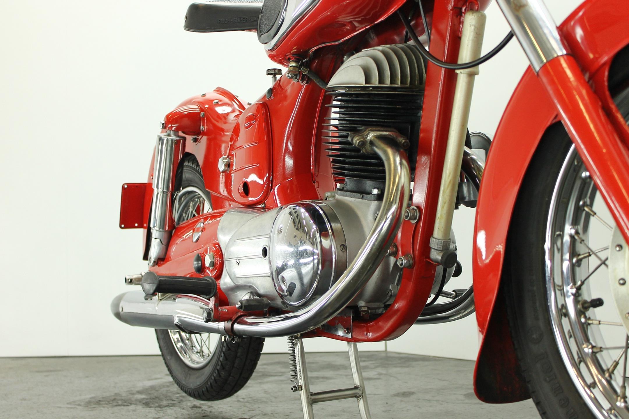 The motorcycle part of the Austrian Steyr-Daimler-Puch combine, Puch introduced its first motorcycle in the early 1900s. These days the firm is best remembered for its pioneering 'split-single' two-strokes, the first of which was developed in the 1920s. In its final form the engine featured tandem cylinders whose pistons were driven via a single connecting rod. After WW2 Puch built two-strokes only, commencing with split-singles in 125, 150, 175 and 250cc capacities built in both tourer and sport guises. Cycle parts were conventional for the time and featured plunger rear suspension and twin 'swing' saddles. Updated in 1954 with revised engine and a swinging-arm frame, Puch's split-single range remained in production well into the 1960s.