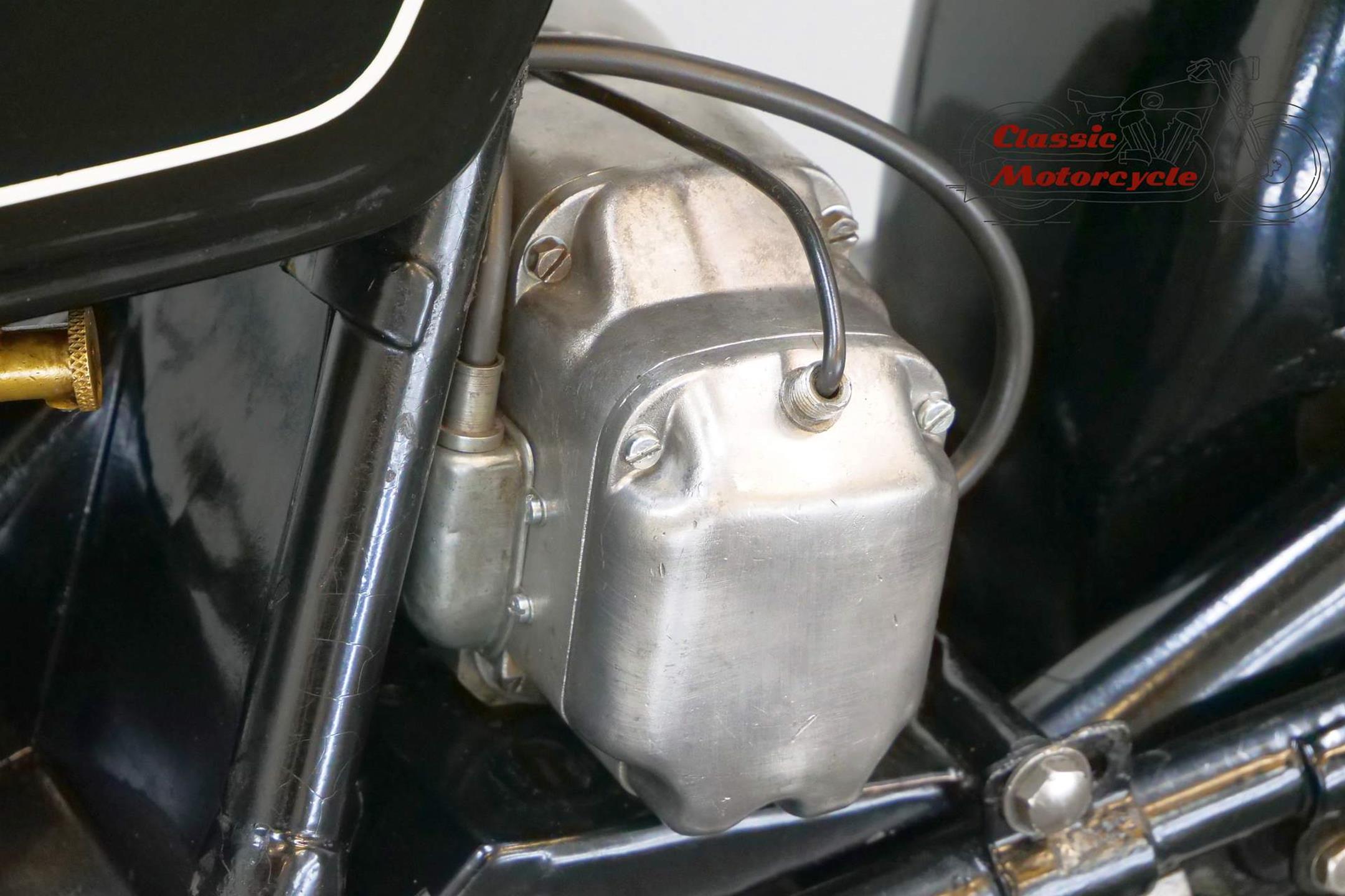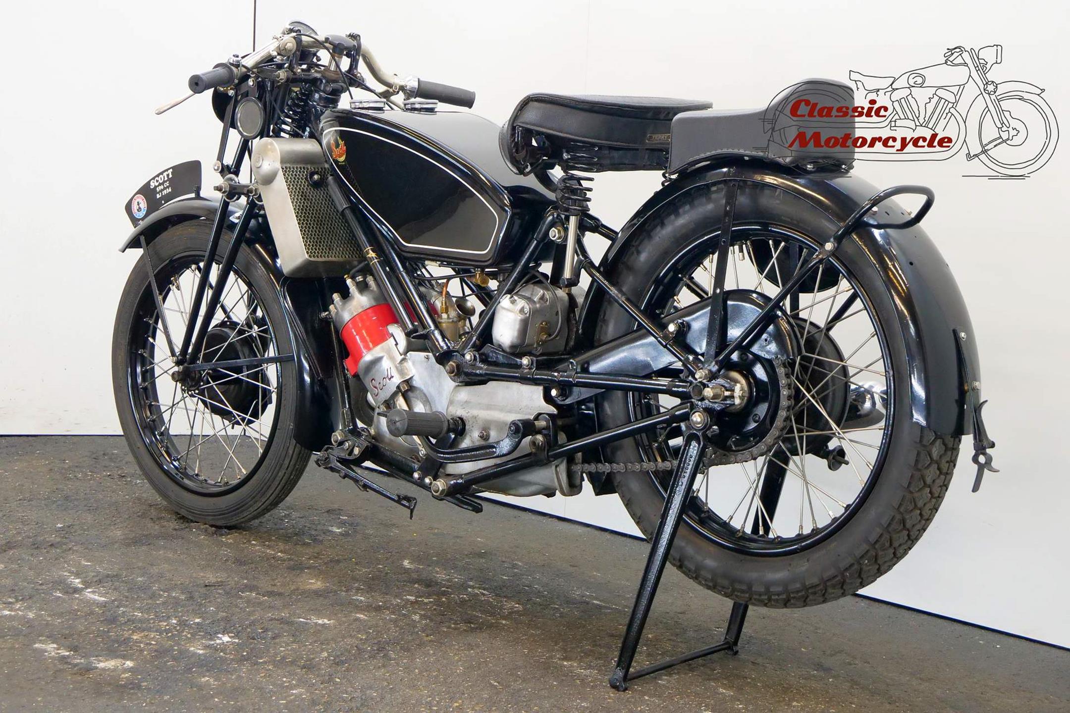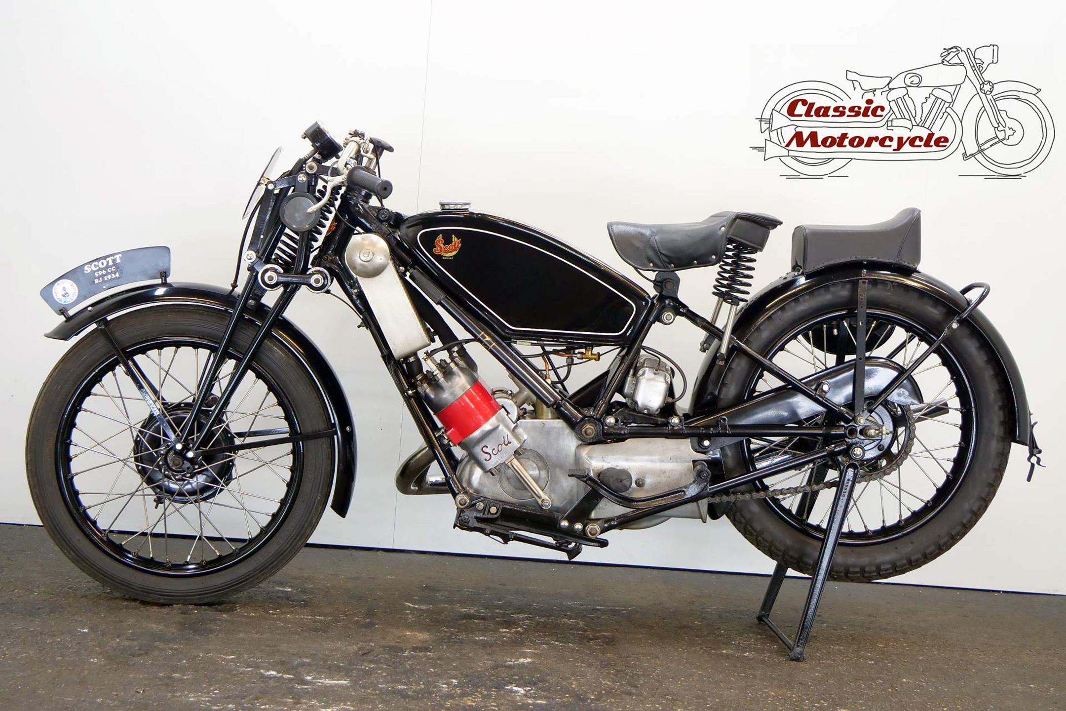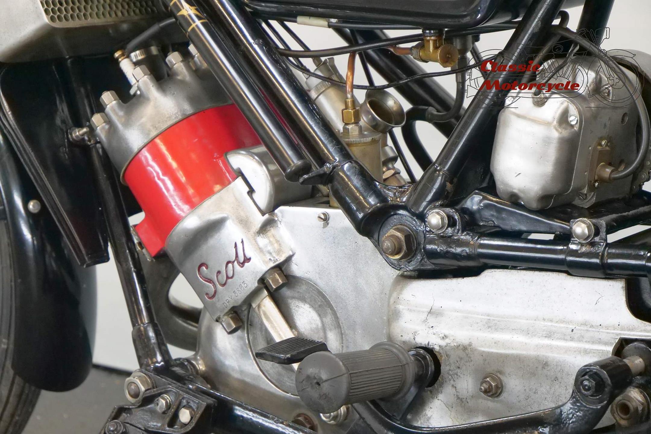 Bradford-born inventor Alfred Angas Scott's experiments with two-stroke motorcycle engines began in the closing years of the 19th Century, leading to the grant of a patent in 1904. Scott's original design for a vertical twin two-stroke engine incorporated the central flywheel with 180-degree overhung cranks and slim connecting rods that would characterize his products from then onwards. One of its chief advantages was close spacing to the cylinder axes and main bearings, thus virtually eliminating the vibratory rocking couple hitherto associated with vertical twins. The first complete Scott motorcycle prototype followed in 1908, its twin-cylinder engine, two-speed foot-change gear and all-chain drive marking it out as an exceptionally advanced design for its day. Like most of their rivals, Scott recognized the value of publicity gained from success on the racetrack - particularly at the Isle of Man TT - and first entered the latter event in 1909, becoming the first two-stroke to start in a Tourist Trophy race. Back-to-back victories in the 1912 and 1913 Senior events would turn out to be the highlights of the firm's TT record, though Harry Langman came close again in 1922 and 1924, finishing third and second respectively. The 1924 works bikes had featured 'square' engines of 68.25mm bore/stroke, and this new 498cc unit became available in the Super Squirrel introduced later in the year together with a 74.6mm-bore 596cc version, which remained essentially unchanged until Scott production petered out in the 1960s, by which time the company had changed hands and relocated from Shipley to Birmingham.