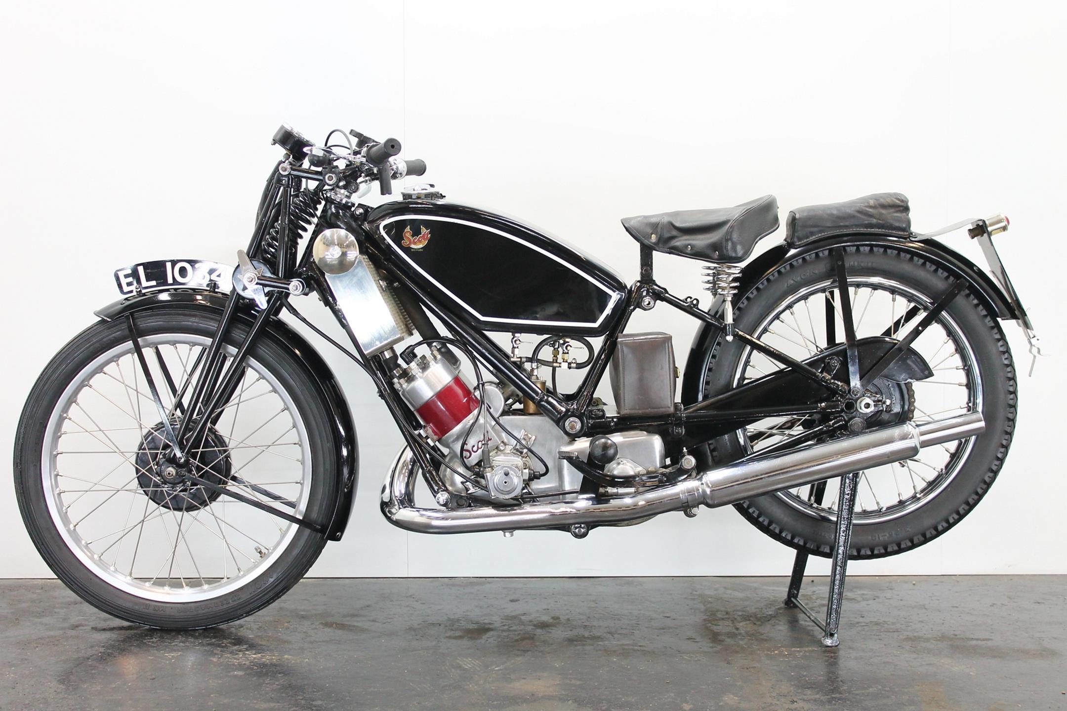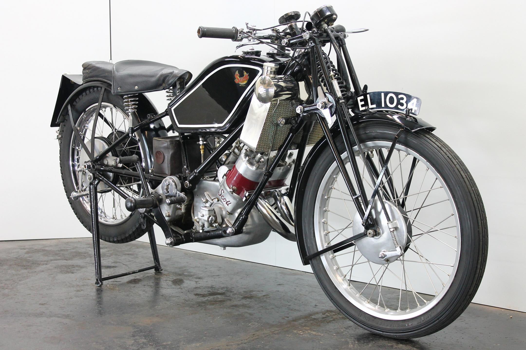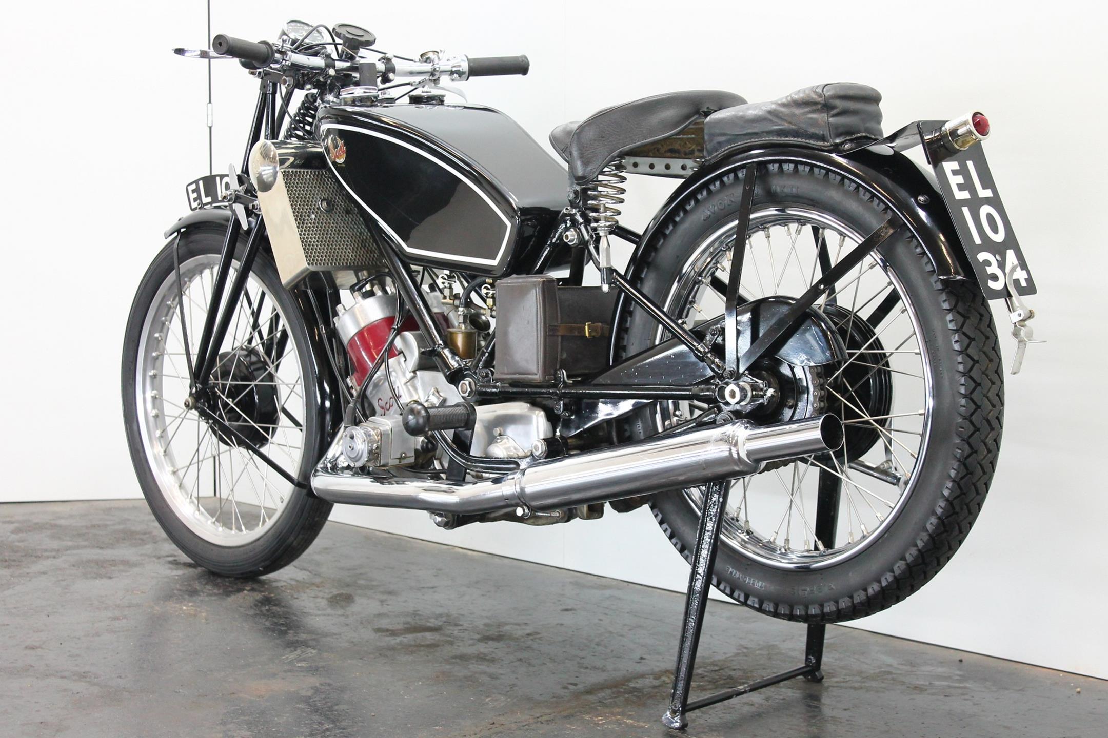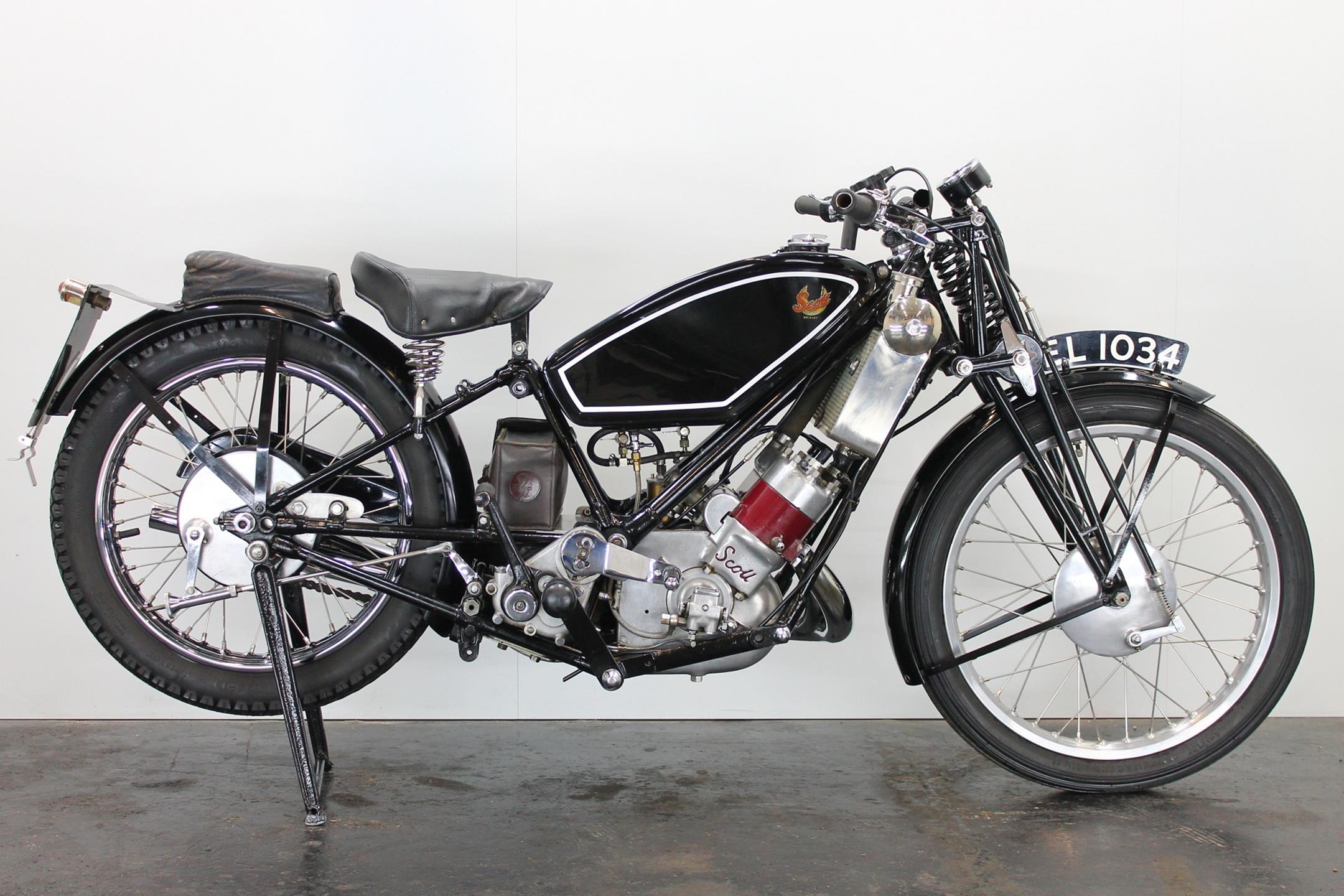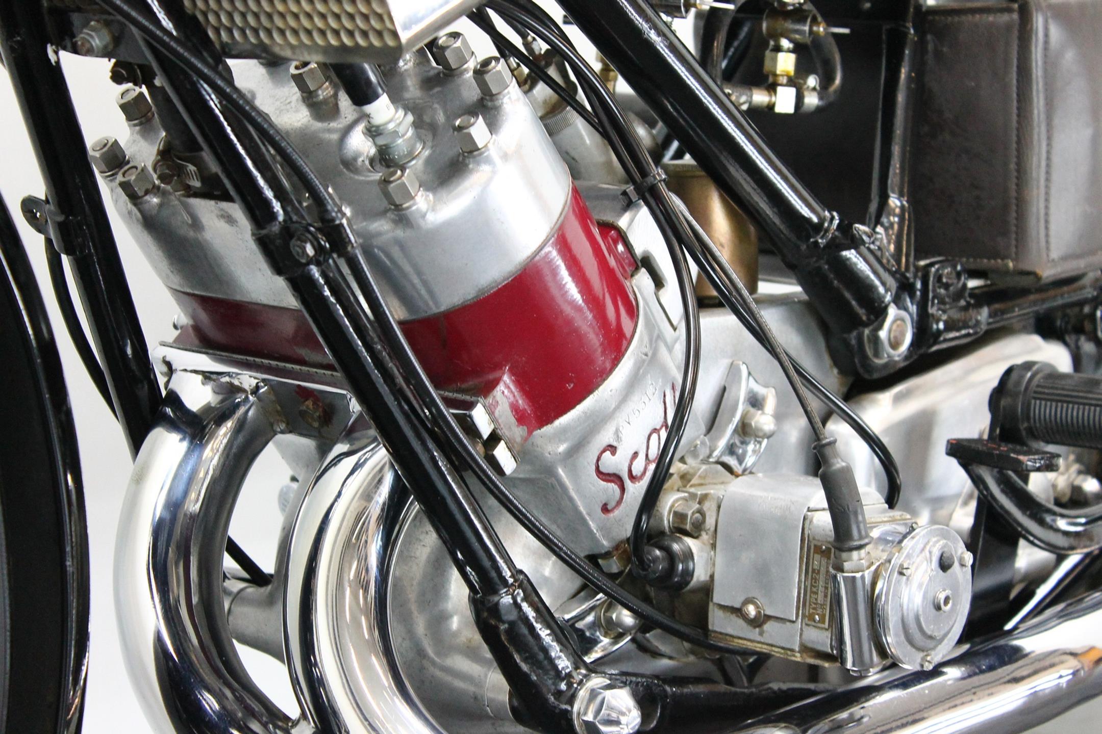 Bradford-born inventor Alfred Angas Scott's experiments with two-stroke motorcycle engines began in the closing years of the 19th Century, leading to the grant of a patent in 1904. Scott's original design for a vertical twin two-stroke engine incorporated the central flywheel with 180-degree overhung cranks and slim connecting rods that would characterize his products from then onwards. One of its chief advantages was close spacing to the cylinder axes and main bearings, thus virtually eliminating the vibratory rocking couple hitherto associated with vertical twins. The first complete Scott motorcycle prototype followed in 1908, its twin-cylinder engine, two-speed foot-change gear and all-chain drive marking it out as an exceptionally advanced design for its day. Like most of their rivals, Scott recognized the value of publicity gained from success on the racetrack - particularly at the Isle of Man TT - and first entered the latter event in 1909, becoming the first two-stroke to start in a Tourist Trophy race. Back-to-back victories in the 1912 and 1913 Senior events would turn out to be the highlights of the firm's TT record, though Harry Langman came close again in 1922 and 1924, finishing third and second respectively. The 1924 works bikes had featured 'square' engines of 68.25mm bore/stroke, and this new 498cc unit became available in the Super Squirrel introduced later in the year together with a 74.6mm-bore 596cc version, which remained essentially unchanged until Scott production petered out in the 1960s, by which time the company had changed hands and relocated from Shipley to Birmingham.