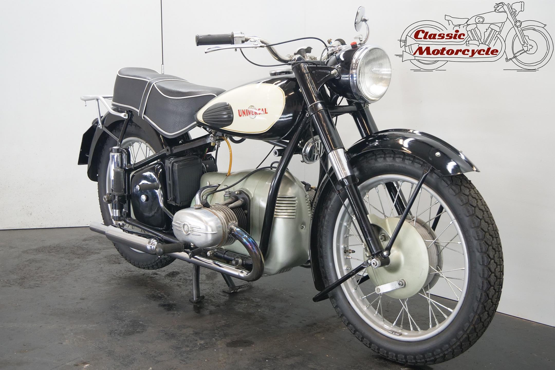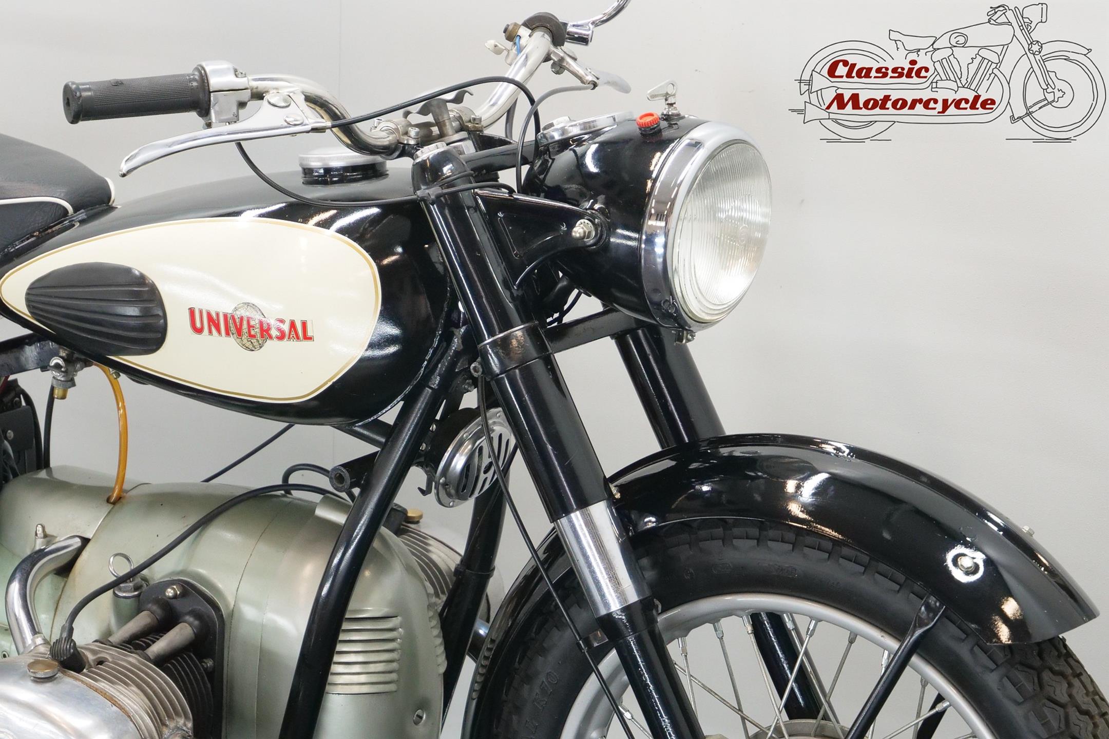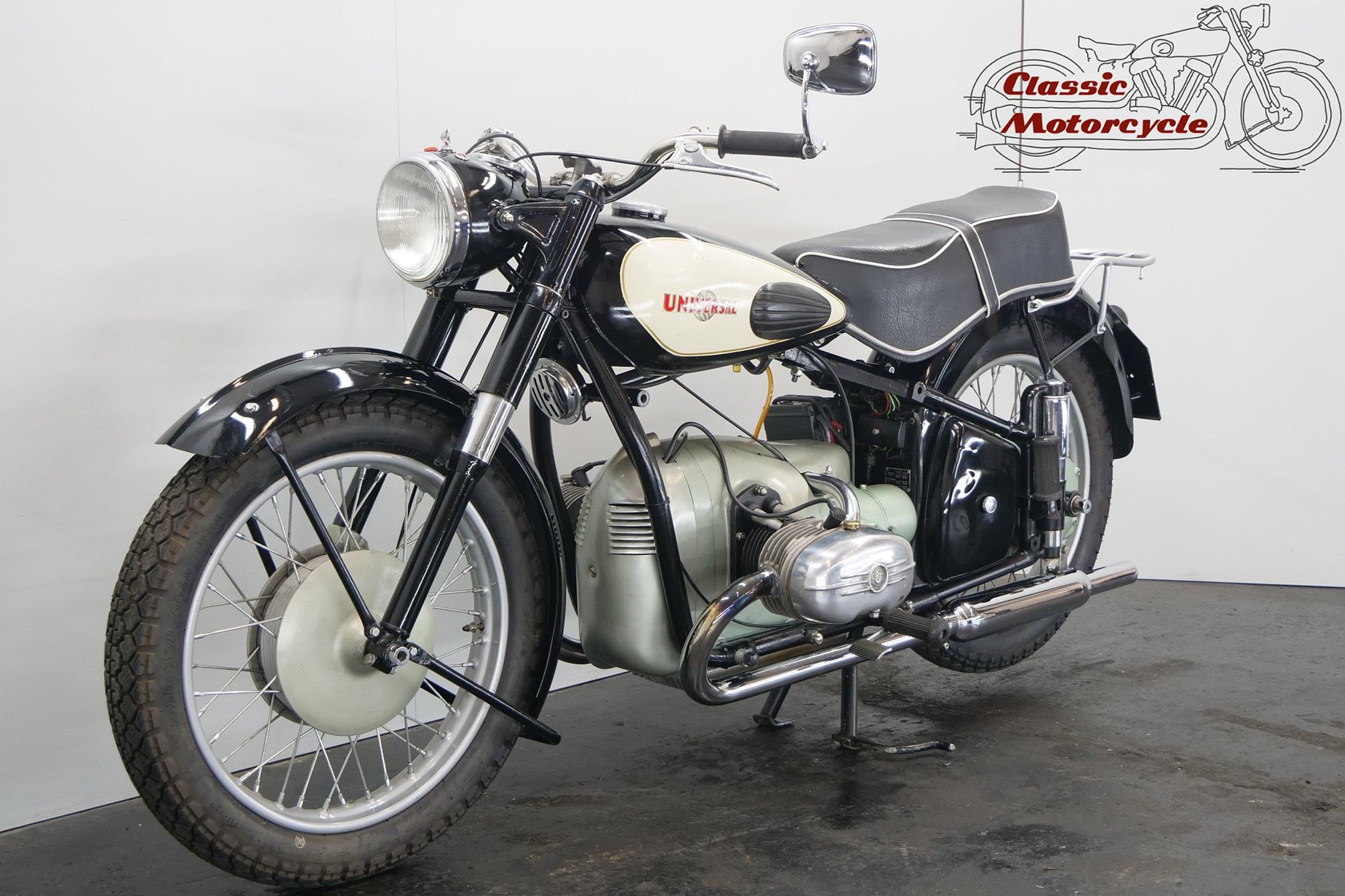 Universal motorcycles were made in Switzerland by the same factory that had previously marketed its products under the ‘Helvetia’ brand name. Established in 1928, Universal at first used proprietary engines supplied by JAP, Rudge (Python), Anzani and Ilo before getting around to making its own. At the top of the range in the 1930s were large sports models, powered by overhead-valve JAP v-twin engines, which looked every bit as handsome as their British counterparts. Universal began supplying motorcycles to the Swiss Army prior to WW2, these being mainly large, sidevalve-engined v-twins used for both solo and sidecar work, and during the war developed a range of models primarily for military use, powered by narrow-angle v-twin engines of 676cc and 990cc. After WW2 they produced a flat twin of 578cc along with a shaft-driven 250cc single. In the 1960s they had an agreement with Rabeneick to whom they supplied Universal 250cc shaft-drive engines. The company’s most memorable 578cc post-war model was B40 with sidevalve, B50 and the later 2B Meteor both with overhead valve and all with shaft-driven transverse ‘flat twin’ inspired by the BMW. Universal motorcycles were last produced in 1964.