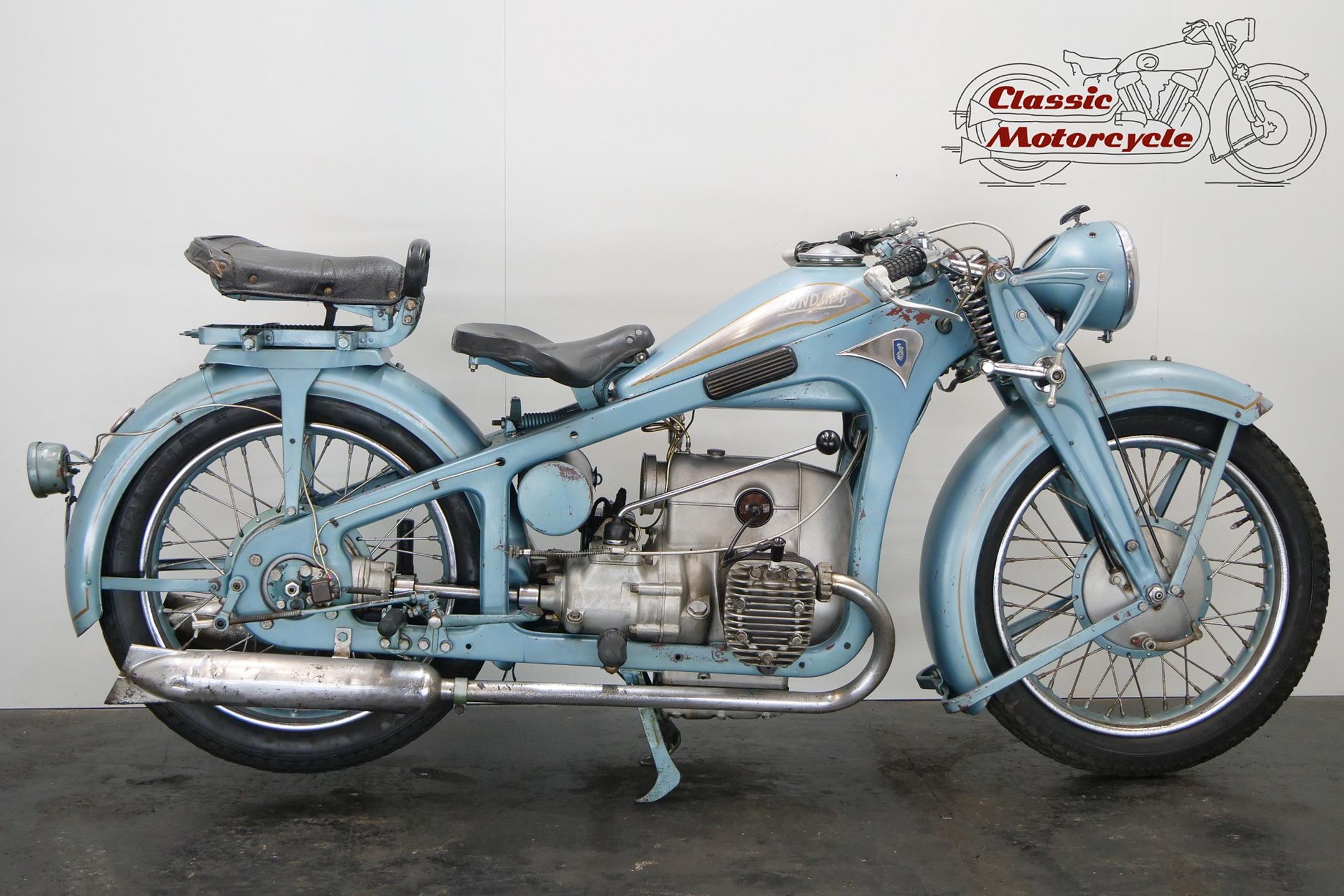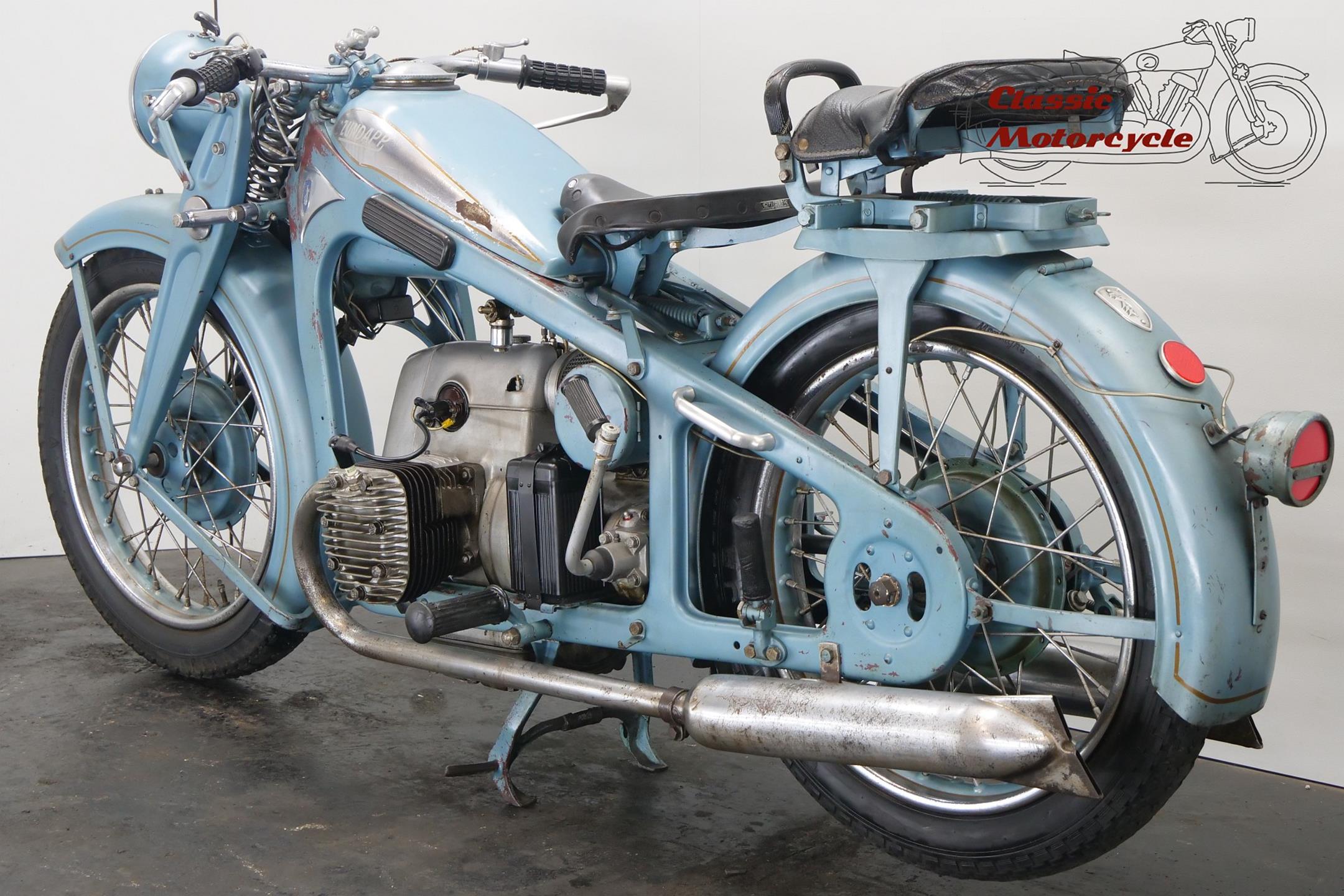 Founded at the height of WWI to manufacture armaments, Zündapp found a new role post-war as a producer of motorcycles under the direction of new owner, Dr Fritz Neumeyer, building its first machine, a Levis-powered two-stroke, in 1921. The firm began making its own engines in 1924, selling more than 10,000 machines that year, and at the Berlin Motor Show in 1933 introduced the first of the horizontally opposed, four-stroke twins that it is best remembered for. These formed part of an extensive and diverse range of models, all but the smallest two-stroke being designated by the letter 'K' (for kardan, meaning 'shaft'). Among the models premiered were the K400 and K500 sidevalve twins, both of which employed designer Richard Küchen's unconventional all-chain four-speed 'gearbox' and, as the designation suggests, shaft final drive. Introduced at the same time was another Küchen design: a horizontally opposed four made in 598cc (K600) and 798cc (K800) capacities. Common to all the larger models and eminently suited to withstanding the stresses and strains imposed by travel on unmade roads, the robust frame and girder forks were made of pressed steel, an advanced feature at the time. The new Zündapp range was an enormous success, and in September 1933 the firm produced its 100,000th machine, quite an achievement after little more than a decade as a motorcycle manufacturer.