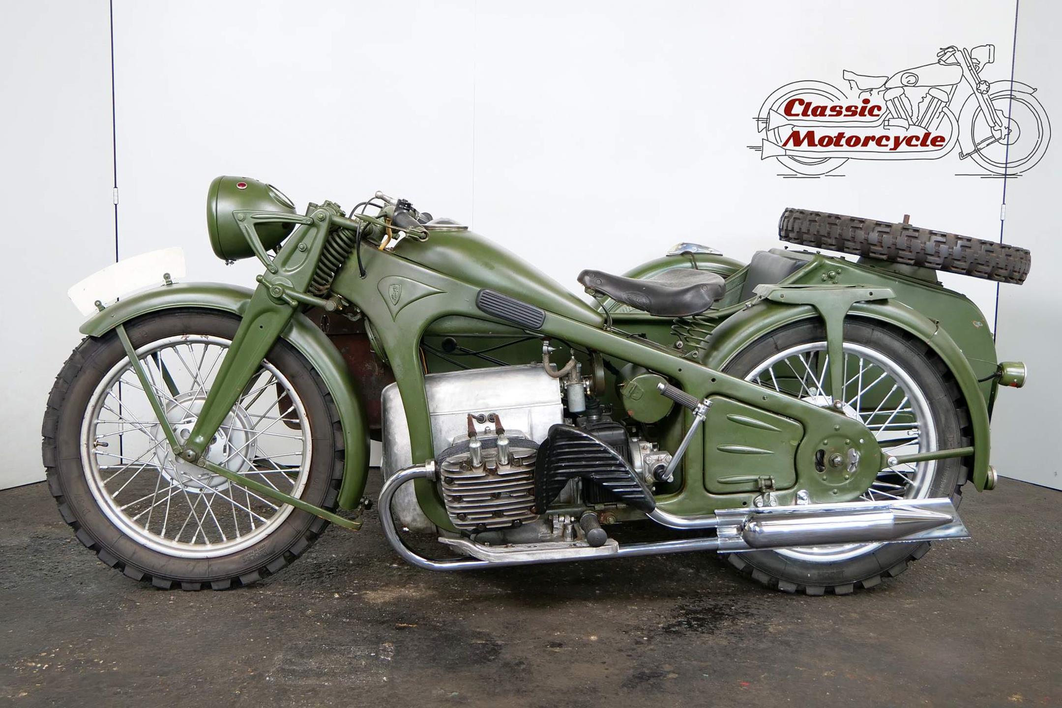 Founded at the height of WWI to manufacture armaments, Zündapp found a new role post-war as a producer of motorcycles under the direction of new owner, Dr Fritz Neumeyer, building its first machine, a Levis-powered two-stroke, in 1921. The firm began making its own engines in 1924, selling more than 10,000 machines that year, and at the Berlin Motor Show in 1933 introduced the first of the horizontally opposed, four-stroke twins that it is best remembered for. These formed part of an extensive and diverse range of models, all but the smallest two-stroke being designated by the letter 'K' (for kardan, meaning 'shaft'). Among the models premiered were the K400 and K500 sidevalve twins, both of which employed designer Richard Küchen's unconventional all-chain four-speed 'gearbox' and, as the designation suggests, shaft final drive. Introduced at the same time was another Küchen design: a horizontally opposed four made in 598cc (K600) and 798cc (K800) capacities. Common to all the larger models and eminently suited to withstanding the stresses and strains imposed by travel on unmade roads, the robust frame and girder forks were made of pressed steel, an advanced feature at the time. The new Zündapp range was an enormous success, and in September 1933 the firm produced its 100,000th machine, quite an achievement after little more than a decade as a motorcycle manufacturer. Immediately prior to the outbreak of war in September 1939, Zündapp introduced an overhead-valve twin, the KS600. The latter's 597cc engine produced 28ps, and like the rest of the larger Zündapps the KS600 featured the chain-drive 'gearbox', shaft drive, and the pressed steel frame and forks.