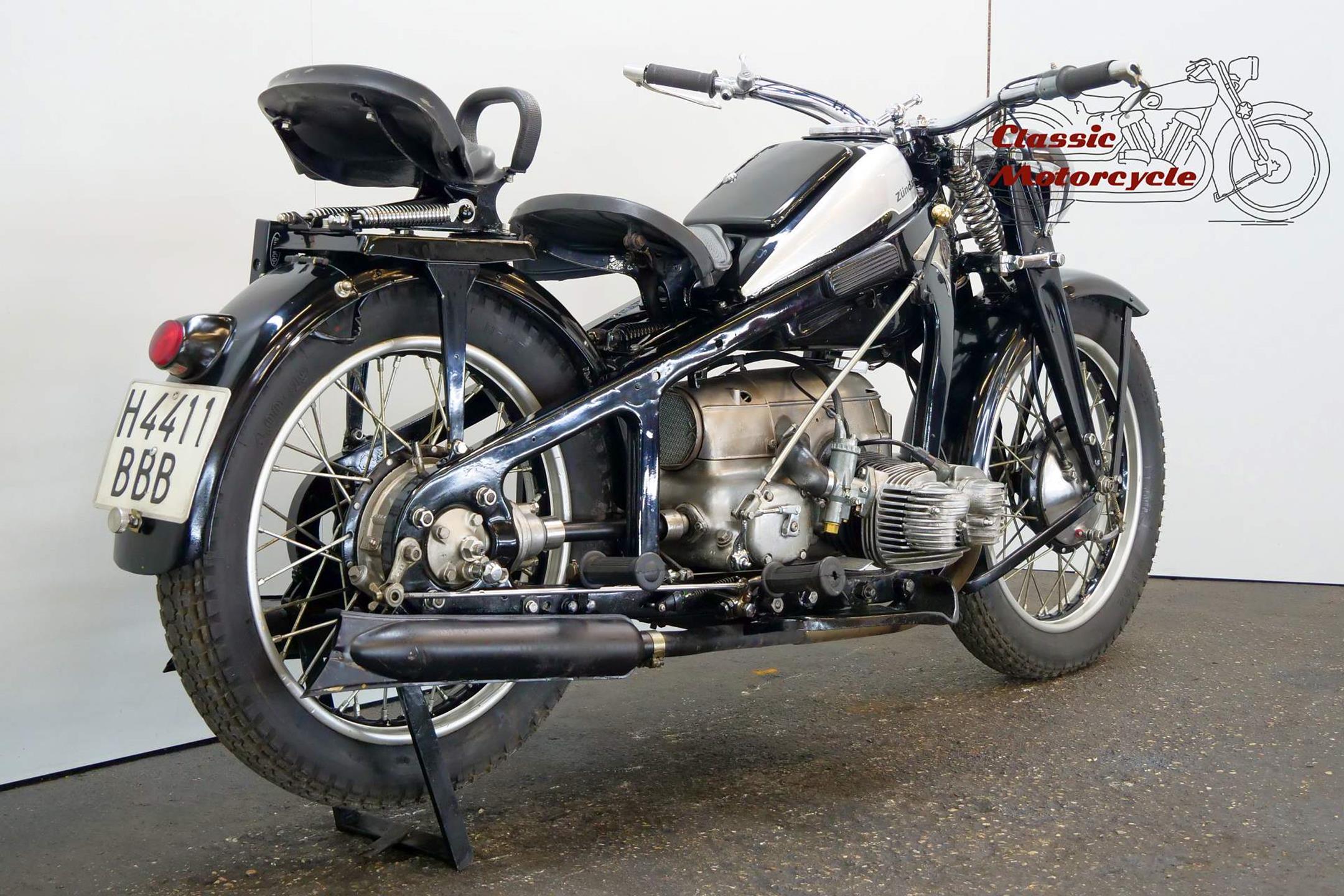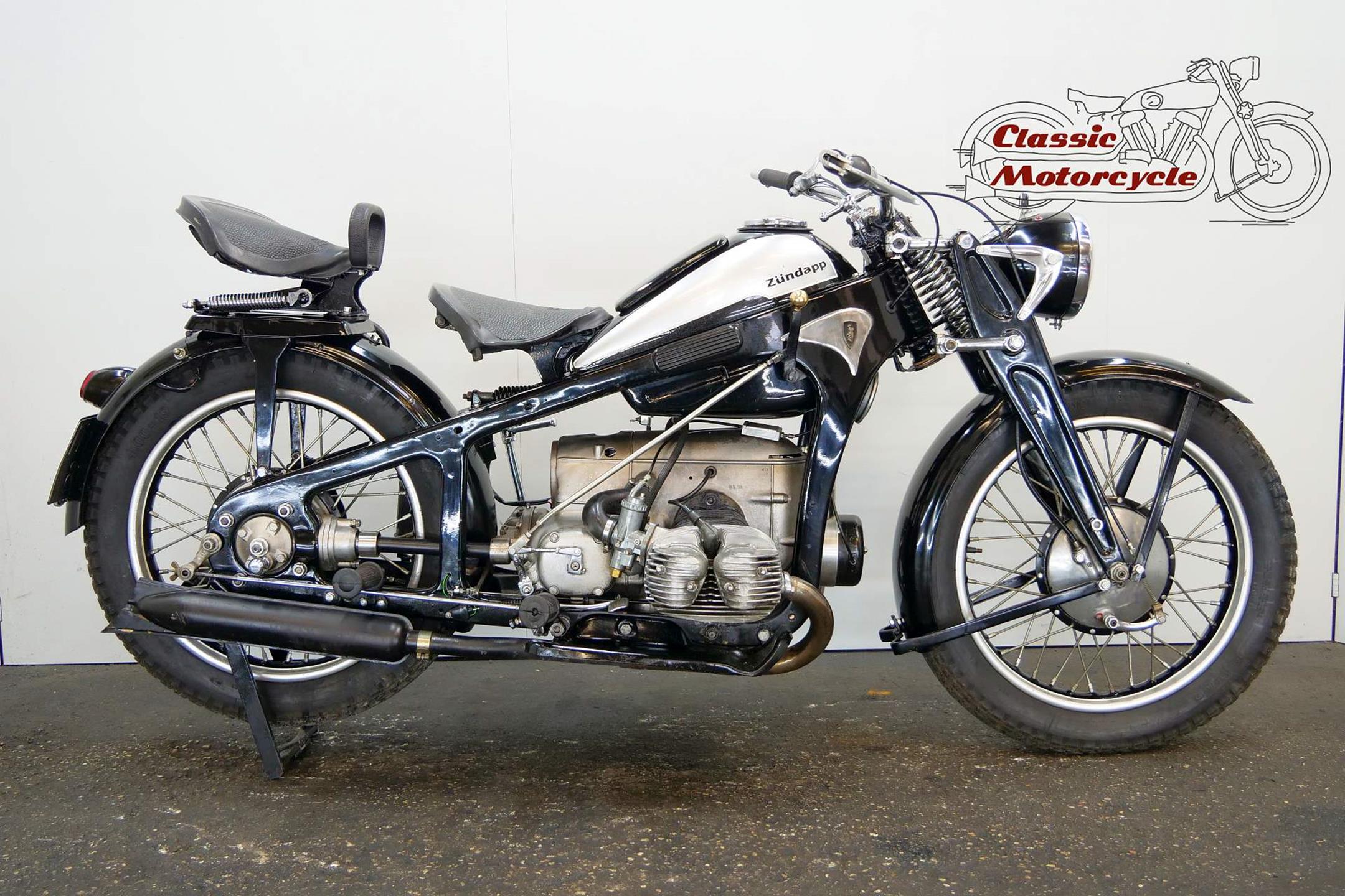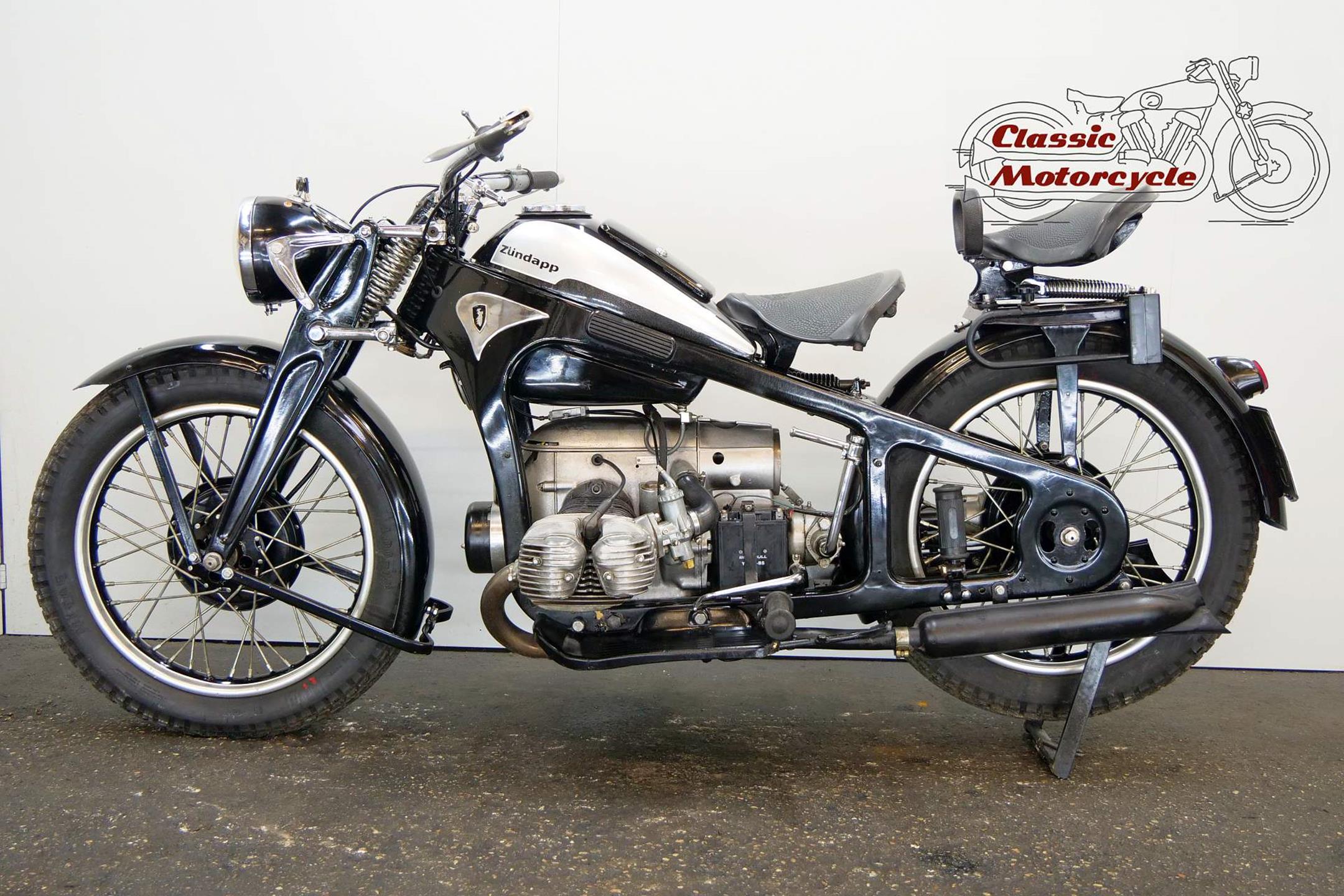 Founded at the height of WWI to manufacture armaments, Zündapp found a new role post-war as a producer of motorcycles under the direction of new owner, Dr Fritz Neumeyer, building its first machine, a Levis-powered two-stroke, in 1921. The firm began making its own engines in 1924, selling more than 10,000 machines that year, and at the Berlin Motor Show in 1933 introduced the first of the horizontally opposed, four-stroke twins that it is best remembered for. These formed part of an extensive and diverse range of models, all but the smallest two-stroke being designated by the letter 'K' (for kardan, meaning 'shaft'). Among the models premiered were the K400 and K500 sidevalve twins, both of which employed designer Richard Küchen's unconventional all-chain four-speed 'gearbox' and, as the designation suggests, shaft final drive. Introduced at the same time was another Küchen design: a horizontally opposed four made in 598cc (K600) and 798cc (K800) capacities. Common to all the larger models and eminently suited to withstanding the stresses and strains imposed by travel on unmade roads, the robust frame and girder forks were made of pressed steel, an advanced feature at the time. The new Zündapp range was an enormous success, and in September 1933 the firm produced its 100,000th machine, quite an achievement after little more than a decade as a motorcycle manufacturer. Immediately prior to the outbreak of war in September 1939, Zündapp introduced an overhead-valve twin, the KS600. The latter's 597cc engine produced 28ps, and like the rest of the larger Zündapps the KS600 featured the chain-drive 'gearbox', shaft drive, and the pressed steel frame and forks.