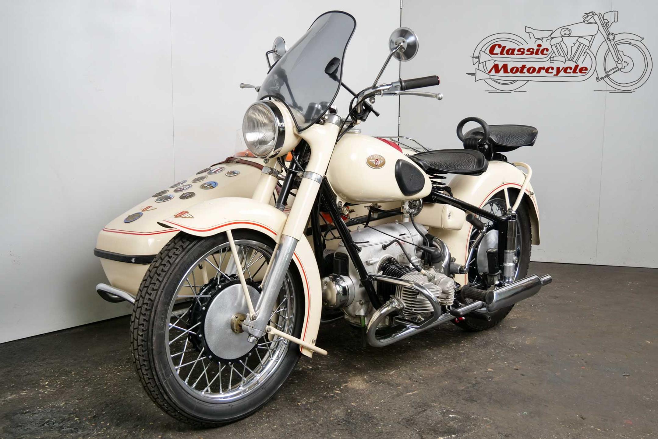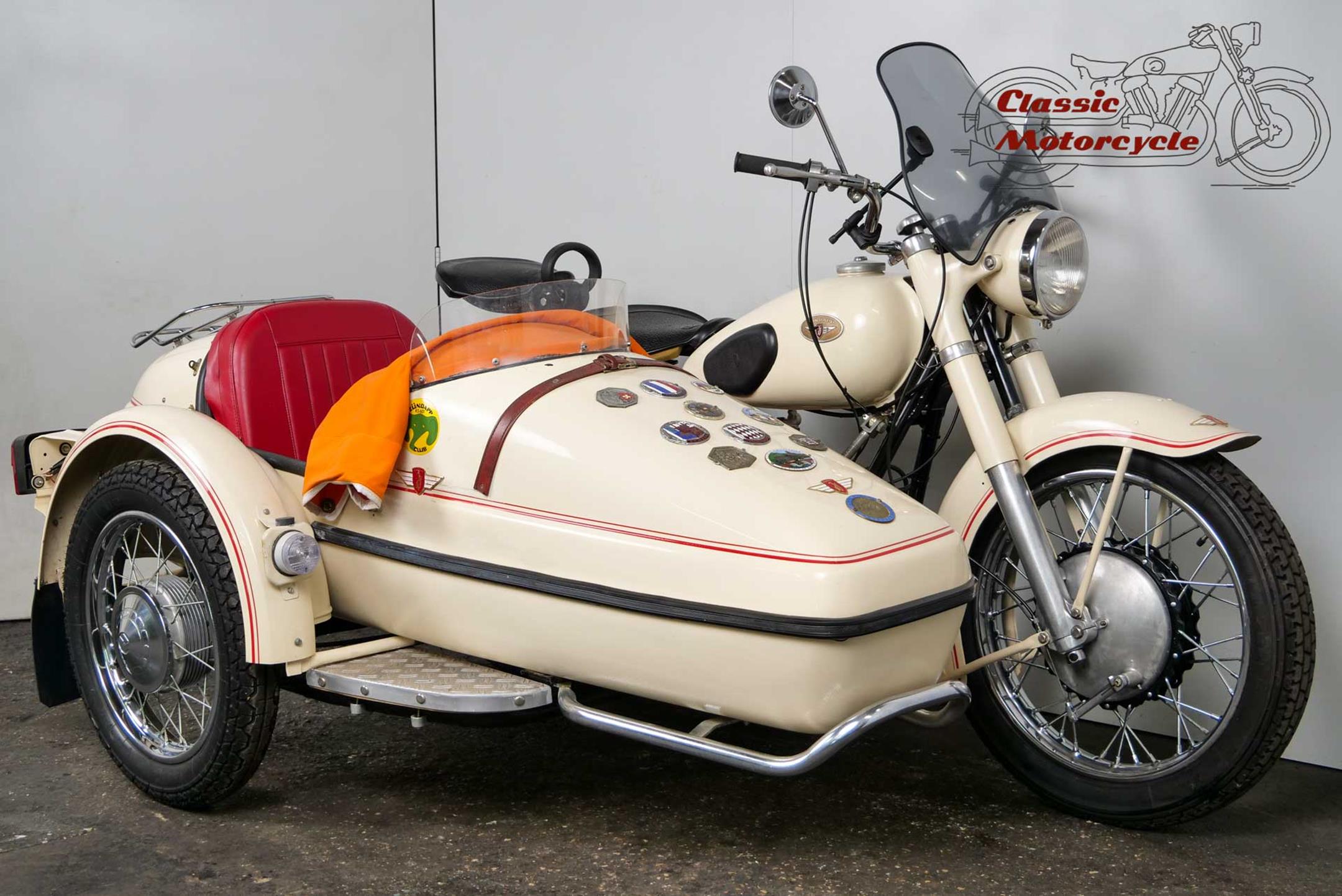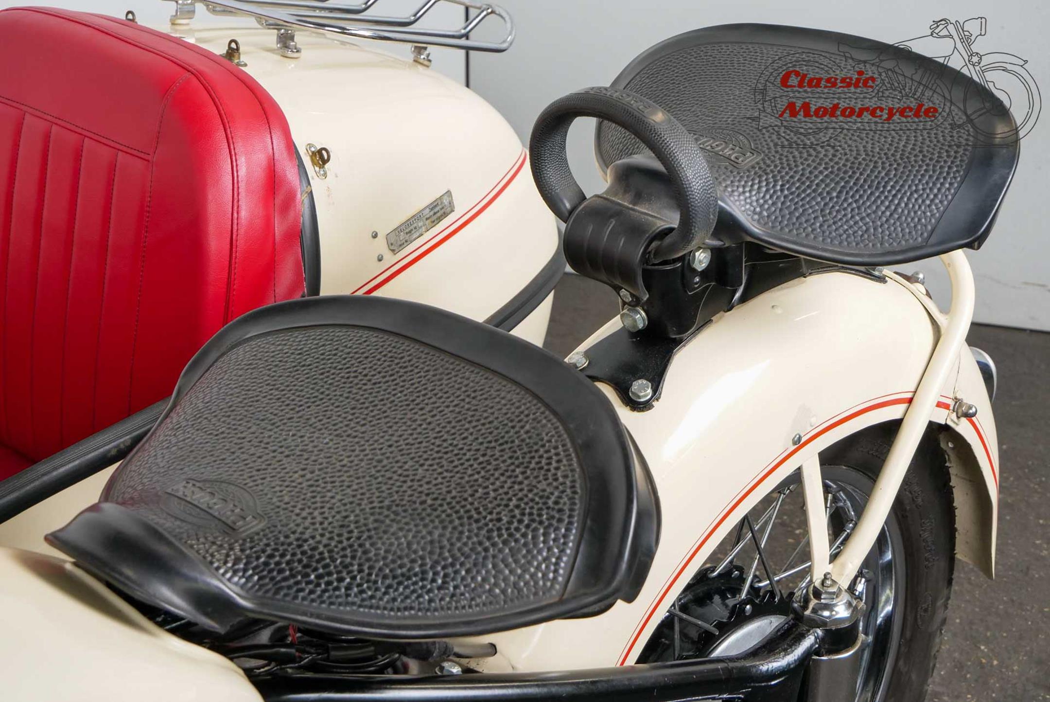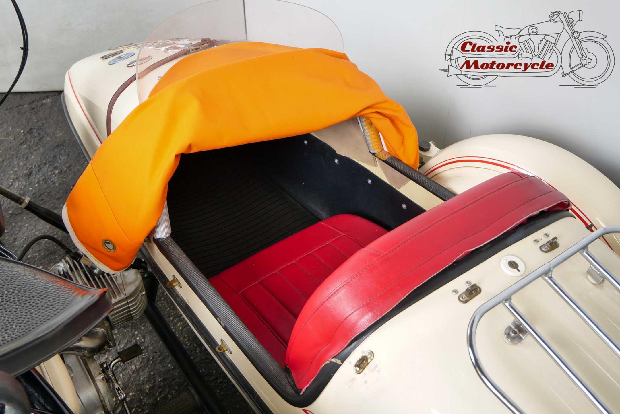 The Zündapp KS601 Sport is the successor of the proven KS600. The engine produces 32ps and is very well suited for sidecar operation. The machine was restored a few years ago and was upgraded with a Velorex sidecar model 562 in the 1990s. The original type plate matches the frame-, engine- and numbers on both cylinders. The machine is fully road ready and has papers from Germany.